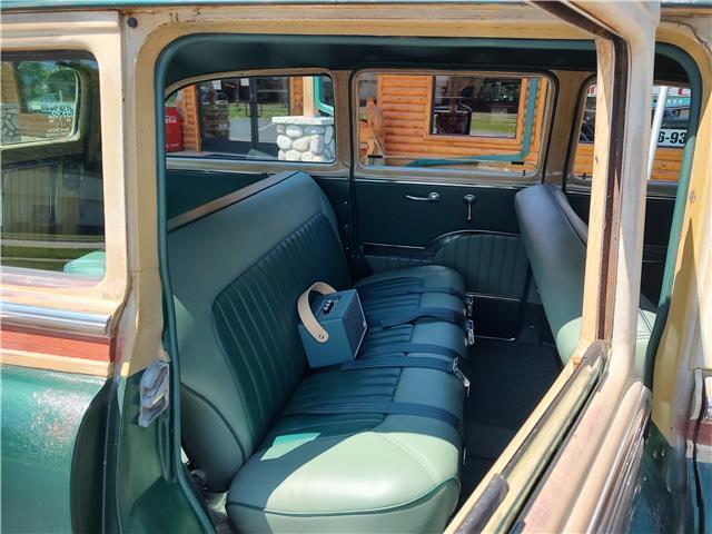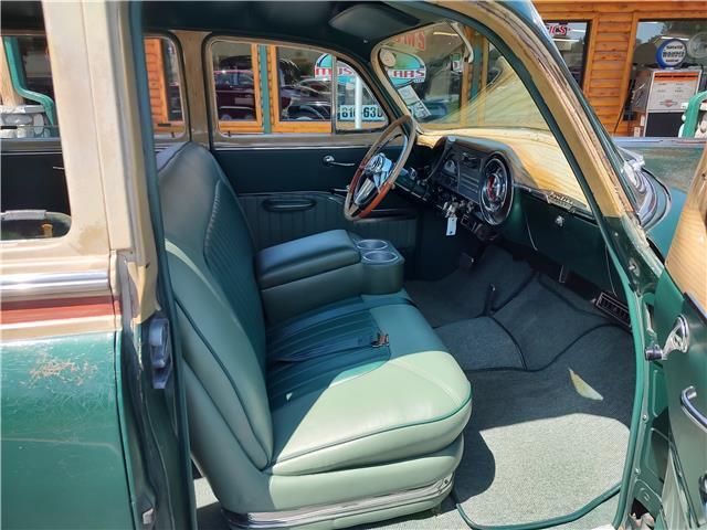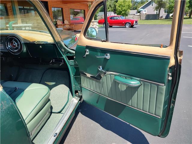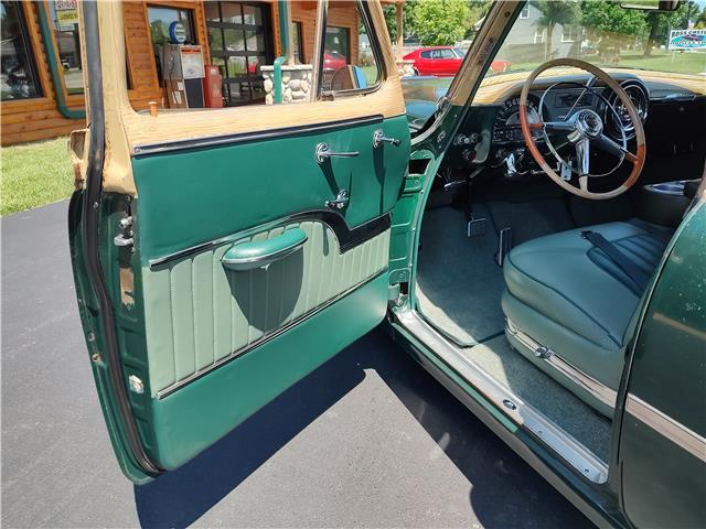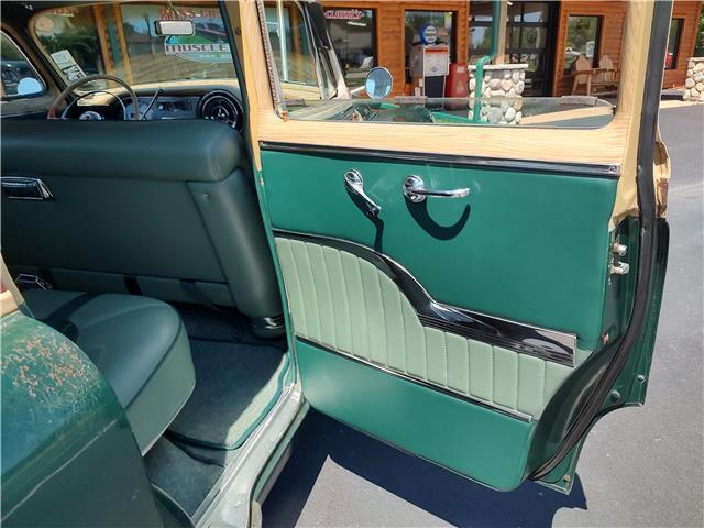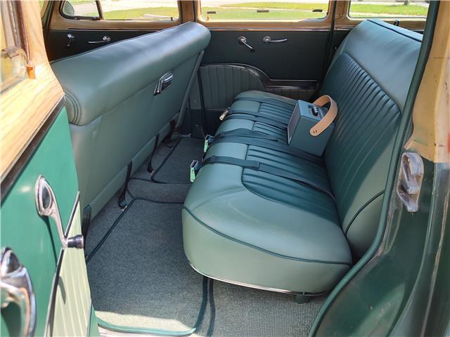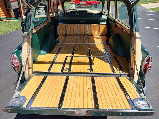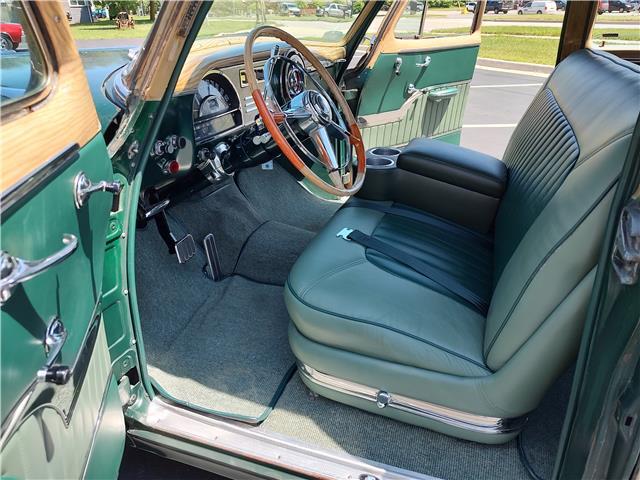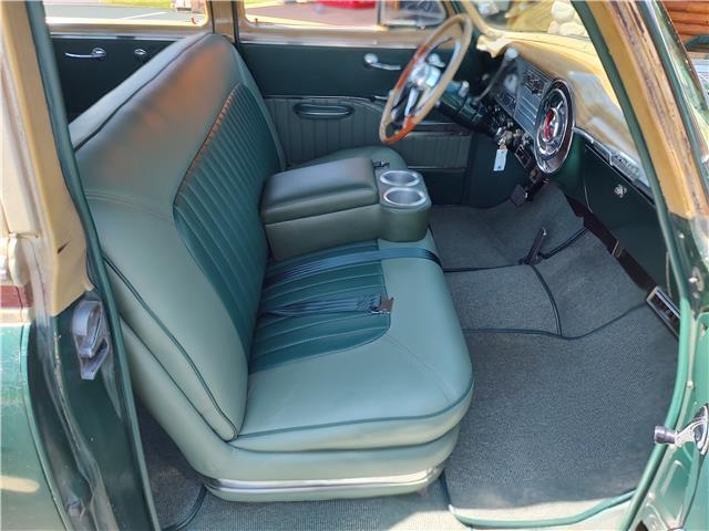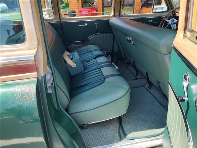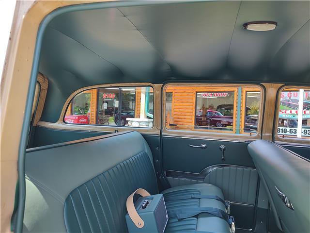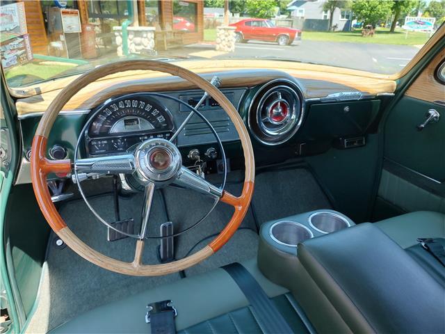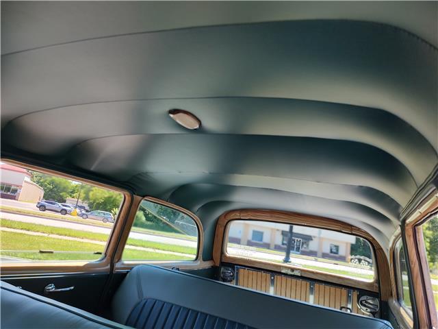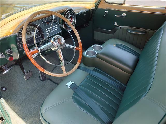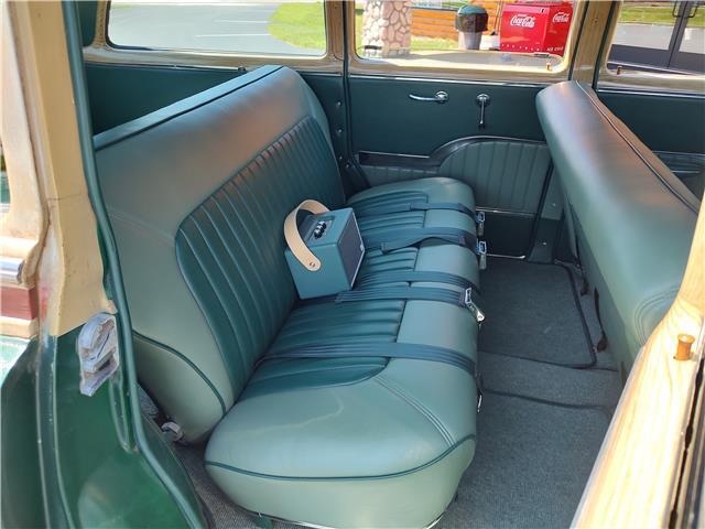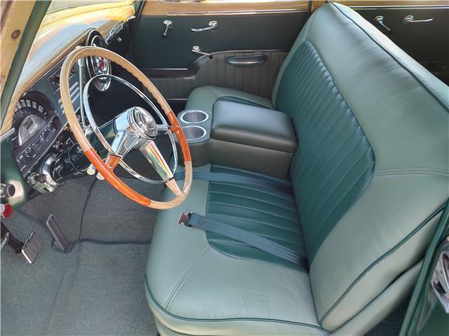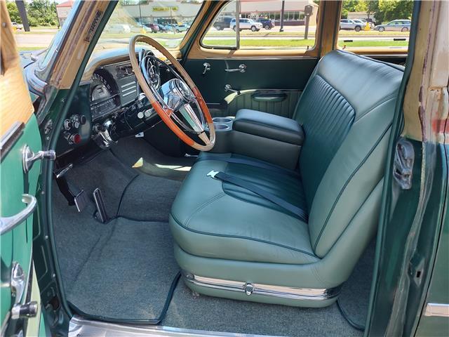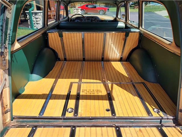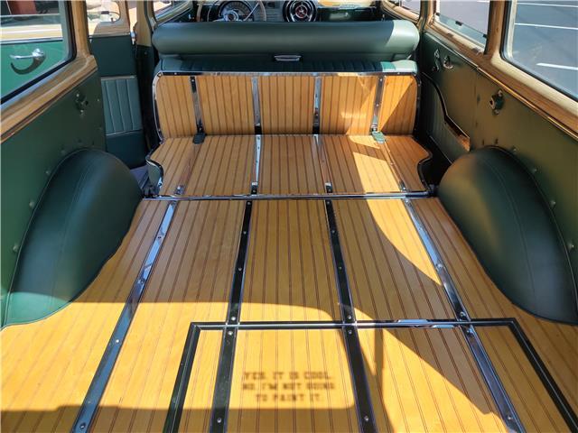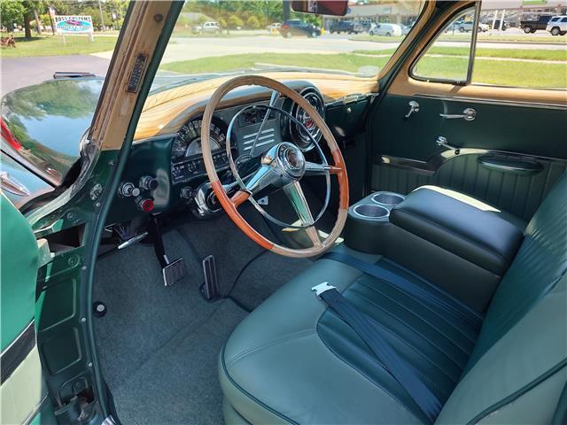 New 2 tone green custom leather interior, dash has been refinished, all dash trim is original in excellent condition, new wiring throughout, factory gauges have been reworked to work properly with the updated drive line, very nice done AC and heat controls - looks factory, AC vents nicely mounted under dash, nicely updated with IDIDIT tilt steering column with column shift; which works correctly with the 4L80E trans, recondited original steering wheel, upper dash and garnish moldings have been refinished to its factory appearing wood grain, new headliner and visors, rear cargo area stainless moldings have been re-polished, new wood; also has carpet mat, new custom door panels with factory stainless moldings front and rear, new arm rest; as well as rear side molding and wheel house covers, front and rear seats have been redone; rear seat folds down, front and rear seat belts, removable Bluetooth speaker box which is done to match, new carpet and custom floor mats, original sill plates in excellent condition.