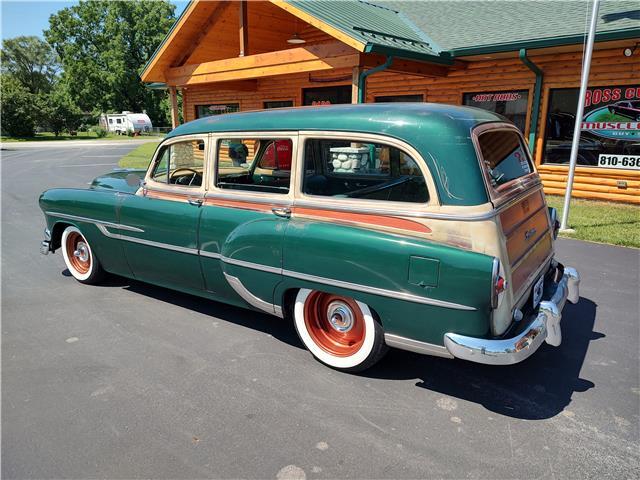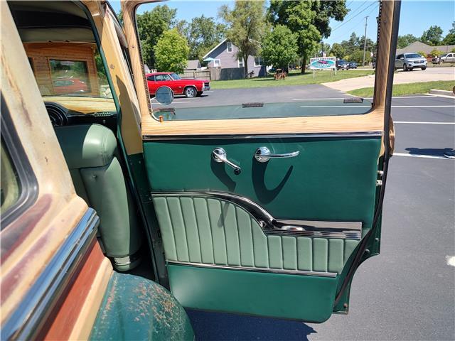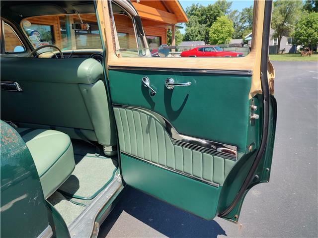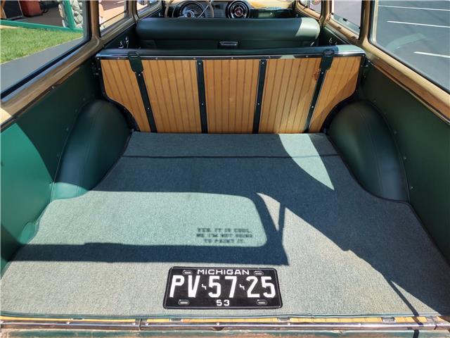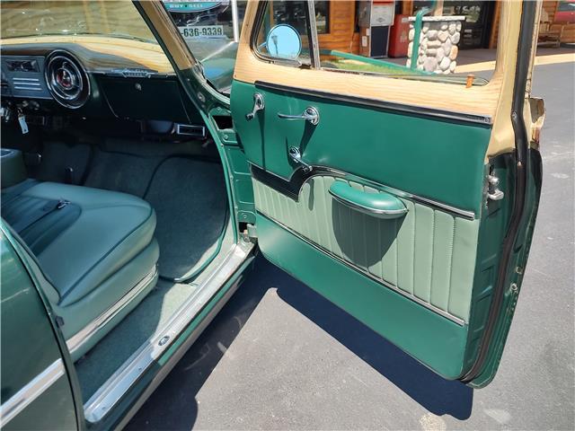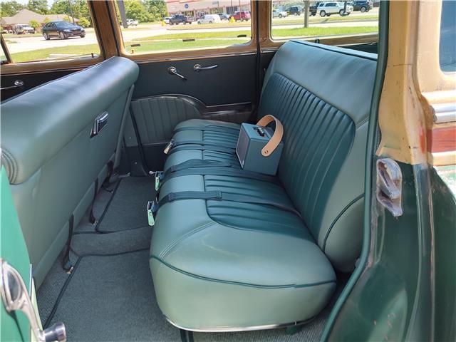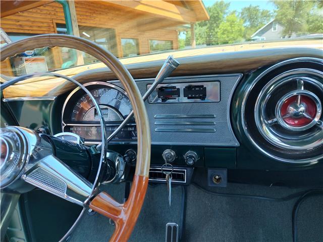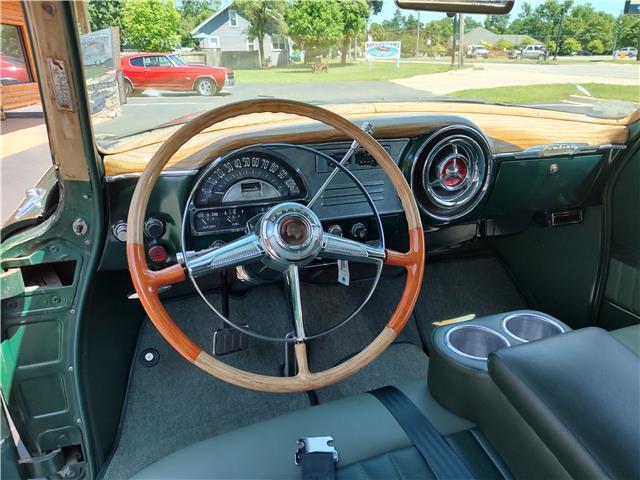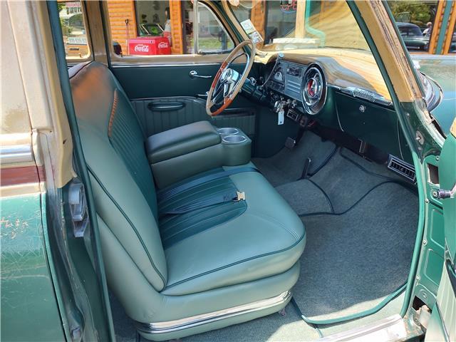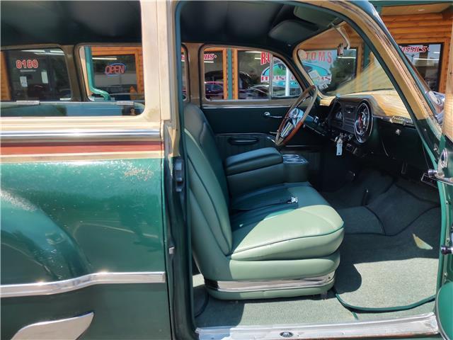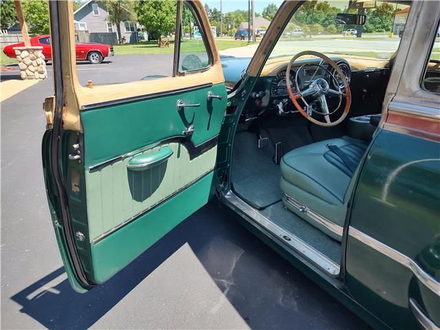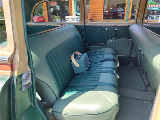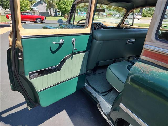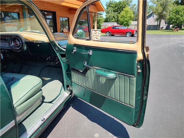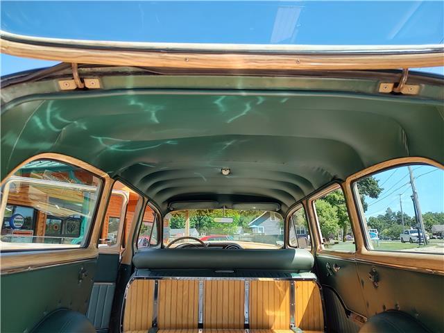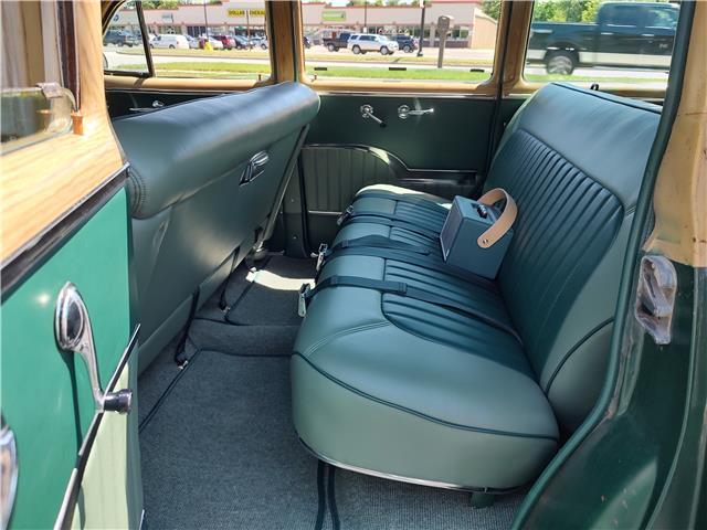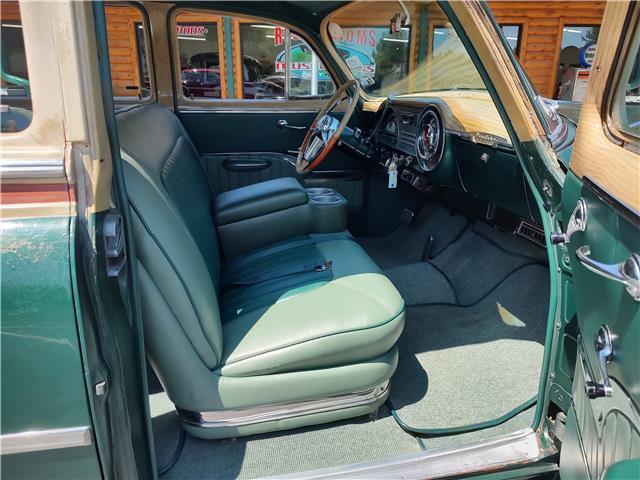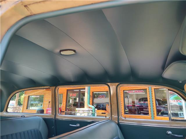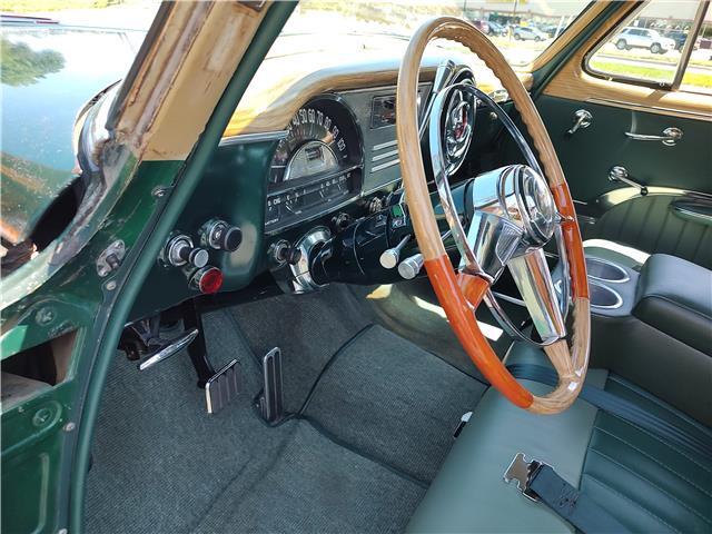 New 2 tone green custom leather interior, dash has been refinished, all dash trim is original in excellent condition, new wiring throughout, factory gauges have been reworked to work properly with the updated drive line, very nice done AC and heat controls - looks factory, AC vents nicely mounted under dash, nicely updated with IDIDIT tilt steering column with column shift; which works correctly with the 4L80E trans, recondited original steering wheel, upper dash and garnish moldings have been refinished to its factory appearing wood grain, new headliner and visors, rear cargo area stainless moldings have been re-polished, new wood; also has carpet mat, new custom door panels with factory stainless moldings front and rear, new arm rest; as well as rear side molding and wheel house covers, front and rear seats have been redone; rear seat folds down, front and rear seat belts, removable Bluetooth speaker box which is done to match, new carpet and custom floor mats, original sill plates in excellent condition.