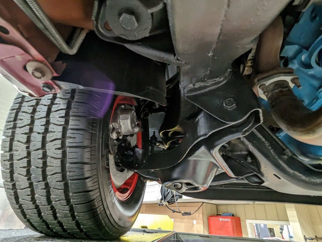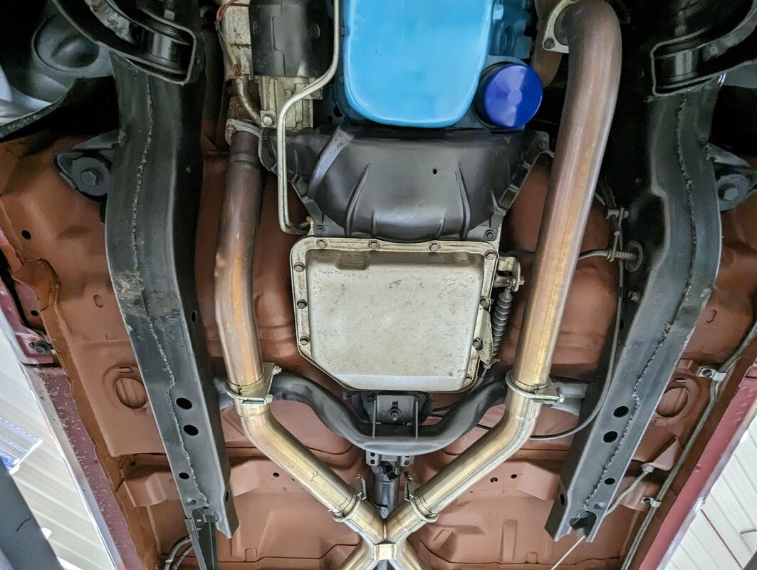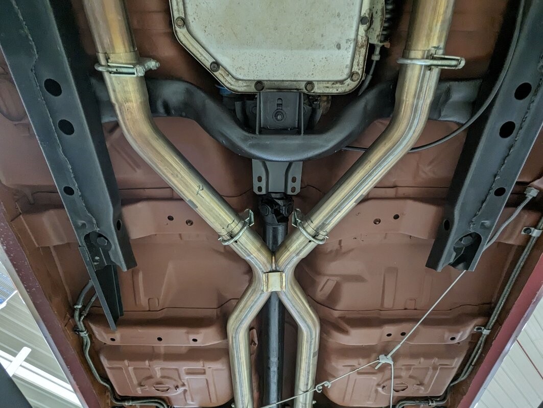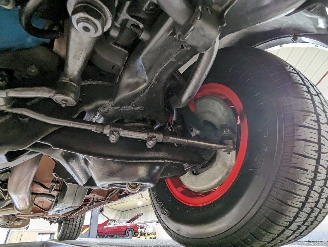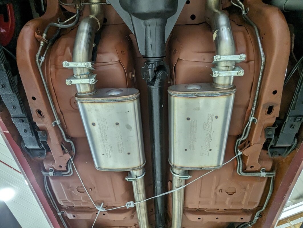 UNDERSIDE: Underneath looks like a rotisserie restoration. Actually, it is original with some maintenance and painstakingly careful detailing! All the steering and suspension is in excellent shape, the shocks have been replaced. It has disc in front, the calipers look to have been replaced. The lines and e-brake cables are clean. The exhaust system has recently been upgraded with a custom Pypes stainless dual exhaust that has an x-pipe and Turbo Pro mufflers. The exhaust exits behind the rear wheels through a pair of chrome splitter exhaust tips. The gas tank and fuel lines have a fresh look to them. Looking up at the motor and everything looks sharp with crisp blue paint and no visible leaks. The Turbo 350 transmission looks fantastic with no leaks as well. The 10 bolt rear end looks great with smooth black paint applied. The frame is solid and has been freshened up with satin black paint. The floors are solid and rust free, they were carefully freshened with a coat of factory style red oxide primer. What a great looking mostly original underbody!