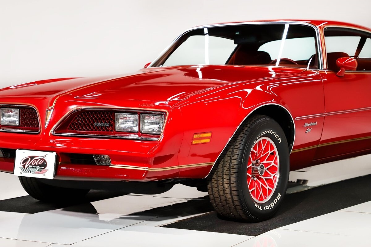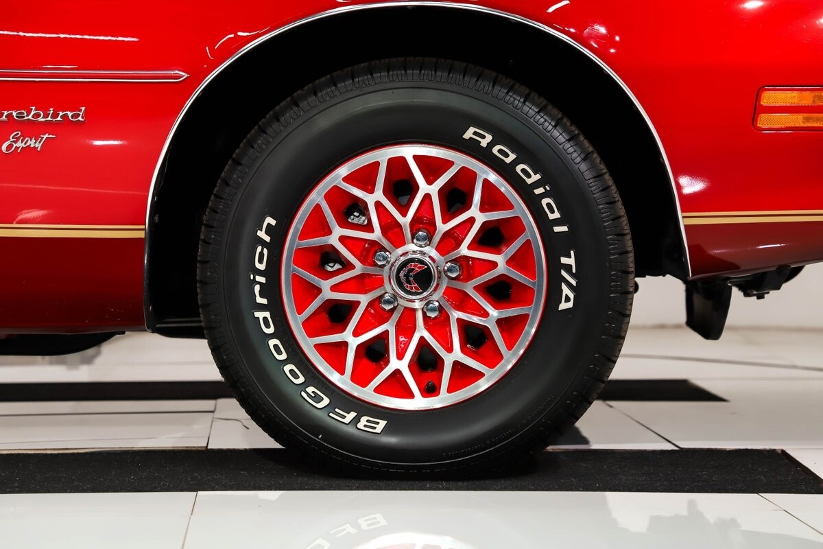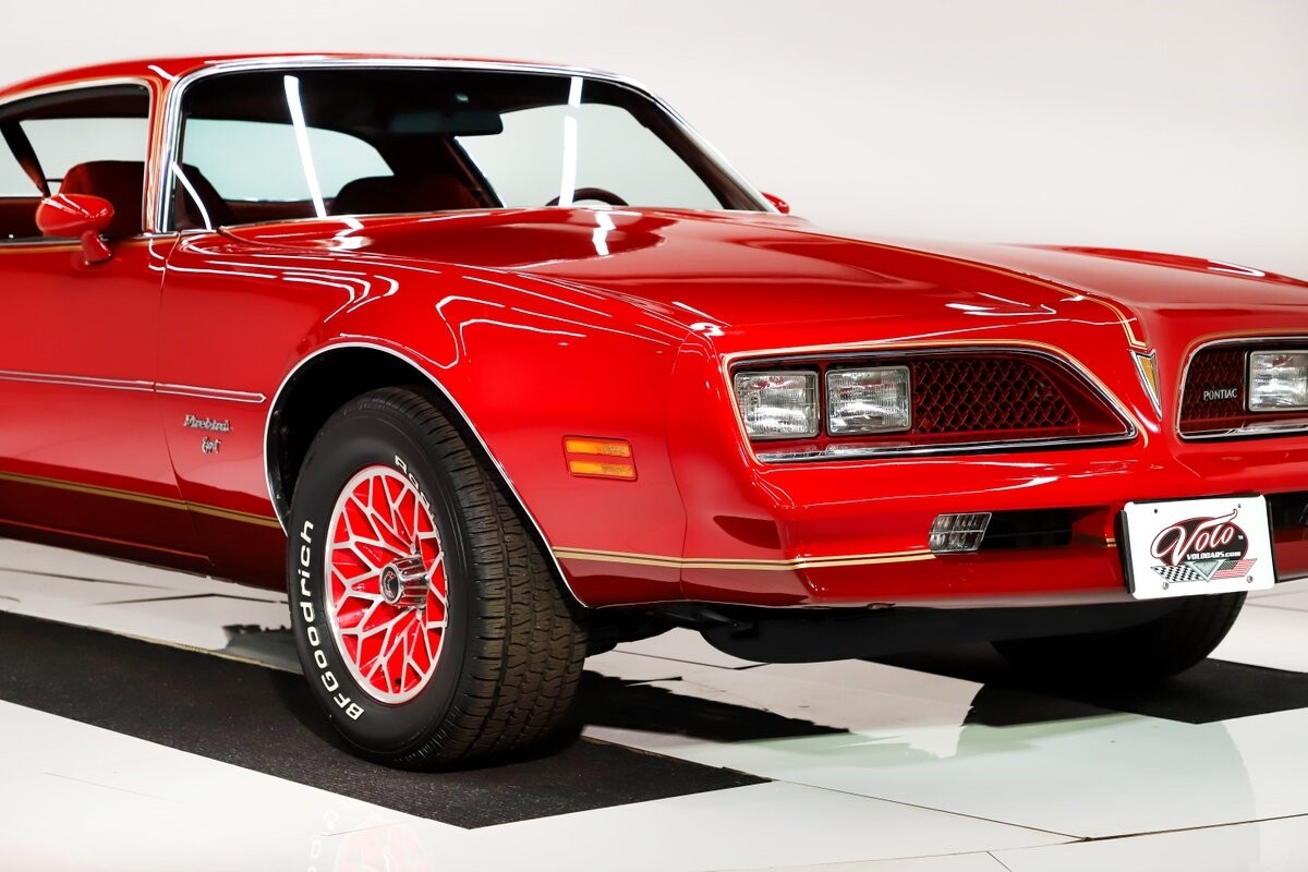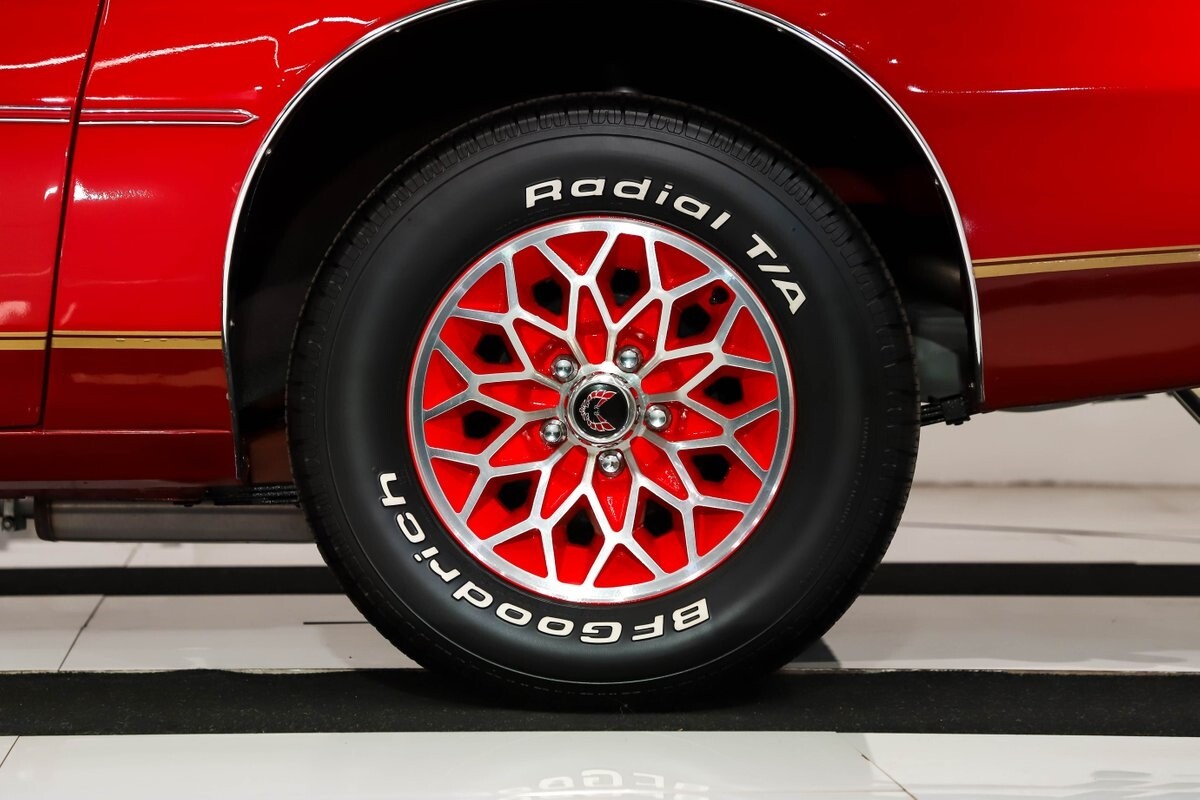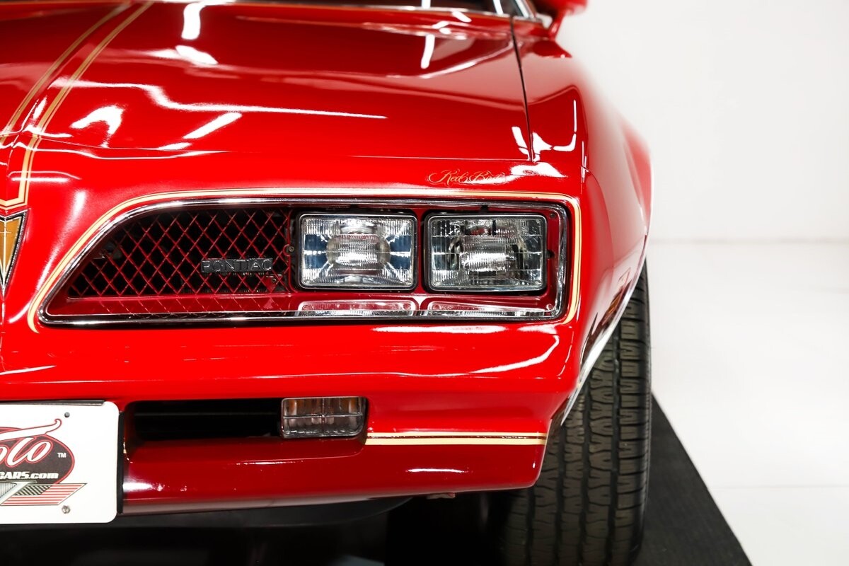 EXTERIOR: Redbird unique features: Roman Red (which wasn't available on any other 78 Firebird) with Redbird red lower accent. It also features gold striping, red grills and red snowflake wheels. The exterior of this car is great! It has all original sheet metal in place and is straight. The rubber bumpers are excellent. The doors do not sag and easily open and close like a new car. It is still wearing some original paint and some touch up. Overall, it looks beautiful, smooth, and glossy. It does have some mild checking on the 1/4s. The gold striping and graphics are in excellent shape. The original 15 inch snowflake rims have been professionally powder coated inside and out and are wrapped in virtually brand new BF Goodrich radial T/A tires. The original glass including the windshield is crystal clear. All the chrome, trim, lenses and weatherstrips are excellent. This survivor is sure to be adorned and respected by Pontiac enthusiasts wherever you go!