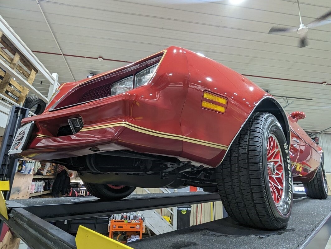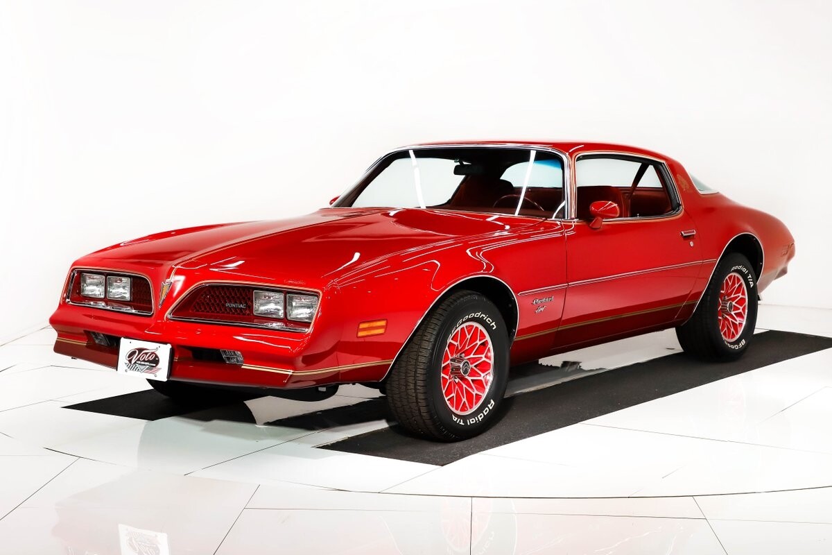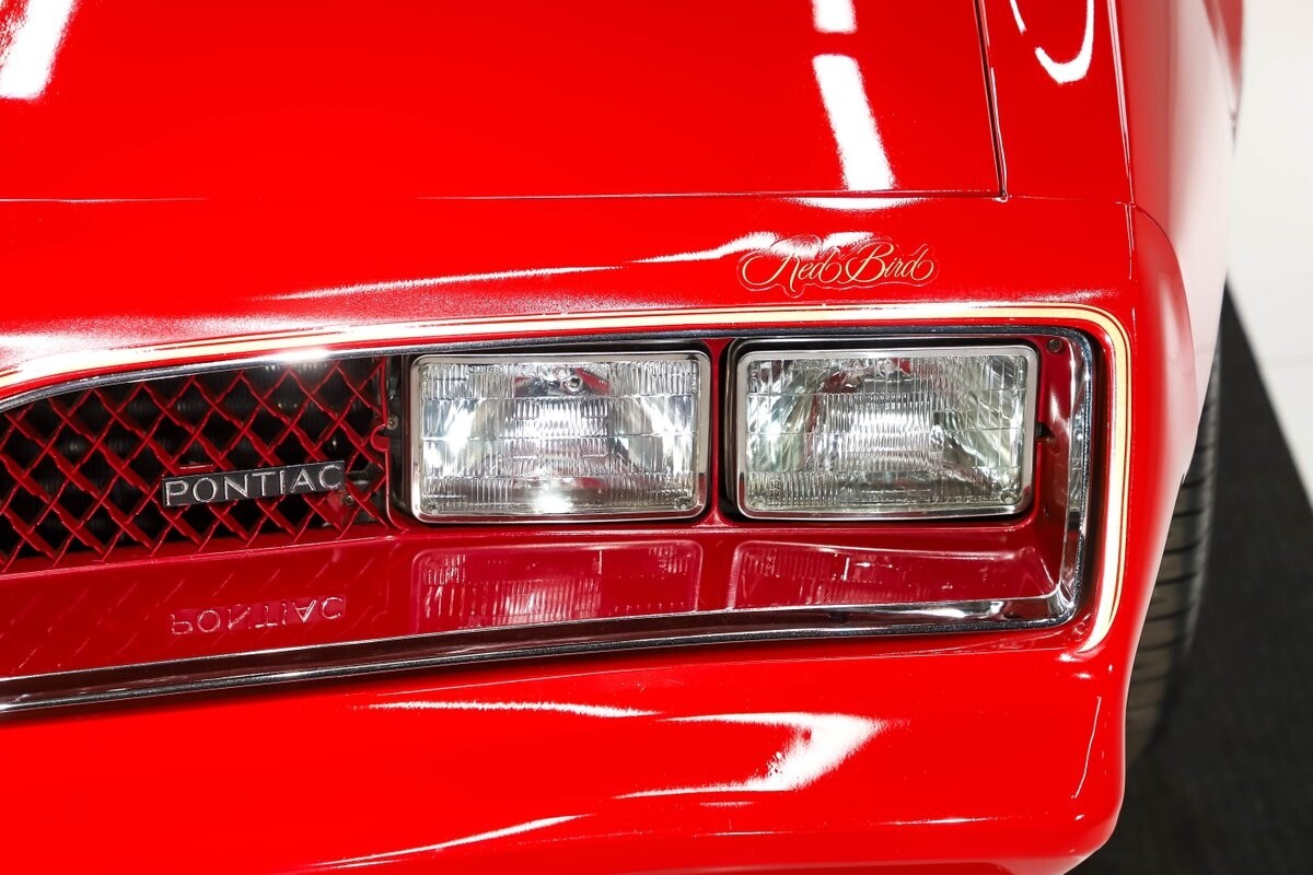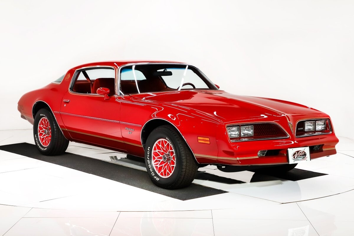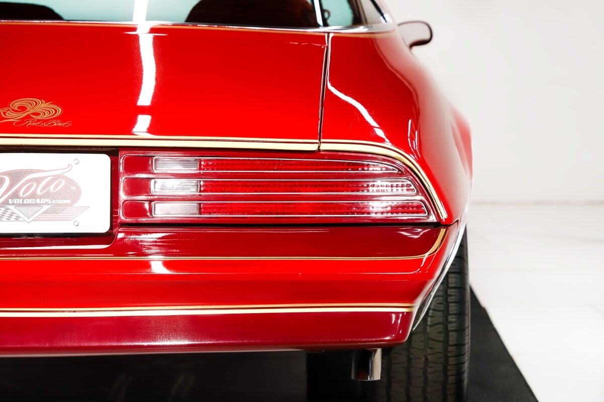 EXTERIOR: Redbird unique features: Roman Red (which wasn't available on any other 78 Firebird) with Redbird red lower accent. It also features gold striping, red grills and red snowflake wheels. The exterior of this car is great! It has all original sheet metal in place and is straight. The rubber bumpers are excellent. The doors do not sag and easily open and close like a new car. It is still wearing some original paint and some touch up. Overall, it looks beautiful, smooth, and glossy. It does have some mild checking on the 1/4s. The gold striping and graphics are in excellent shape. The original 15 inch snowflake rims have been professionally powder coated inside and out and are wrapped in virtually brand new BF Goodrich radial T/A tires. The original glass including the windshield is crystal clear. All the chrome, trim, lenses and weatherstrips are excellent. This survivor is sure to be adorned and respected by Pontiac enthusiasts wherever you go!