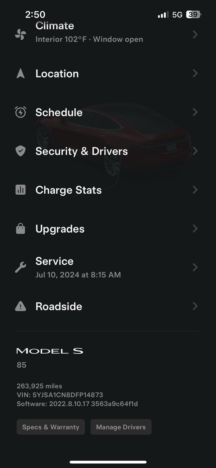 Introducing a 2013 Tesla Model S that has been owned by the same owner for 5 years. The car has been driven regularly and is in great shape with a clean title. The exterior is painted in a vibrant red color that is sure to turn heads. This vehicle has a high mileage of 263925, but it doesn't affect its drivability or performance. The interior is spacious and comfortable, making it a great daily driver. This car is perfect for anyone looking for a reliable vehicle that is also eco-friendly. Don't miss out on the chance to own this original Tesla Model S. Contact us now to schedule a test drive.Seller's Notes