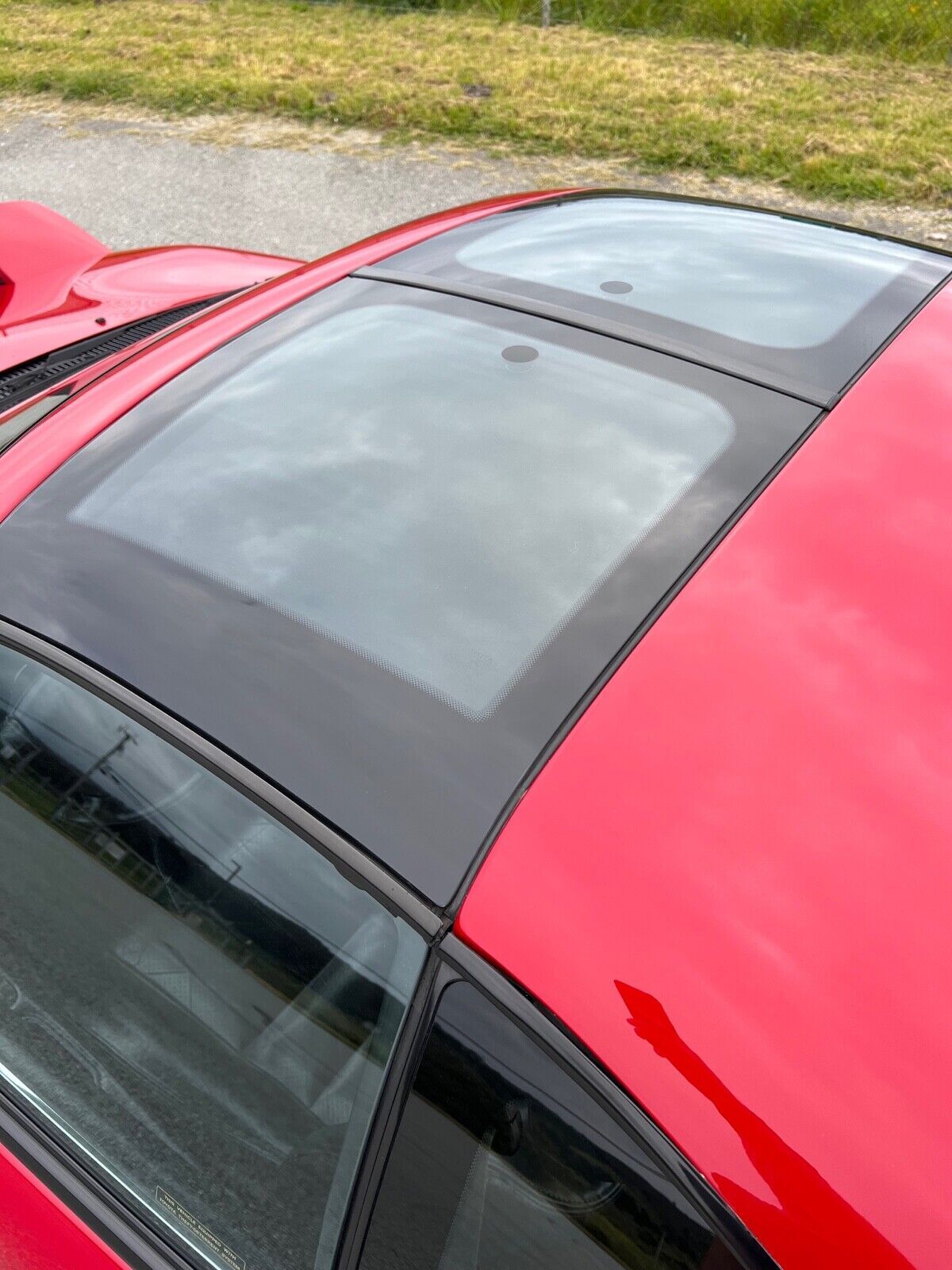 The exterior is finished in Crimson Red (3J6) and features fog lights, pop-up headlamps, side scoops, removable glass T-top roof panels, dual exhaust outlets, and an integrated rear wing.