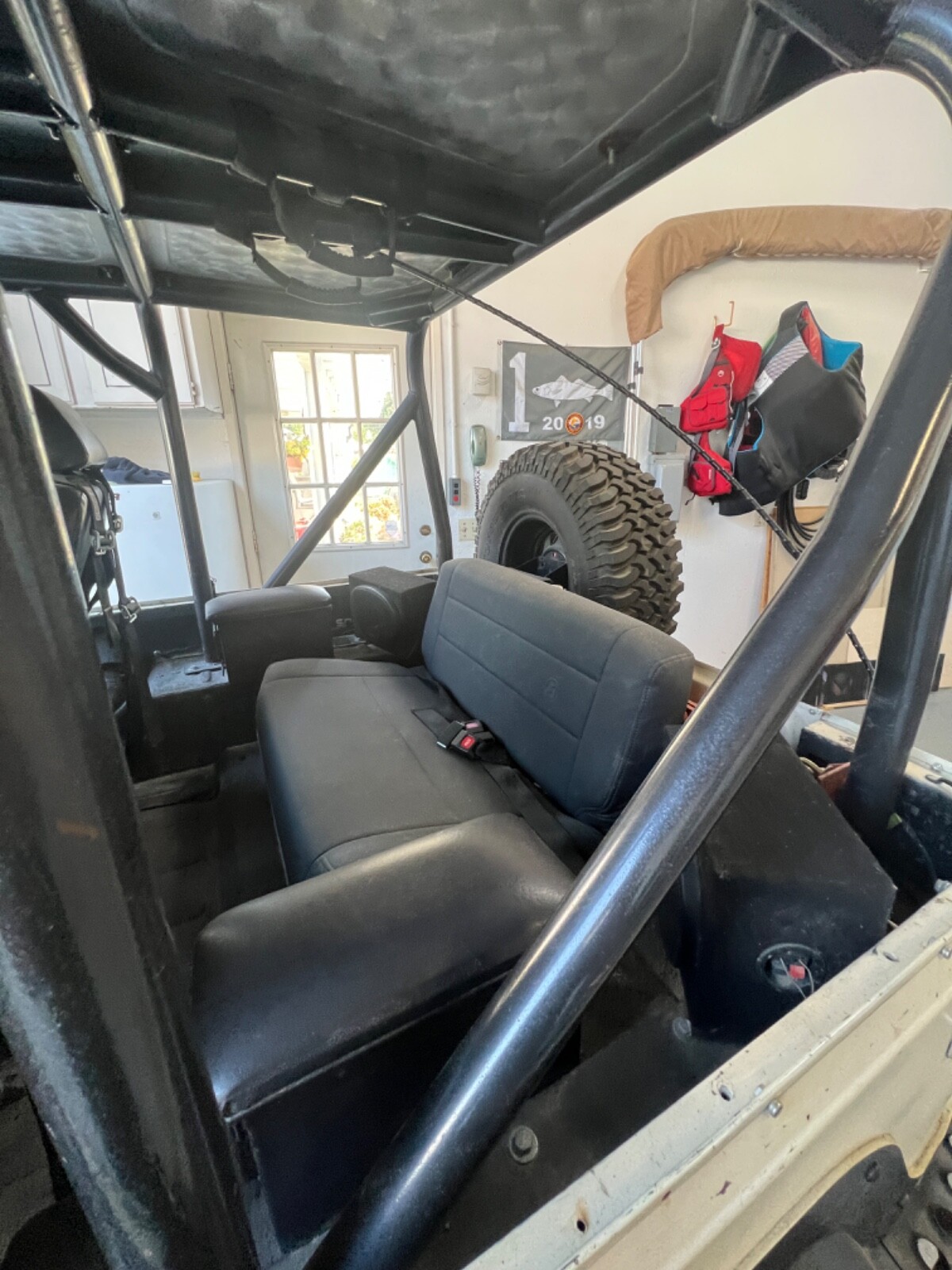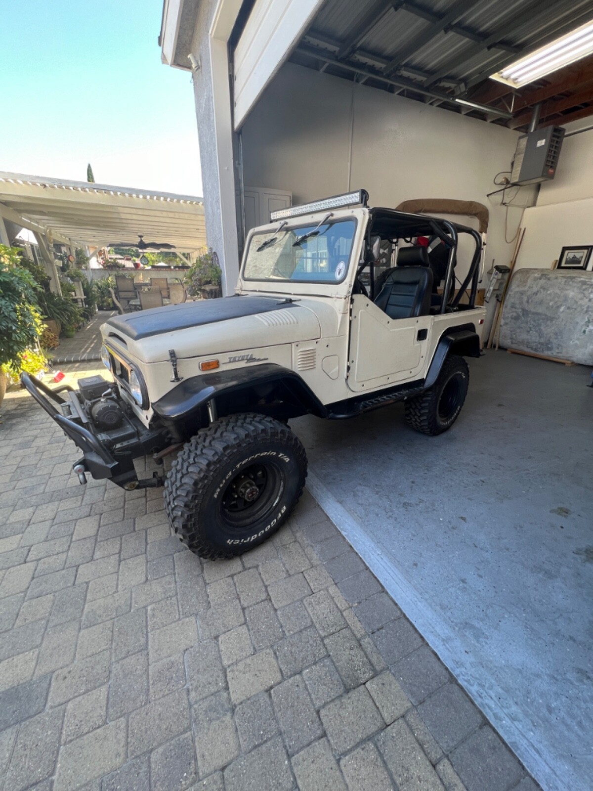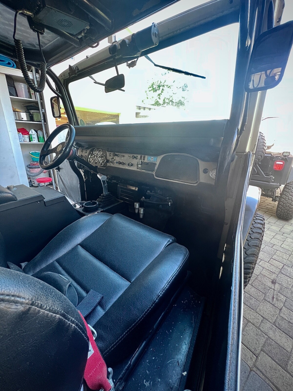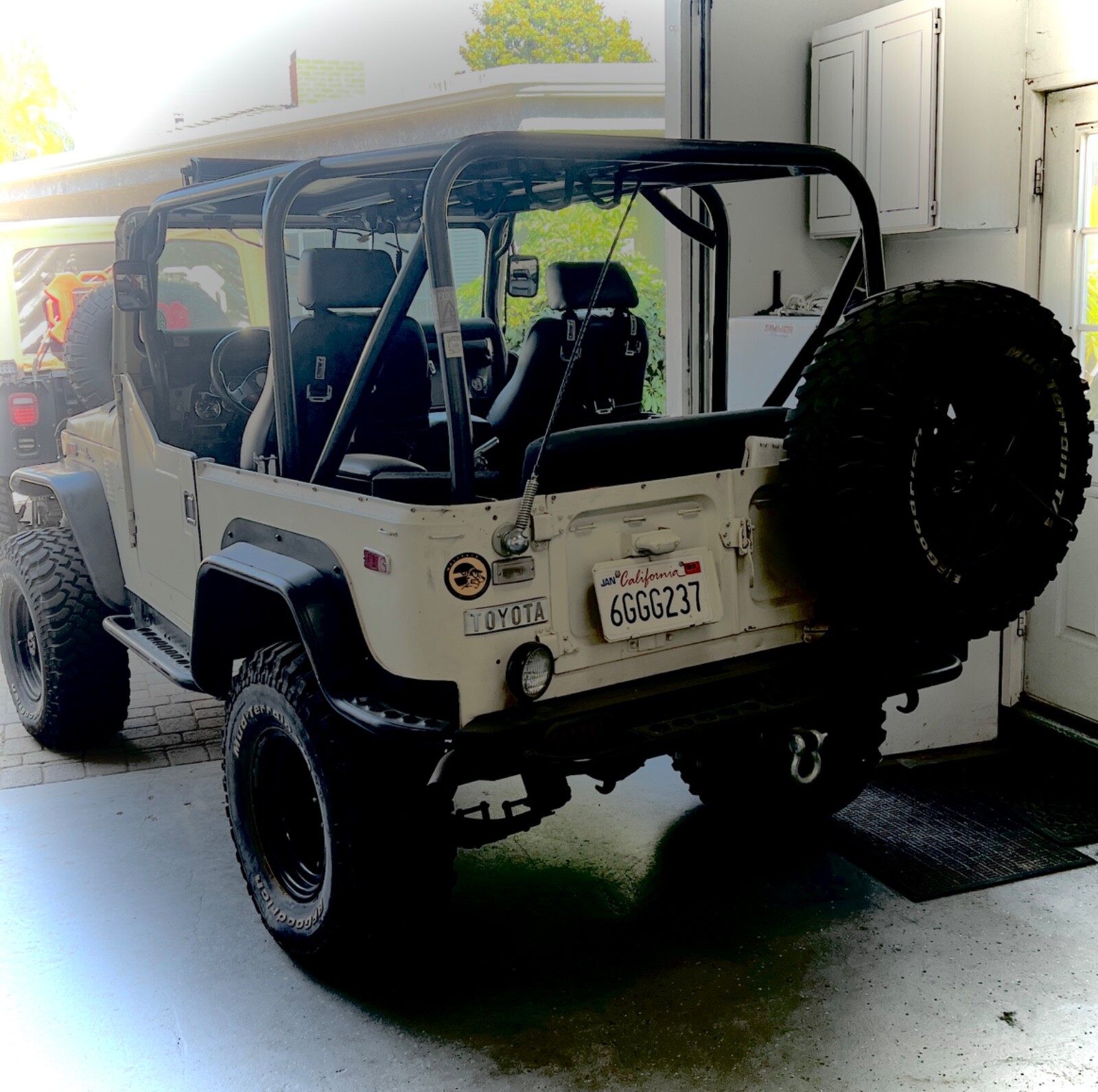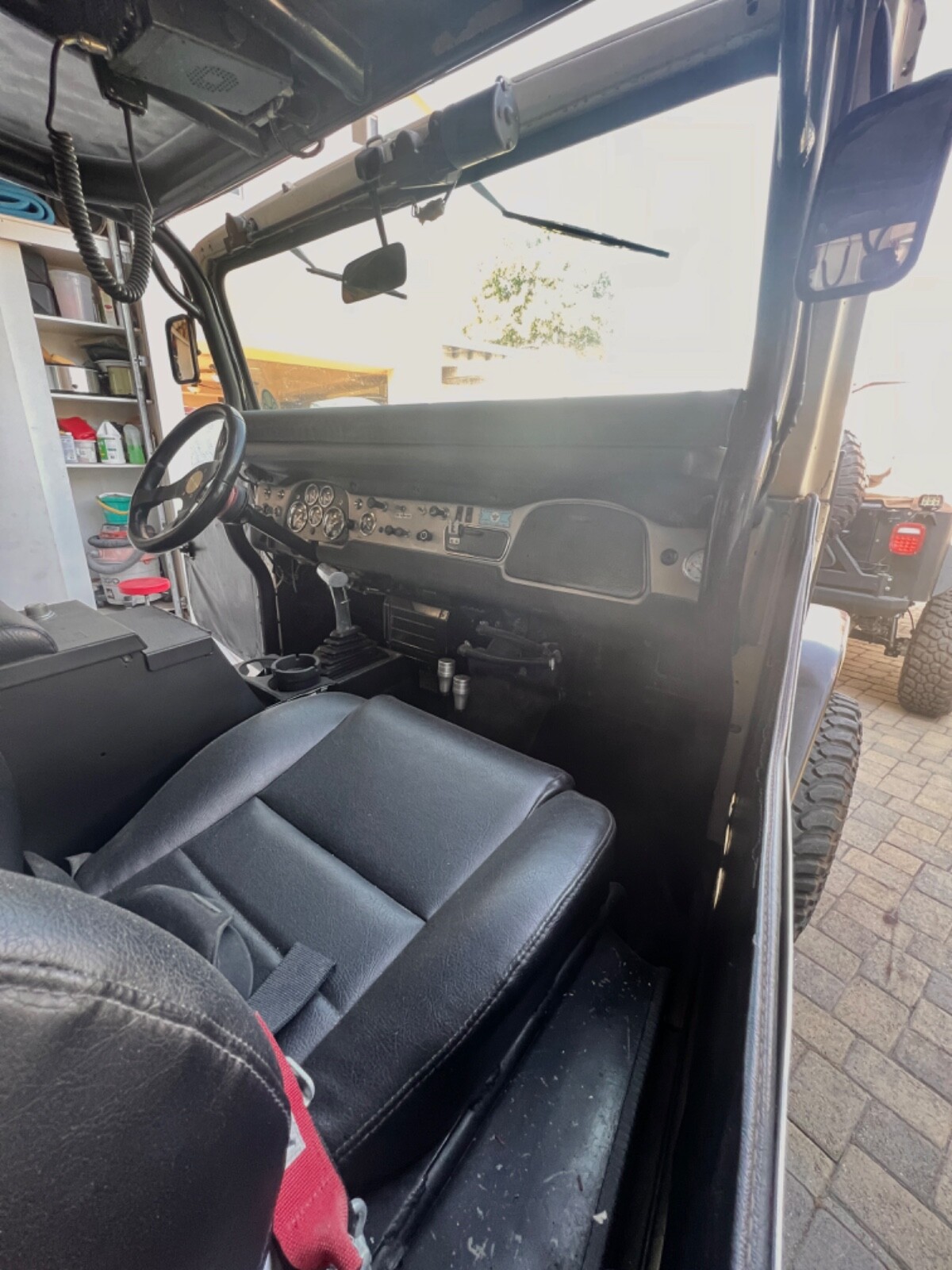 Lots of xtras. 4 wheel disc brakes, reverse shackle custom Deaver springs, Custom roll cage, rock sliders, bumpers, FJ60 power steering, Hardtop, Soft top, custom half doors, Custom seats with 5 point. Two gas tanks 36 gallons, 350 Chevy w/3 speed auto. CB radio plus stereo. Runs well and never has let me down.