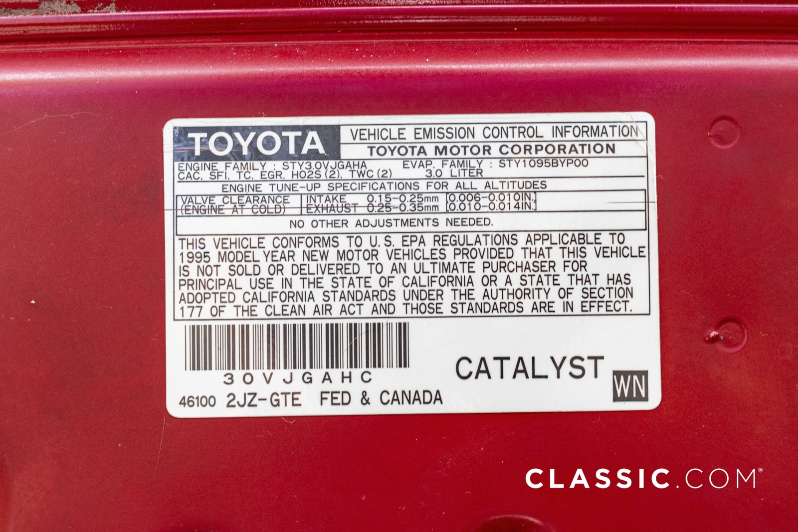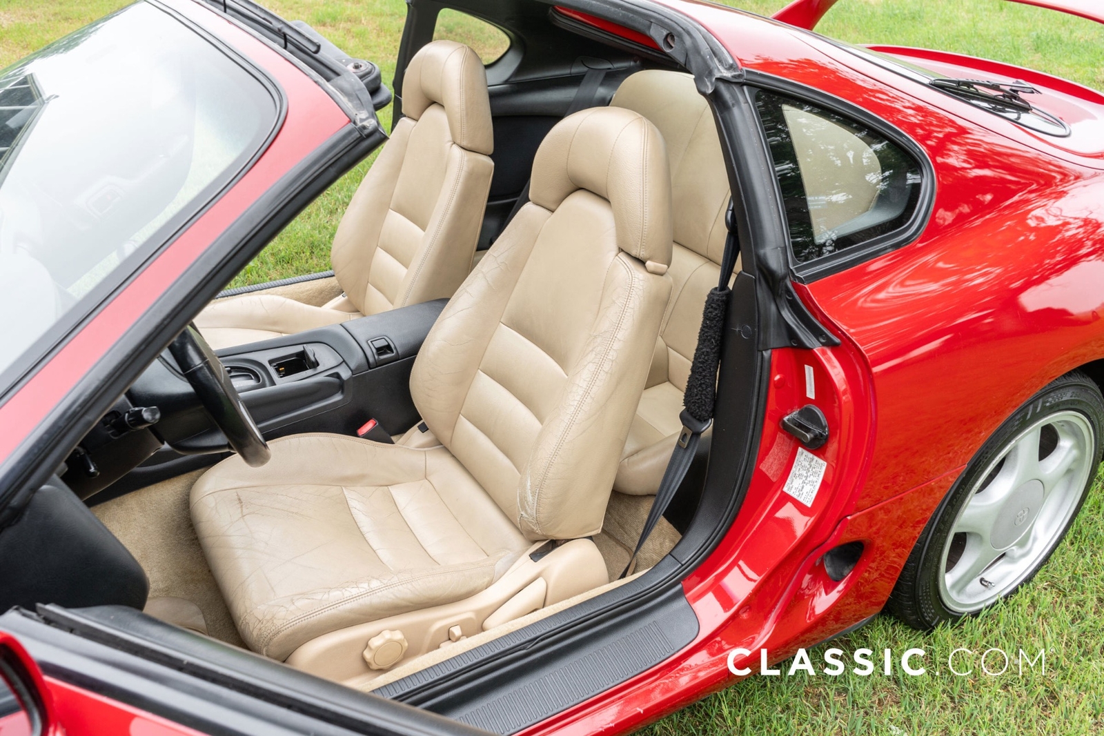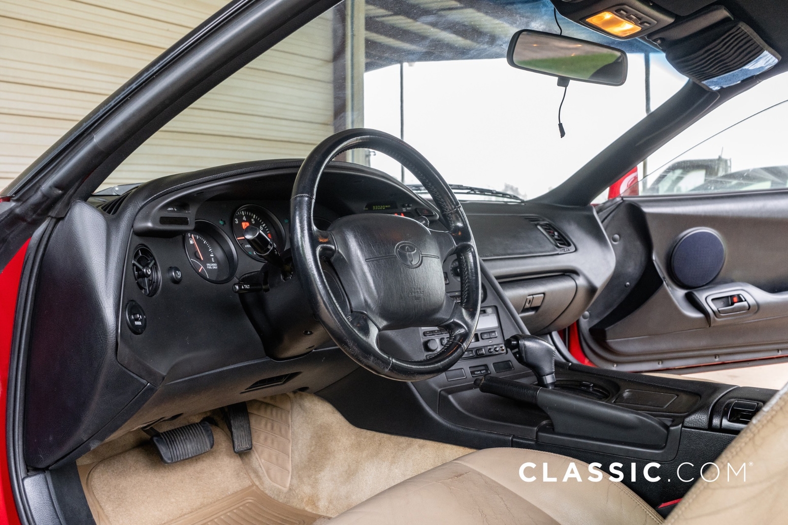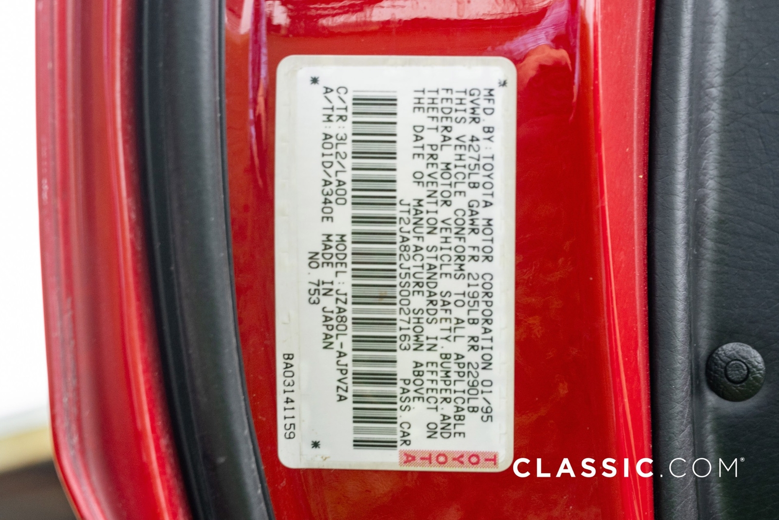 This Japanese automotive legend, a 1995 Toyota Supra is an excellent example of the modern classic that continues to gather appreciation for its power and classic looks. This vehicle shows well in its deep shade of Renaissance Red paint over the beige leather interior and targa-style removable roof panel. The Japanese sports coupe is ready to cross continents.