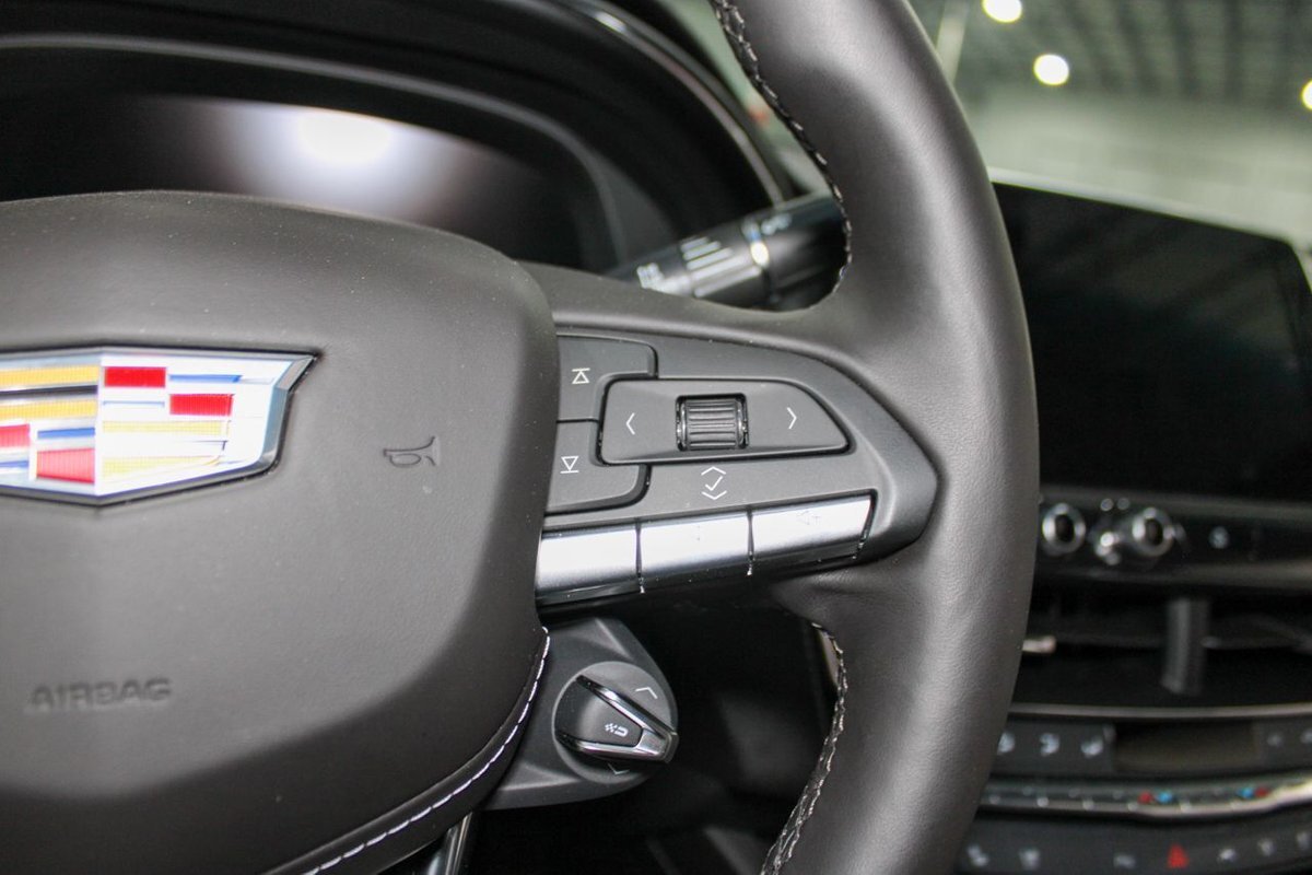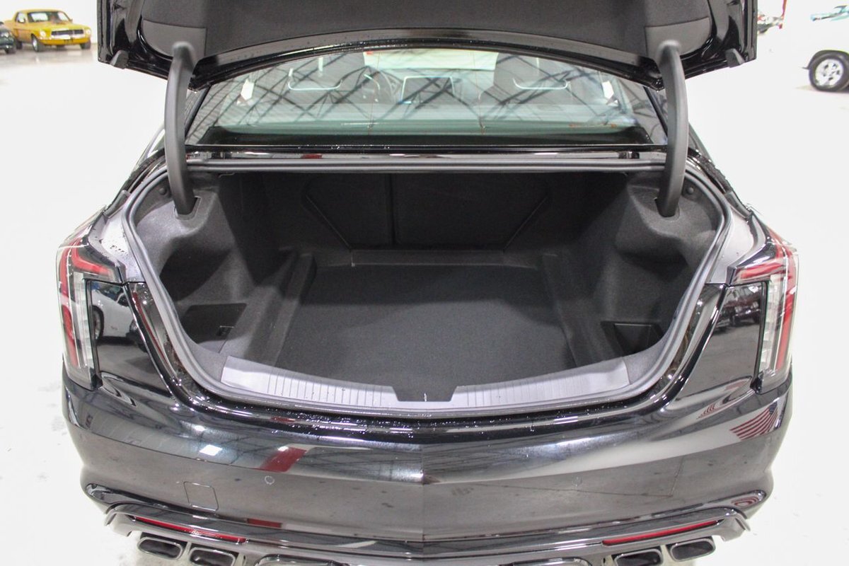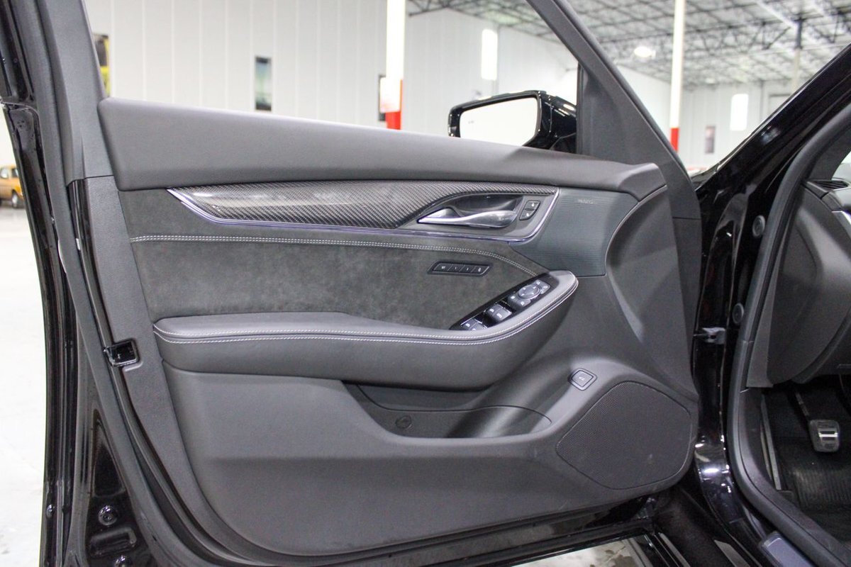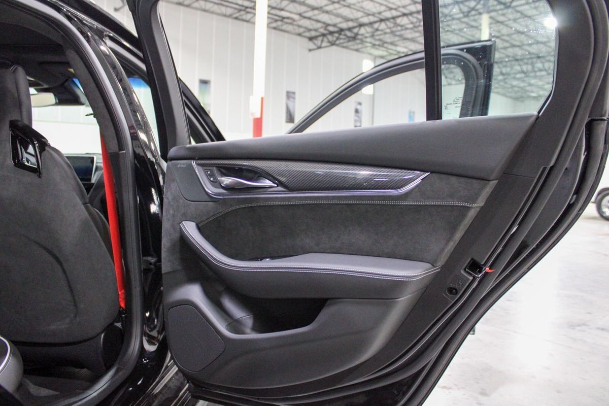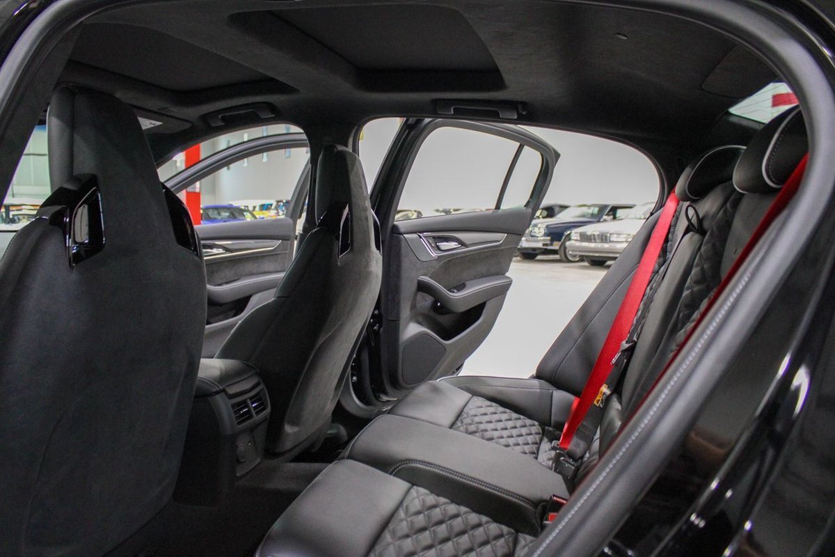 Adding to its aesthetic appeal are the 19-inch alloy wheels with satin graphite dark finishes, perfectly complementing the Jet Black exterior. The red brake calipers not only enhance the performance but also provide a striking visual contrast, hinting at the car's formidable stopping power. Inside, the CT5-V Blackwing offers a luxurious and driver-focused cockpit. Premium materials, including leather and carbon fiber accents, create a sophisticated ambiance. The high-performance front seats are both heated and ventilated, providing maximum comfort and support during spirited drives. The torch red seat belts add a splash of bold color to the interior, emphasizing the car's sporty character.