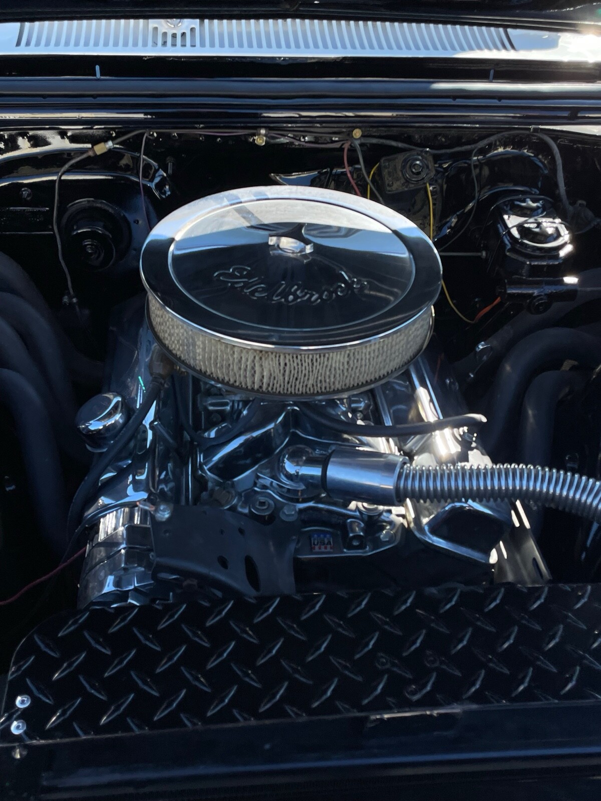 350ci v8,4 speed,polished s/s wheels,front disc brakes,power steering floor shifter,auxiliary gauges,edelbrock air cleaner,edelbrock intake dual exhaust,tubular lower control arms and hooker headers