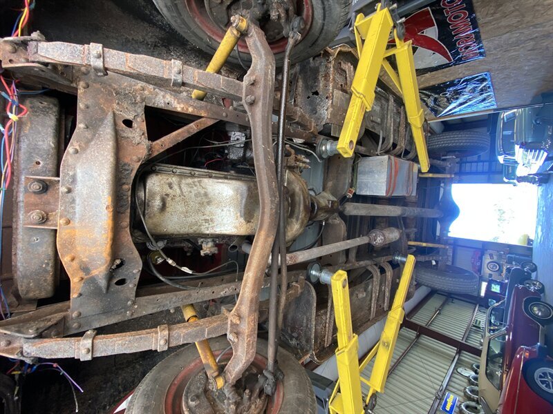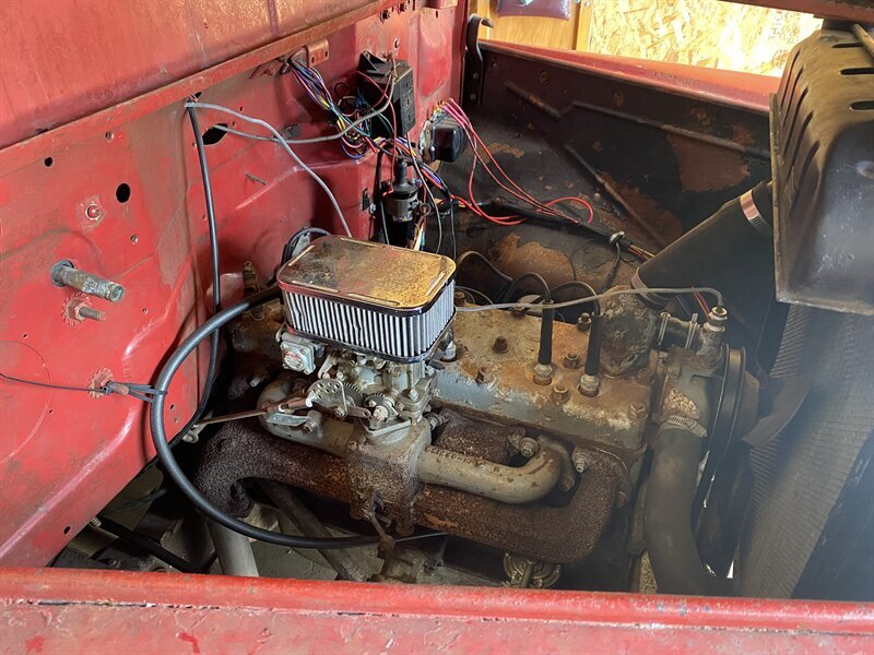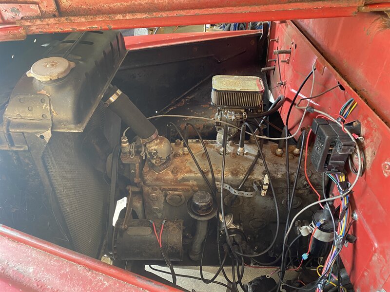 Currently finished in a red cab with a black cargo bed, the truck’s patina shows well and the paint and trim are in overall good order. The truck’s black bumpers fit tightly to the body while the engine bay is in decent order. A split windshield offers a divided view from the driver’s seat.