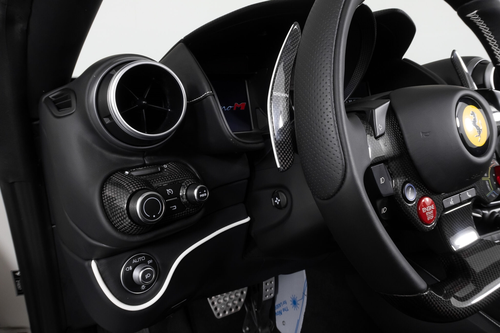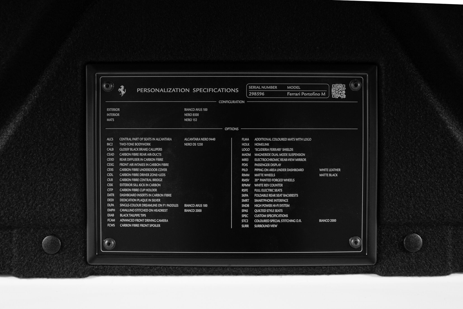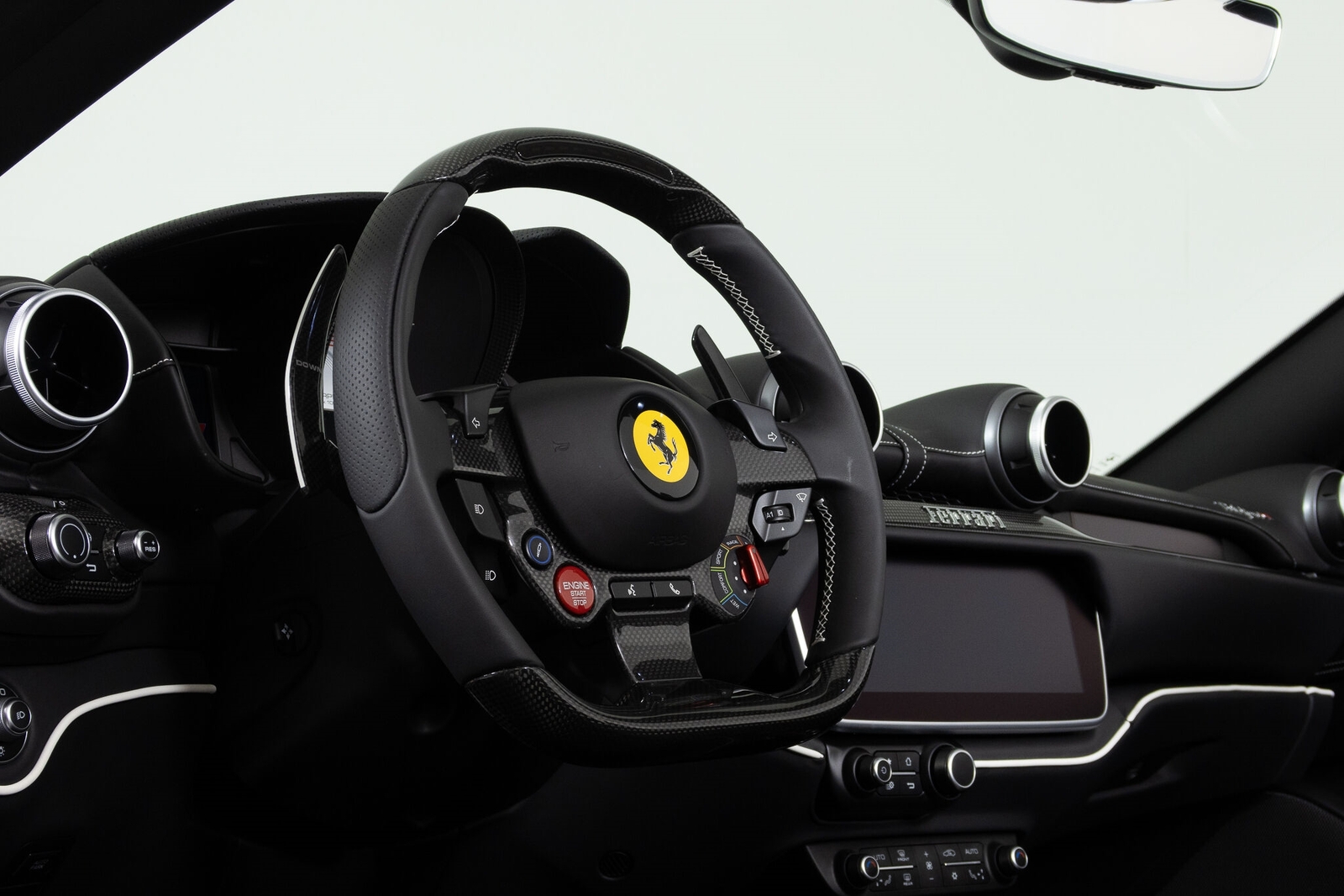 Ferrari South Bay is pleased to offer this highly optioned Portofino M finished in Bianco Avus with Nero Black leather contrasted with white stitching, featuring a wide array of Carbon Fiber and special equipment. Open air sophistication conspires with thrilling performance in the Portofino M to ensure you'll enjoy tasteful luxury and classic elegance along with the sensational driving experience which has been the foundation of Ferrari's iconic road cars for over seventy years.The exterior is finished in Two-Tone Bianco Avus with Nero Black Roof to accentuate the fighter jet look. The 20" Forged Matte Black Wheels surround Carbon Ceramic Brakes sporting Black Calipers. Carbon Fiber finishes the Rear Air Ducts, Rear Diffuser, Front Air Intakes, Underdoor Cover, Front Splitter and Exterior Sill Kicks. Scuderia Ferrari Shields adorn the fenders, while the Dual Mode Magneride Suspension smooths out rough roads, and sharpens up when taking on a set of curves. Inside, you'll find the cabin trimmed in Nero Leather and Alcantara, including the Fully-Electric Quilted Style Seats. There is Bianco White stitching and piping throughout the cabin, including the Cavallinos Embroidered on the seat headrests. The Steering Wheel is Carbon Fiber with Ferrari's now-signature LED Shift Lights, in front of Carbon Fiber Shift Paddles and a Tachometer finished appropriately in White. The Instrument Binnacle, Cup Holder(!), Dashboard Inserts, and the Central Bridge are Carbon Fiber as well. The Carbon Fiber Shift paddles are highlighted with White Dreamlines. Welcome conveniences are the Foldable Rear Seat Backrests, Smartphone Interface, and Electrochromic Rear-View Mirror. An Advanced Front Driving Camera as well as 360-degree Surround View Camera help with tight maneuvers, and a JBL Hi-Power Audio System and Passenger Display keep your companion entertained when you can't drive the car in an entertaining way!This Ferrari Certified Pre-Owned Portofino M is offered with both original keys, books, battery tender, and cover. It is covered by its original Factory Warranty through January 22, 2027 (and can easily be extended by two years at time of purchase); Ferrari's Genuine Maintenance Program covers annual maintenance through January 22, 2031, making this beautiful Portofino M as easy to own as it is fun to drive. If you'd like to know more about this car or others in our inventory, please reach out to our knowledgeable sales staff to arrange a viewing!