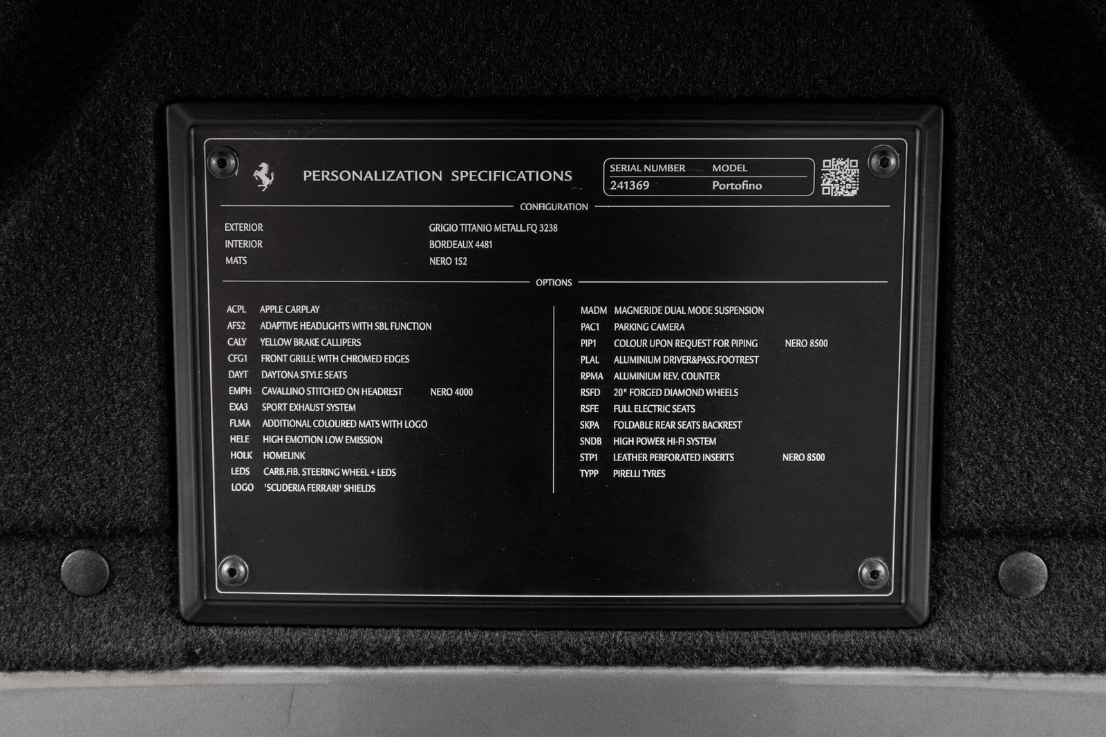 Ferrari South Bay is proud to present this stunning One-Owner, Ferrari-Certified 2019 Portofino, finished in gorgeous Grigio Titanium over Bordeaux Leather with contrasting Nero Black Stitching. Ordered, sold and serviced with Ferrari South Bay and just 2,354 miles showing on the odometer, this stunning car is in sensational condition, and already entirely covered in Paint Protective Film.The Portofino is the perfect car for a weekend cruise around town, or some fun threading through your favorite canyon. Drop the retractable hard top in under 15 seconds for some sunshine and an unrestricted soundtrack of Ferrari's award-winning twin-turbocharged V8 engine. The Portofino is wonderfully dual-natured; capable of taking you to your destination in style and comfort, hitting apexes on the track, or cruising with the top down on your favorite scenic road.The exterior is finished in Ferrari's very desirable and stylish Grigio Titanio - a metallic silvery-grey with a touch of blue. It's a very elegant, sophisticated color that's best seen in person to truly appreciate. 20" Forged Diamond Wheels surround Carbon Ceramic Brakes with Yellow Brake Calipers, and a Sports Exhaust out back. The Front Grille has Chrome Edges, and Ferrari's iconic Scuderia shields grace the front fenders. The entire exterior of the car has had Paint Protective Film applied since new, so your investment is guaranteed to look terrific for years to come. With 592 horsepower on tap, delivered through a paddle-shifted 7-speed Dual Clutch transmission, every drive is an adventure, whether headed to your favorite restaurant or attacking the most challenging canyon.Inside, you'll find rich Bordeaux Leather with Black Leather accents and Stitching (including the Cavallinos embroidered on the headrests). The Daytona Style Seats are Fully Electric and feature Black Perforated Leather accent strips and Piping. The Steering Wheel is Carbon Fiber, and features Ferrari's iconic LED Shift Lights. The Magneride dual-mode suspension comfort and capable handling regardless the quality of the road. A Parking Camera simplifies maneuvering in tight places, while the High-Power Audio System and Apple CarPlay provides the tunes for any road trip, and entertainment for your co-pilot.This Portofino is offered with 1 key, the original car cover, tools and factory wind deflector. As a Ferrari Certified Pre-Owned Vehicle, it has passed Ferrari's rigorous 101-pooint inspection and is eligible for two years of warranty at the time of purchase. The Ferrari Genuine Maintenance Program is active until 12/31/2025.Please contact our sales team at Ferrari South Bay for more information or to schedule an appointment for viewing.