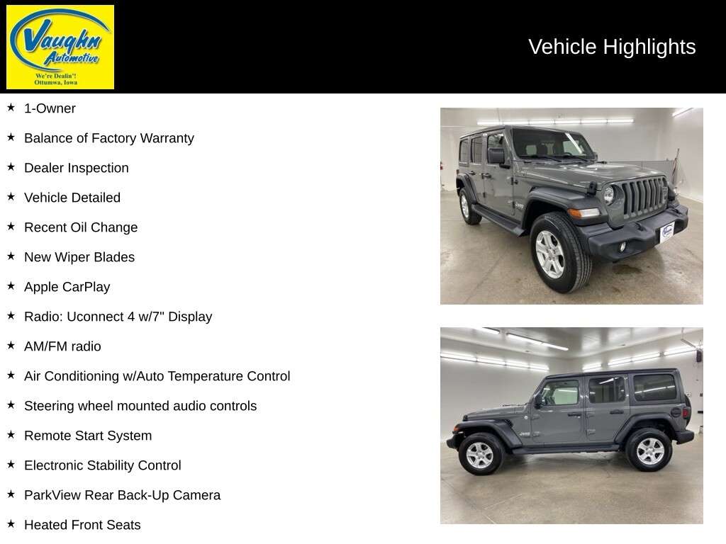 1-Owner, Balance of Factory Warranty, Dealer Inspection, Vehicle Detailed, Recent Oil Change, New Wiper Blades, 8-Speed Automatic, 4WD, Black Cloth, Air Conditioning w/Auto Temperature Control, AM/FM radio, Apple CarPlay, Electronic Stability Control, Heated Front Seats, ParkView Rear Back-Up Camera, Radio: Uconnect 4 w/7 Display, Remote Start System, Steering wheel mounted audio controls. 3.0L V6 Turbodiesel Sting-Gray Clearcoat 2021 Jeep Wrangler Unlimited Sport S Priced below KBB Fair Purchase Price! Odometer is 3063 miles below market average! 22/29 City/Highway MPG