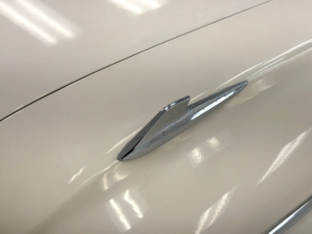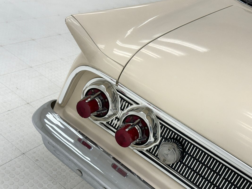 Sultana White covers the car and appears as an off white in our photo booth. The vertical front fascia of the car is classically 60's as are the straight panels and linear shoulder line which terminates at slightly outturned fins that flank a flat decklid. A side trim piece is fairly unique as it starts at the top of the front fender, goes the length of the car, sweeps around like turn 2 at Laguna Seca, then heads back across the lower panels sweeping through the door and ending on the front quarter panel. Chrome and metal work are not perfect on this car, but they are mostly straight and clean and the Mercury wheel covers on the 13-inch wheels look great. Jet inspired tail lights protrude like afterburners on a highly detailed rear panel and a Mercury God of Speed gas cap in the center, winged helmet and all. Imperfections include some bubbling, paint chips, and some discoloration in the paint in one section.