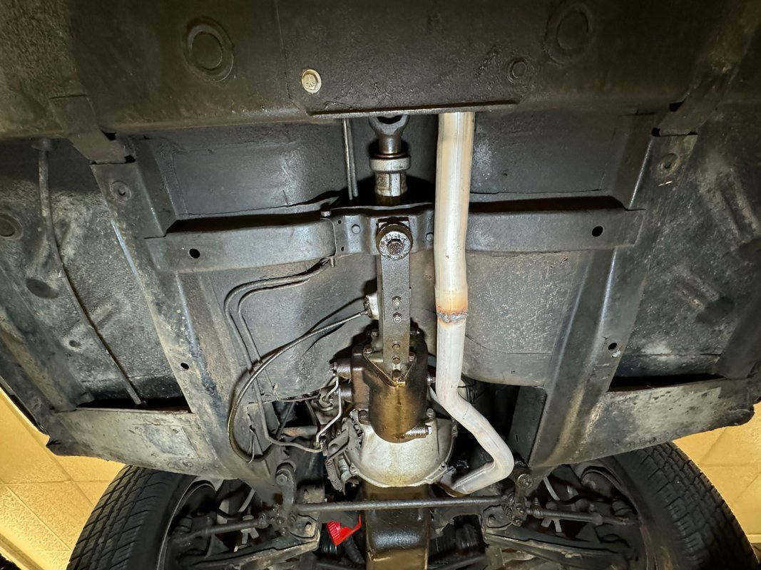 More driver quality conditions underneath with minimal surface rust, some oil on the transmission, and residual oil on the pan along with some slight grease/grime build up on the knuckles. The single exhaust travels back to a stock style muffler then terminates before the rear bumper. We note some sling on the exhaust pipe possibly coming from the U-joint. Suspension consists of coil springs up front and leaf springs out back.