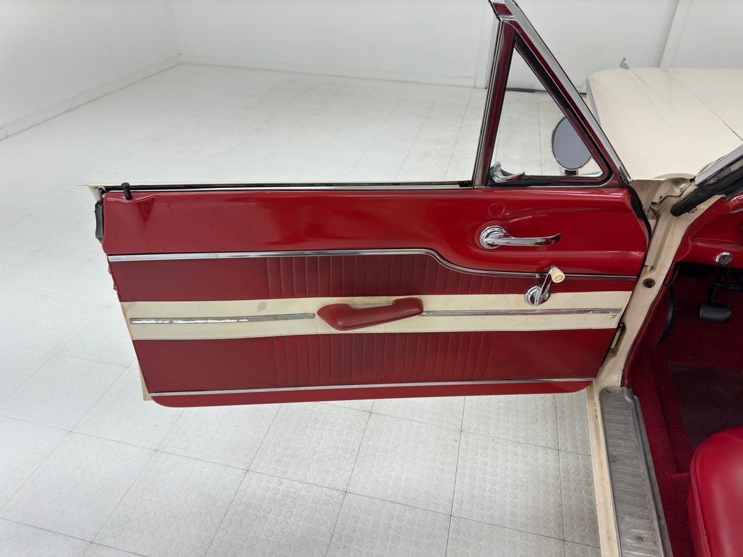Red painted upper and lowers on the door flank a pleated vinyl door card with a horizontal white and metal detail that intersects the vinyl, all a bit weathered but presentable. The red vinyl split bench is bright and clean with red piping surrounding the inserts and the entire pattern is repeated on the back bench where the sidewalls pull in the door design and also appear slightly weathered. Glorious 60's simplicity is exhibited by the thin steering wheel with horn ring and the simple dash with some ornate elements that give it character. Its horizontal layout includes the speedometer, indicator lights and the odometer in a jukebox-like surrounding. The remainder of the dash, including where the AM radio is embedded, is painted bright red and the loop carpet matches as well and in good condition. A black canvas top appears to be in decent shape and its plastic window has just a hint of hazing.