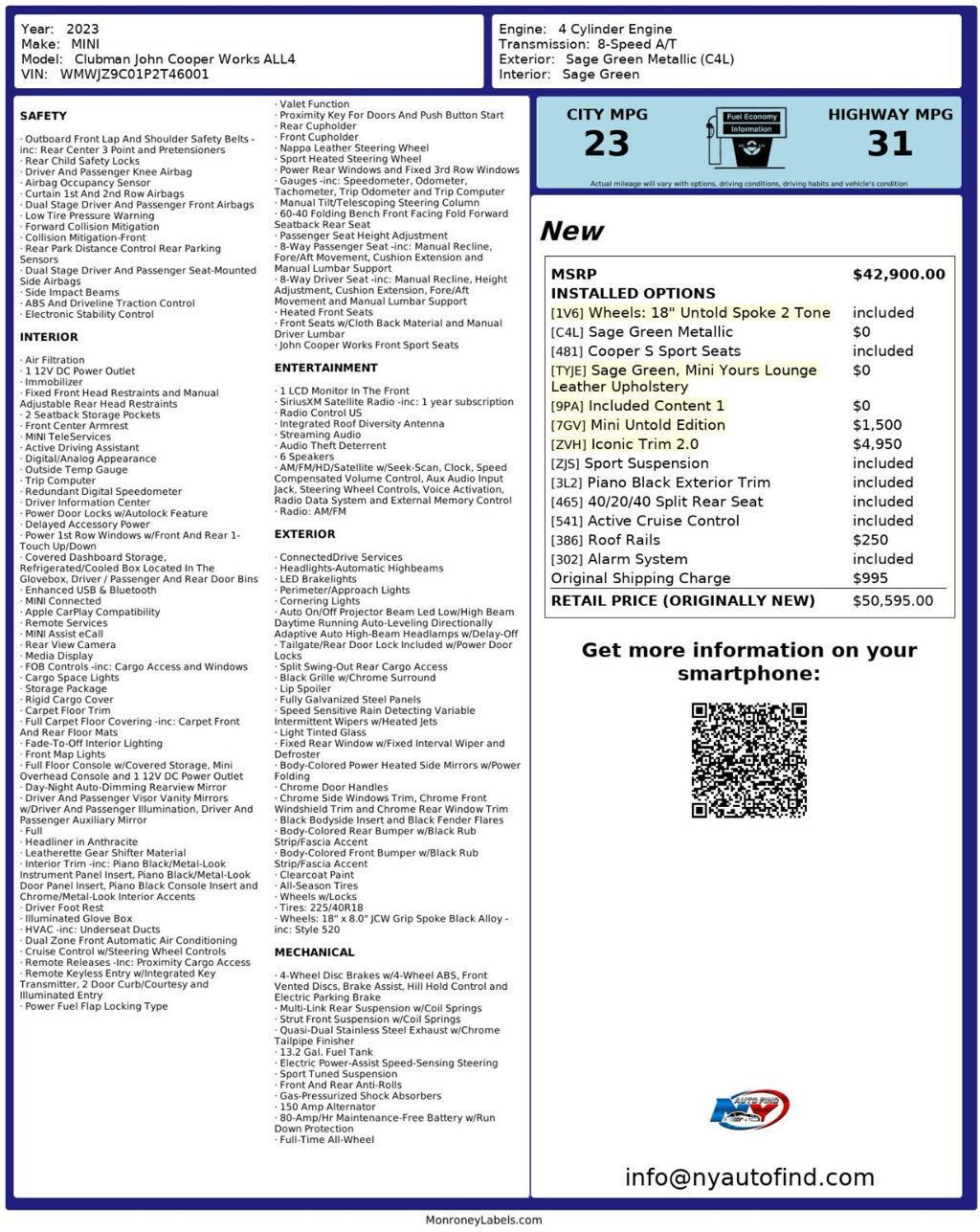 Take a look at this 2023 Sage Green Metallic MINI Clubman John Cooper Works ALL4 with Sage Green Leather Interior and only One Owner. Get ready for the car of a lifetime. This is not only a MINI Untold Edition, but this also has the Iconic Trim 2.0 Package. It also has a one owner history, Bespoke Leather Custom Factory Interior, an absolutely shocking amount of options and that new car feel. You will not find one like it anywhere. Do not miss this monumental vehicle that will surely wow anyone who sees it. It comes equipped with a 2.0L 4-cylinder engine paired to an 8-speed Automatic Transmission, All Wheel Drive, Panoramic Sunroof, MINI Navigation, Wireless Charging, Iconic Trim 2.0 (with 19 JCW Circuit Spoke 2-Tone Wheels, Sport Suspension, Piano Black Exterior Trim, MINI Head-Up Display, Universal Garage Door Opener, Body Color Roof, MINI Connected XL, Piano Black Interior Surface), MINI Untold Edition (with MINI Driving Modes, Body Color Roof, MINI Excitement Package, Interior Surface Untold Illuminated, John Cooper Works Aero Kit, Lights Package, Logo Protector, Side Scuttle, Specific Entry Sills), Parking Assistant, Dynamic Digital Instrument Cluster, Power Front Seats, Roof Rails, Alarm System, Active Cruise Control, Steering Wheel Controls, AM/FM/HD Radio, Satellite Radio, Power Windows, Power Locks, Air Conditioning and so much more. Every NY Auto Find vehicle comes with a complimentary Limited Warranty and a Carfax Vehicle Report. Our vehicles are priced to sell quickly. Please call to check availability and to schedule an appointment. -