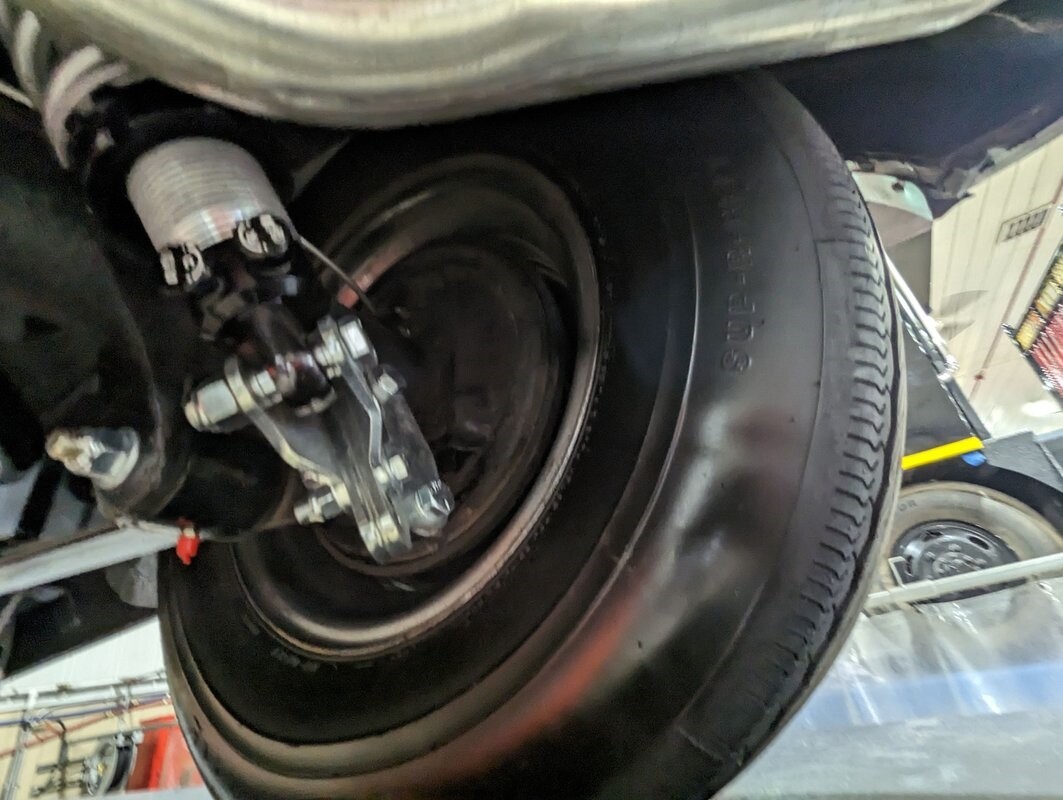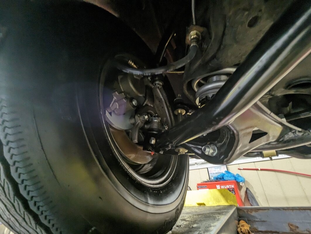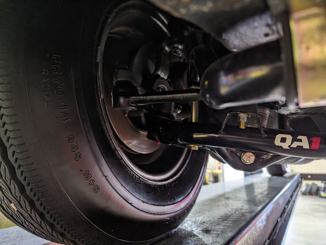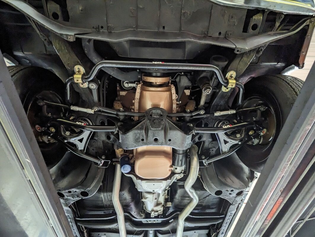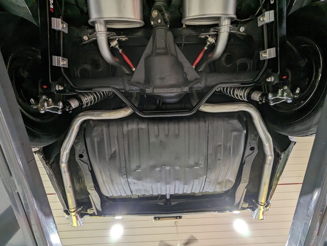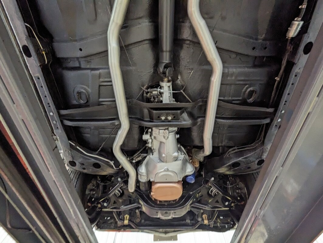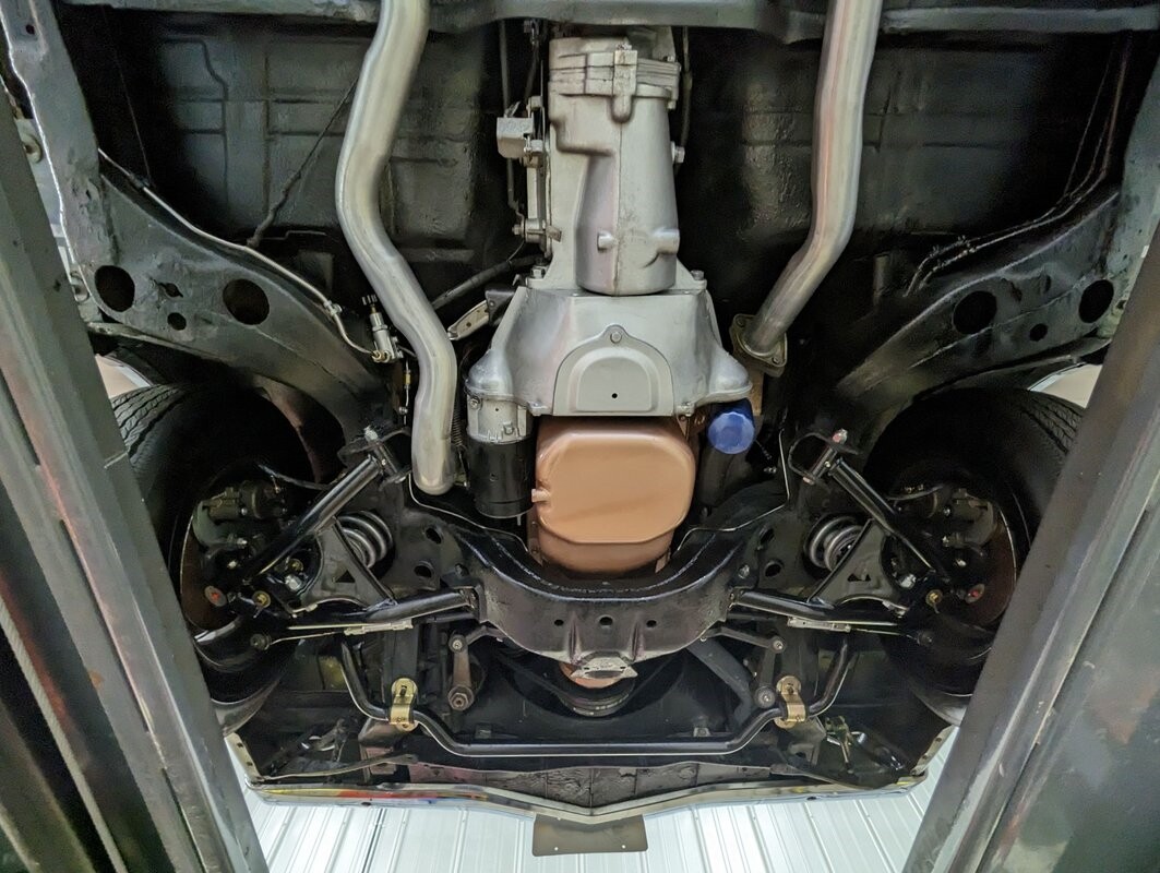 UNDERSIDE: The underside has been neatly preserved, maintained, and upgraded with bolt on parts to enhance the driver experience. The steering components have been upgraded with a Ridetech steering kit that includes center link, idler arm, tie rod ends/adjusters, and jam nuts. The entire front suspension has been upgraded with QA1 components and includes adjustable coil over shocks, tubular upper and lower control arms, and sway bar. The rear suspension has been upgraded with QA1 components as well and includes adjustable coil over shocks, lower trailing arms, adjustable upper trailing arms, rear sway bar and adjustable frame supports. The result of all the suspension work is essentially a pro touring ride quality. The front brakes have been upgraded with a Leed power disc brake conversion kit and new lines also. The rear brakes are drums, and the emergency brake is hooked up. The entire dual exhaust system has been replaced and sounds fantastic when flowing through the correct polished trumpet style exhaust tips. The gas tank appears to be original, but the fuel lines have been replaced. Looking up at the rebuilt numbers matching 400 engine everything looks fresh and there are no visible leaks. Same goes for the M20 Muncie 4 speed manual transmission. It has been totally rebuilt and looks very clean. The 12 bolt posi rear end is original to this car. The frame and floors are solid and look fresh with black paint.
