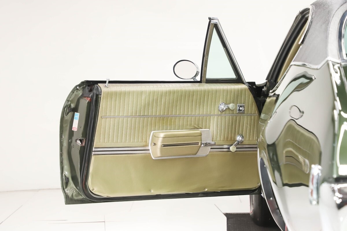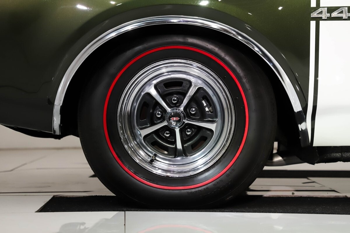EXTERIOR: What a slick looking car! It has been professionally repainted its factory original Jade Green metallic color with optional white stripes flanking each fender. It was then sanded and polished to a smooth and reflective finish. The vinyl top was replaced. All the panels are properly aligned with good gaps all the way around. The doors close easily like a new car. The mostly original trim still has a lustrous shine to it. The front and rear bumpers have been rechromed. The grille, headlight bezels, and taillights are original and in great shape. All the glass is original except the windshield. Beautiful 14 inch chrome SS1 rims are wrapped in reproduction Firestone Redline tires that are actually radials!