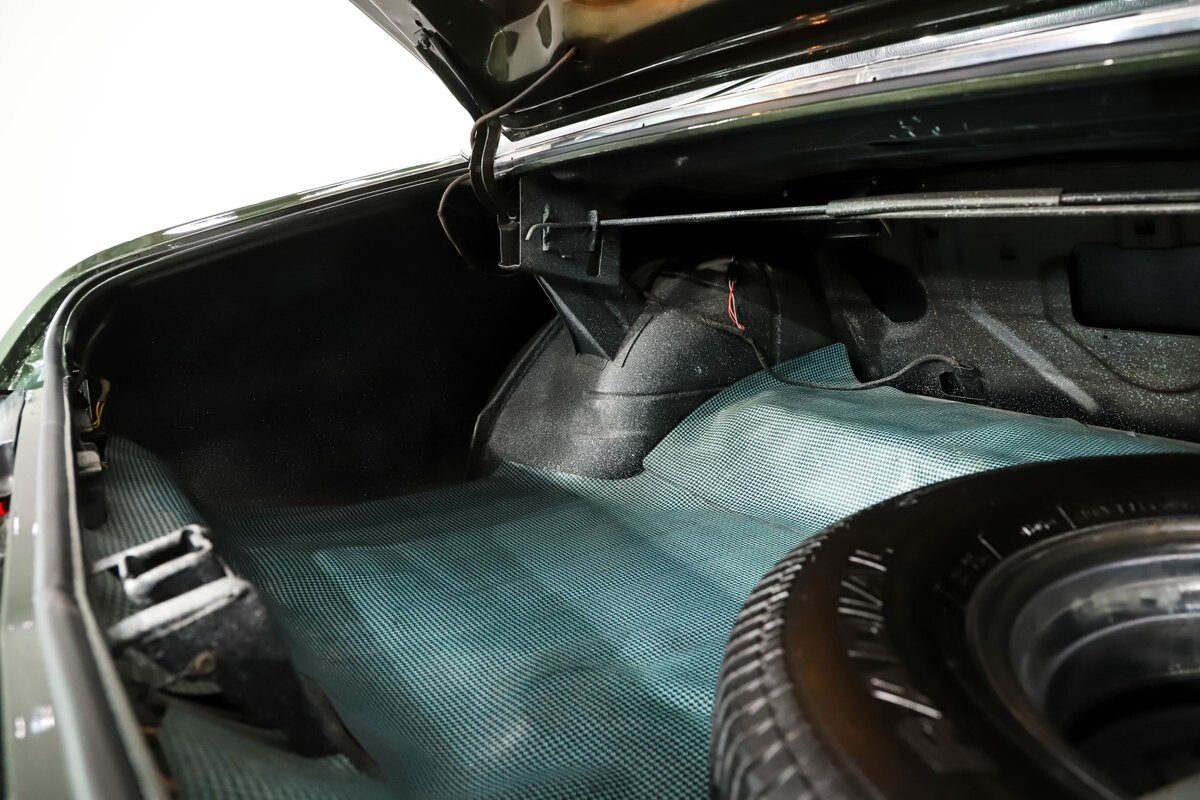 TRUNK COMPARTMENT: The underside of the trunk lid and jamb are painted Jade green just like the body. Reproduction stickers have been added and the optional luggage lamp is working. The weatherstrip has been replaced. The trunk pan metal appears to be solid and original with factory spatter finish paint. It has a full-size spare tire, jack assembly, and rubber mat included. The original radio and a couple other extra parts are currently being stored in the trunk.