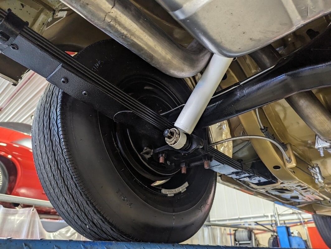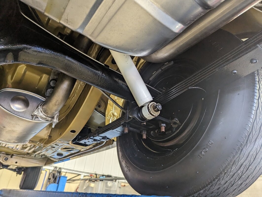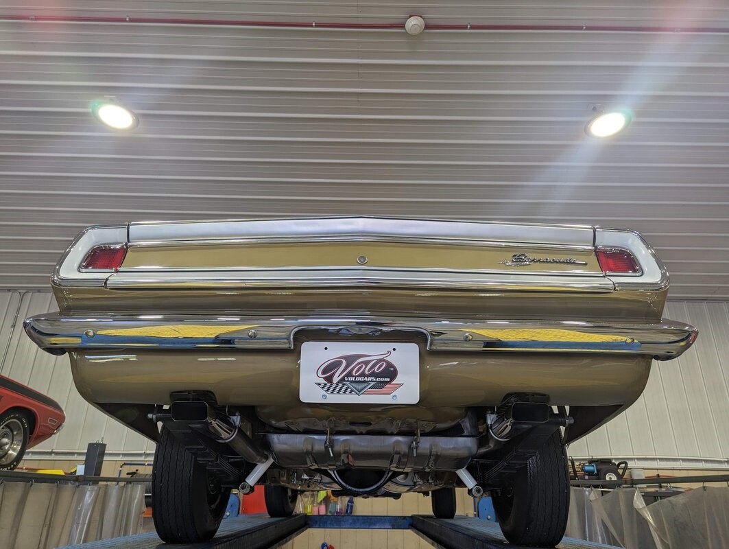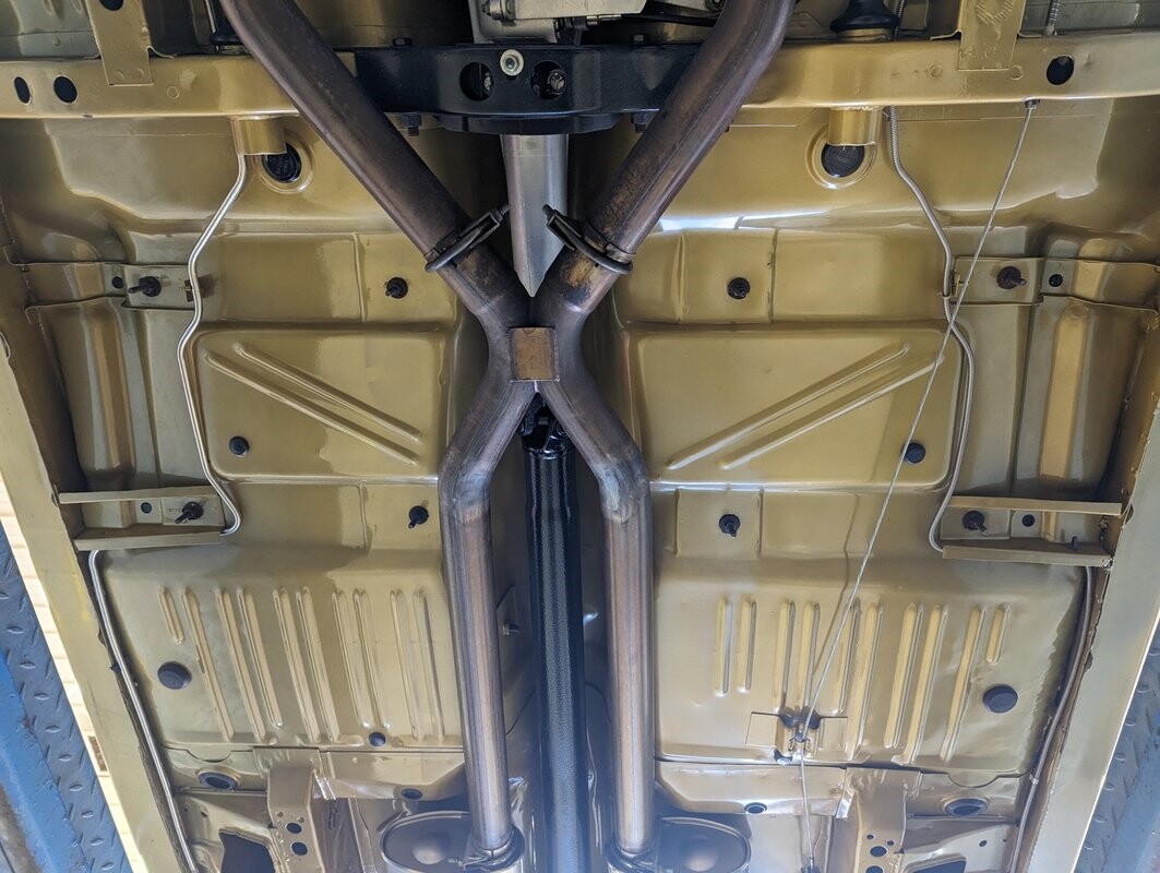 UNDERSIDE: This car is flipped on a rotisserie, every component was removed from the under the car. The floors are pristine metal prepped and painted Ember Gold. Every single component was rebuilt or restored and then reinstalled. These come with a special ride and handling package. The suspension front and back is completely rebuilt, upgraded with Koni gas shocks all around. The steering was rebuilt. The brake system was all rebuilt and it does have four piston disc brakes in front. The e-brake is all hooked up. The fuel system was replaced, the tank and the lines. It has stainless exhaust with x-pipe. Looking up at the motor it is spotless, starter looks new. The 727 Torqueflite was rebuilt and has a shift kit and a 2500 stall converter. The drive shaft was rebuilt, new u-joints. The rear end is an 8 3/4 with 3.23 Sure Grip gears.