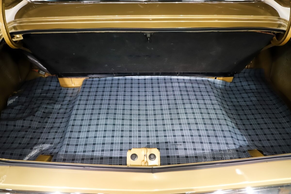 TRUNK COMPARTMENT: Under the lid, the jamb and the inside are painted slick. Under the mat is a matching painted rim and redline tire. New mat and weather strip. It opens into the interior.