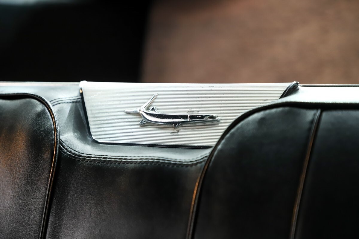 INTERIOR: It's like new. Premium Legendary upholstery and door panels. The dash area is mint: knobs, trim, gauges, dash pads etc. It's aradio delete but hasa modern stereo below the dash. Very nice original console between the bucket seats. The rear seat folds flat, a 2+2! The deluxe wheel is restored like new. Interior lights work.