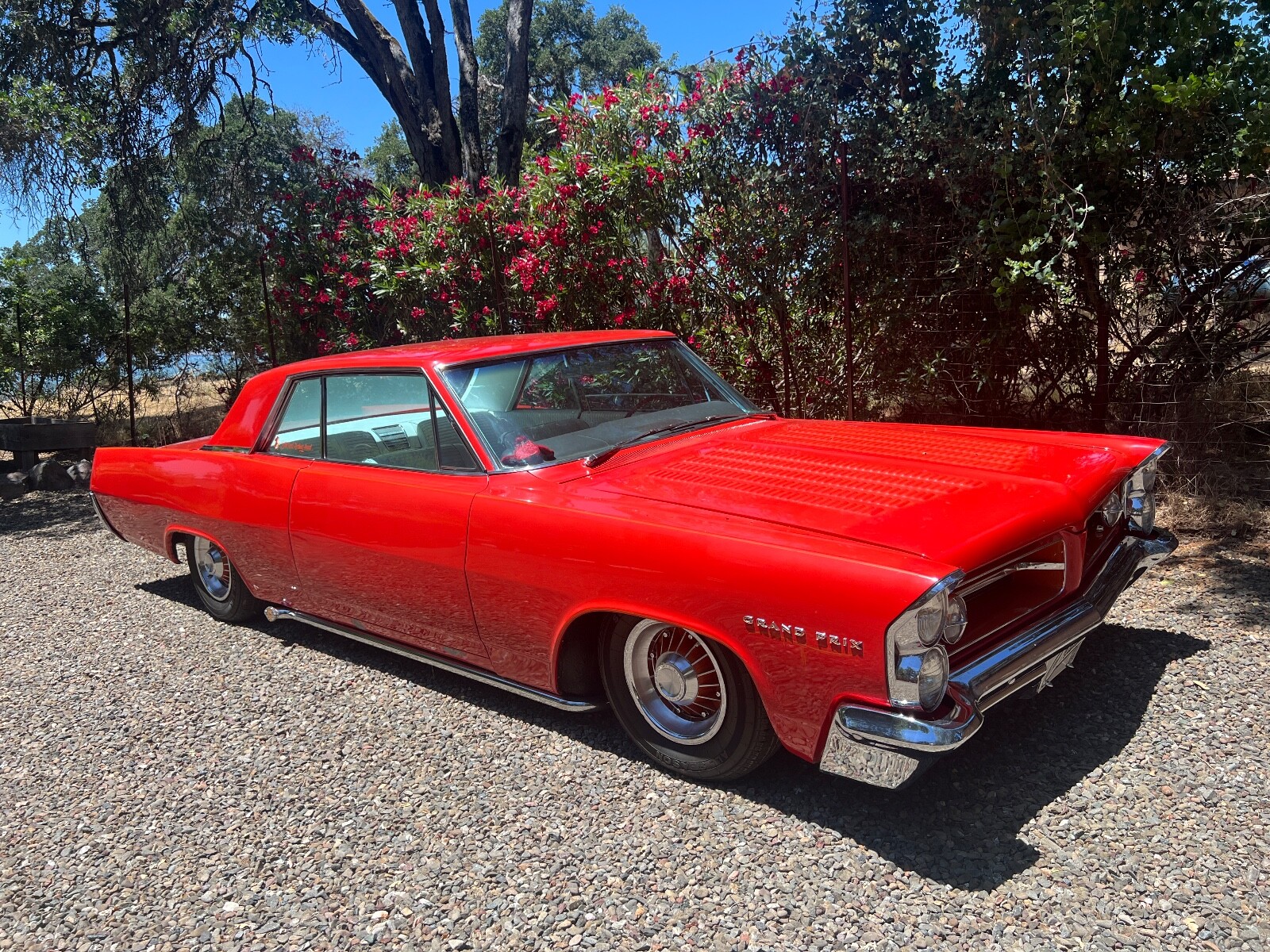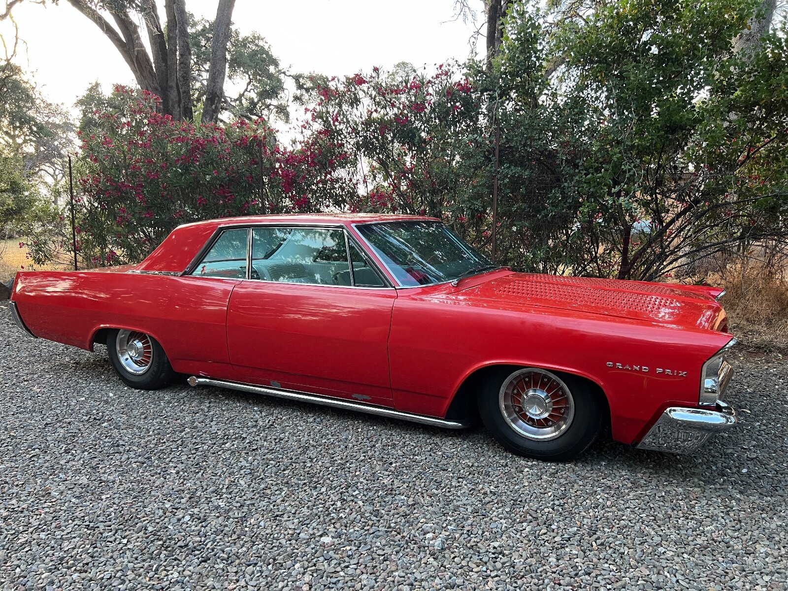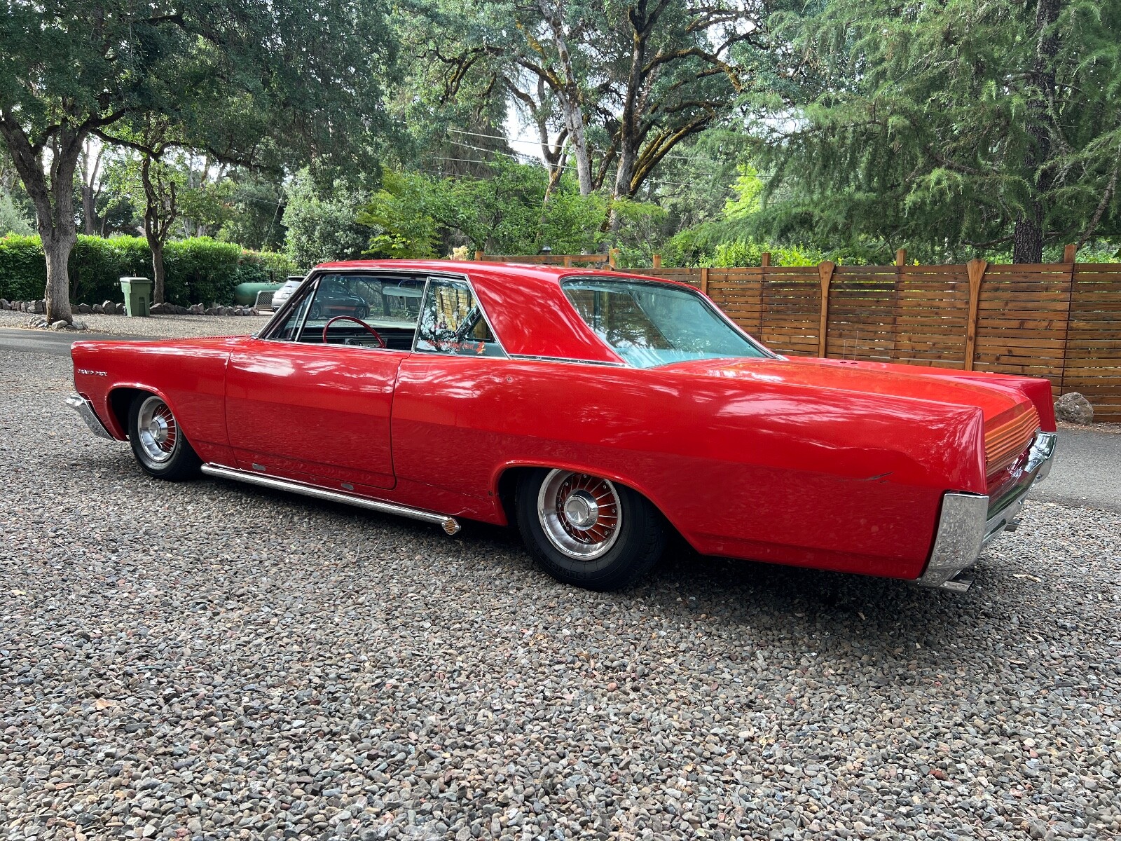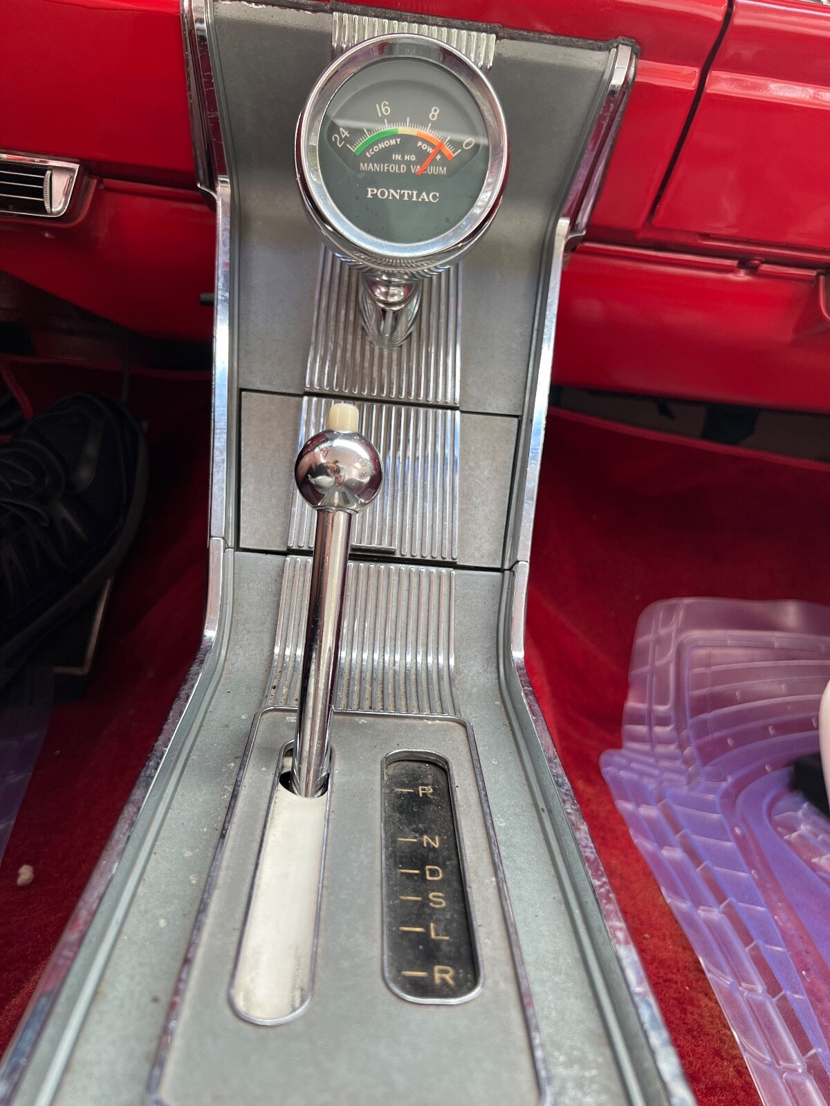 Old Skool mild custom 63 GP. 8 lug wheels. This car was built back in the 60s and 70s so its heated coils and blocks on leaf springs in the back. Original 389 4bbl motor that run's good. Factory AC car with gorgeous White bucket seat interior. Console and floor shifter. Louvered hood, laker's and double antennae. Great graphics under the hood referring to the 50s song little red riding hood. Body and paint are old and we consider the car driver quality with some rust showing around wheel lips. Gauge package is working. Radio is non op. AC is not cold but may just require a charge. Transmission is shifting strong but slipping out of high gear around 55 mph. Brakes and steering are all good. Overall a smooth old Custom that with some elbow grease could be brought back to its original show winning glory. Located in Nor Cal 95451