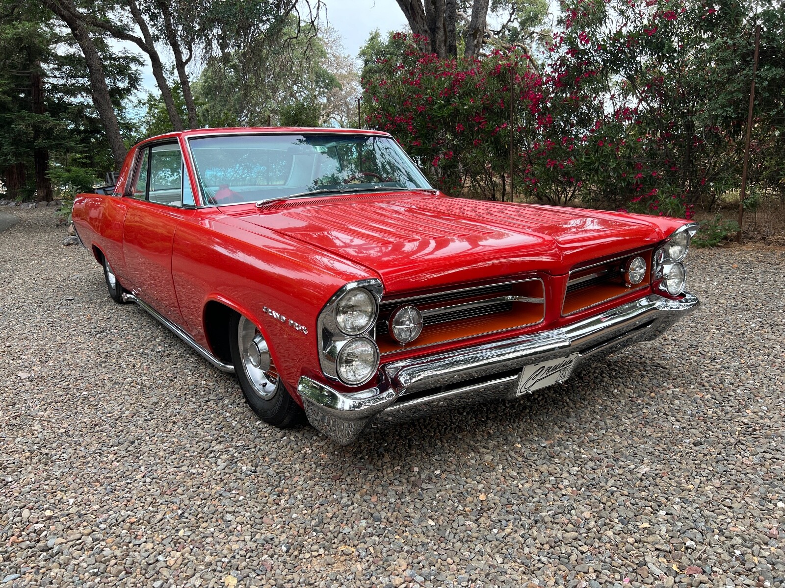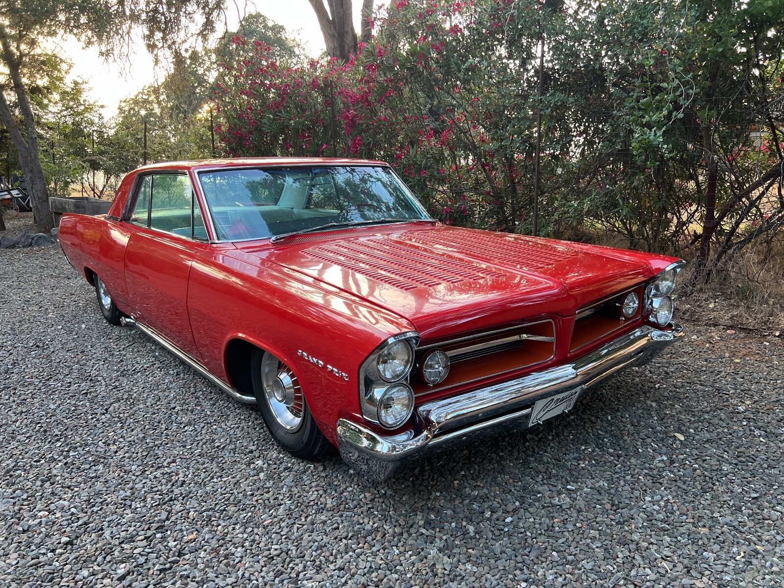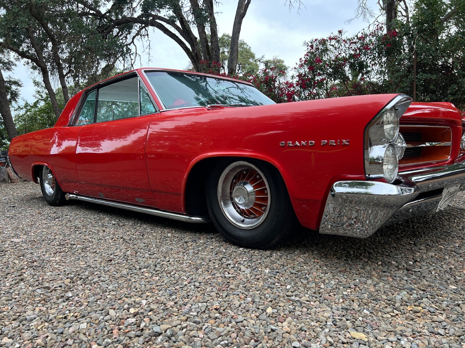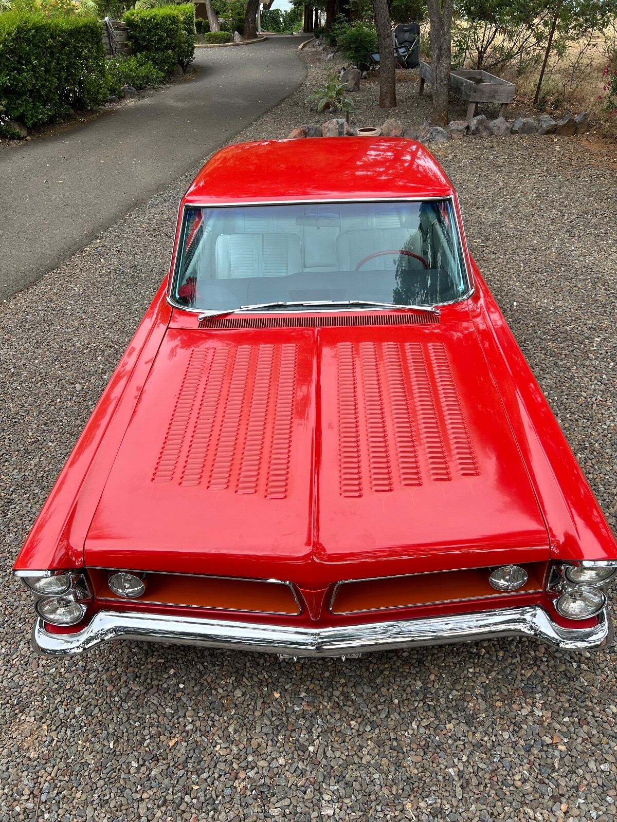 Old Skool mild custom 63 GP. 8 lug wheels. This car was built back in the 60s and 70s so its heated coils and blocks on leaf springs in the back. Original 389 4bbl motor that run's good. Factory AC car with gorgeous White bucket seat interior. Console and floor shifter. Louvered hood, laker's and double antennae. Great graphics under the hood referring to the 50s song little red riding hood. Body and paint are old and we consider the car driver quality with some rust showing around wheel lips. Gauge package is working. Radio is non op. AC is not cold but may just require a charge. Transmission is shifting strong but slipping out of high gear around 55 mph. Brakes and steering are all good. Overall a smooth old Custom that with some elbow grease could be brought back to its original show winning glory. Located in Nor Cal 95451