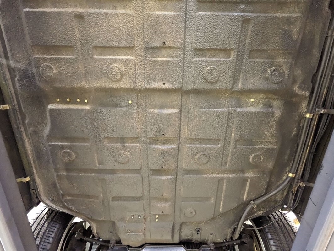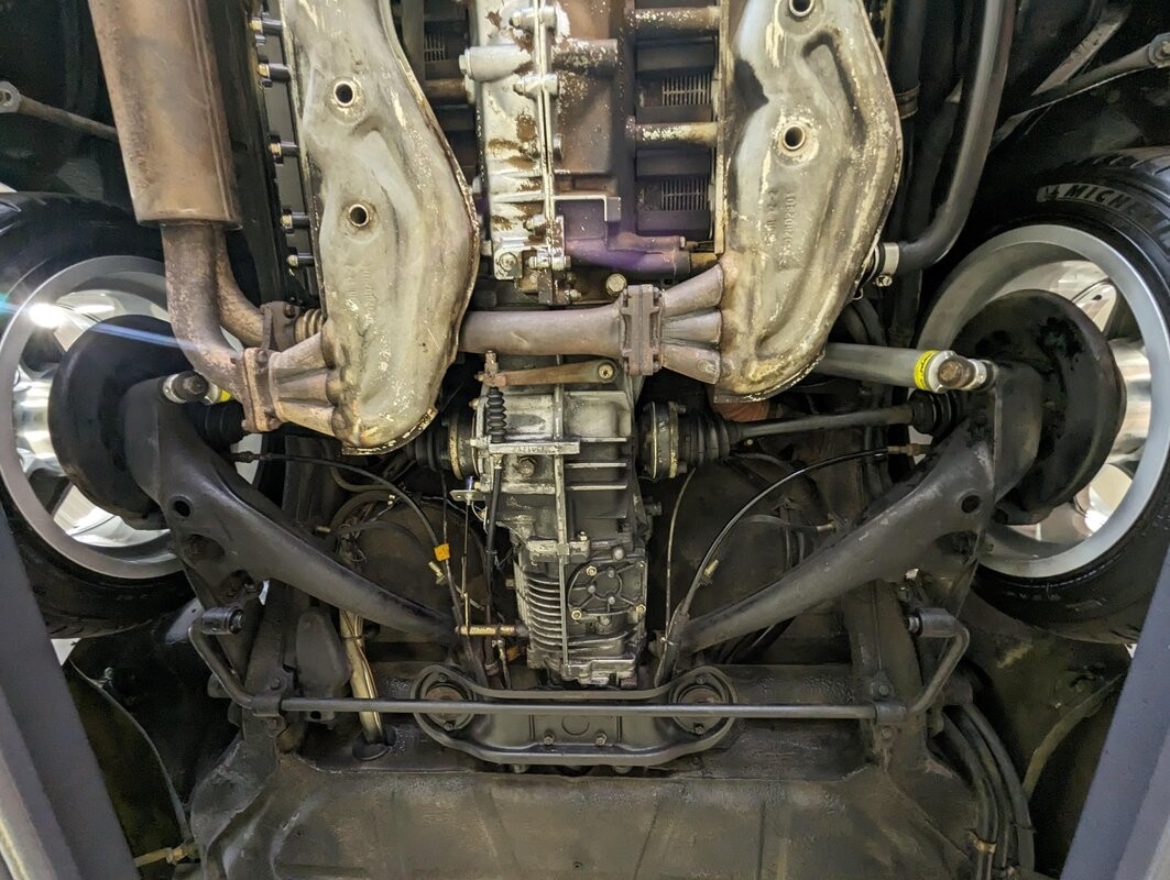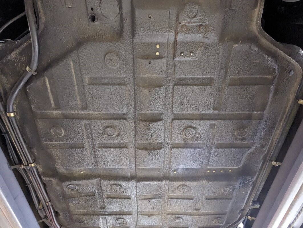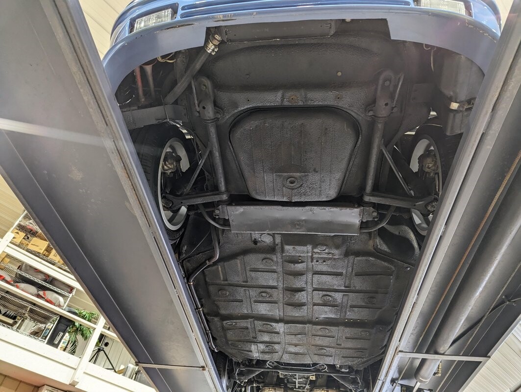 UNDERSIDE: Underneath is original and in very nice condition. The original undercoating is still in great shape. The floors are solid and the trunk area. As to be expected with the age it has its patina but no major rust or rot anywhere. Overall clean and everything is functional. You are looking up at a correct 5 spd manual transmission. The factory dual exhaust is intact and does not leak.