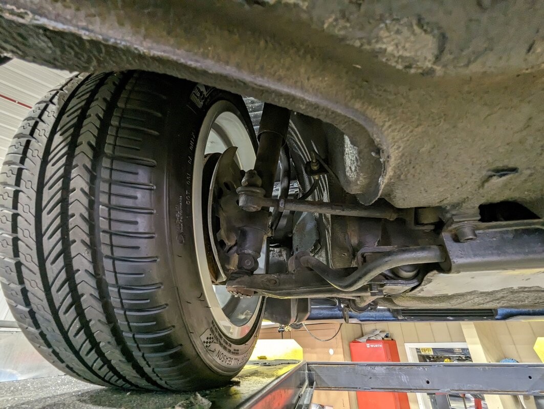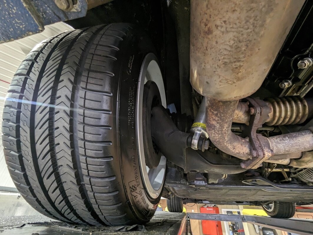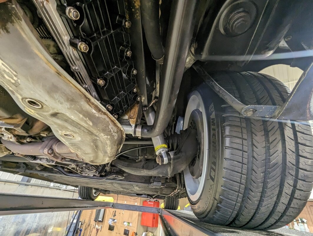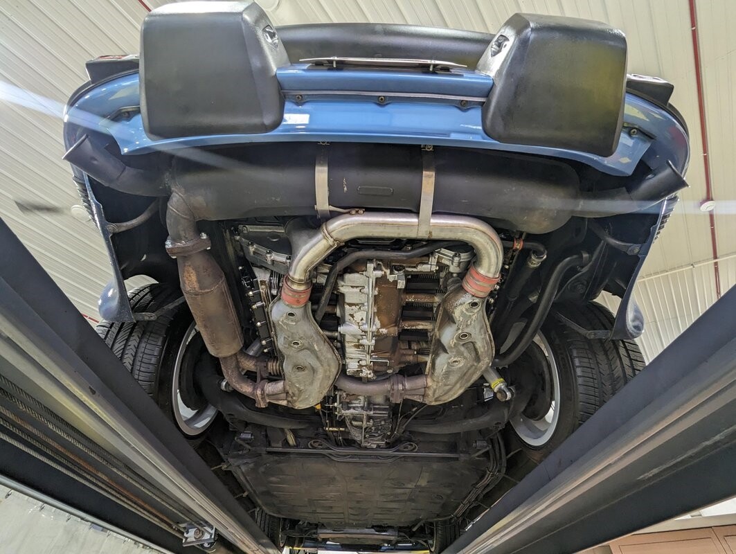 UNDERSIDE: Underneath is original and in very nice condition. The original undercoating is still in great shape. The floors are solid and the trunk area. As to be expected with the age it has its patina but no major rust or rot anywhere. Overall clean and everything is functional. You are looking up at a correct 5 spd manual transmission. The factory dual exhaust is intact and does not leak.