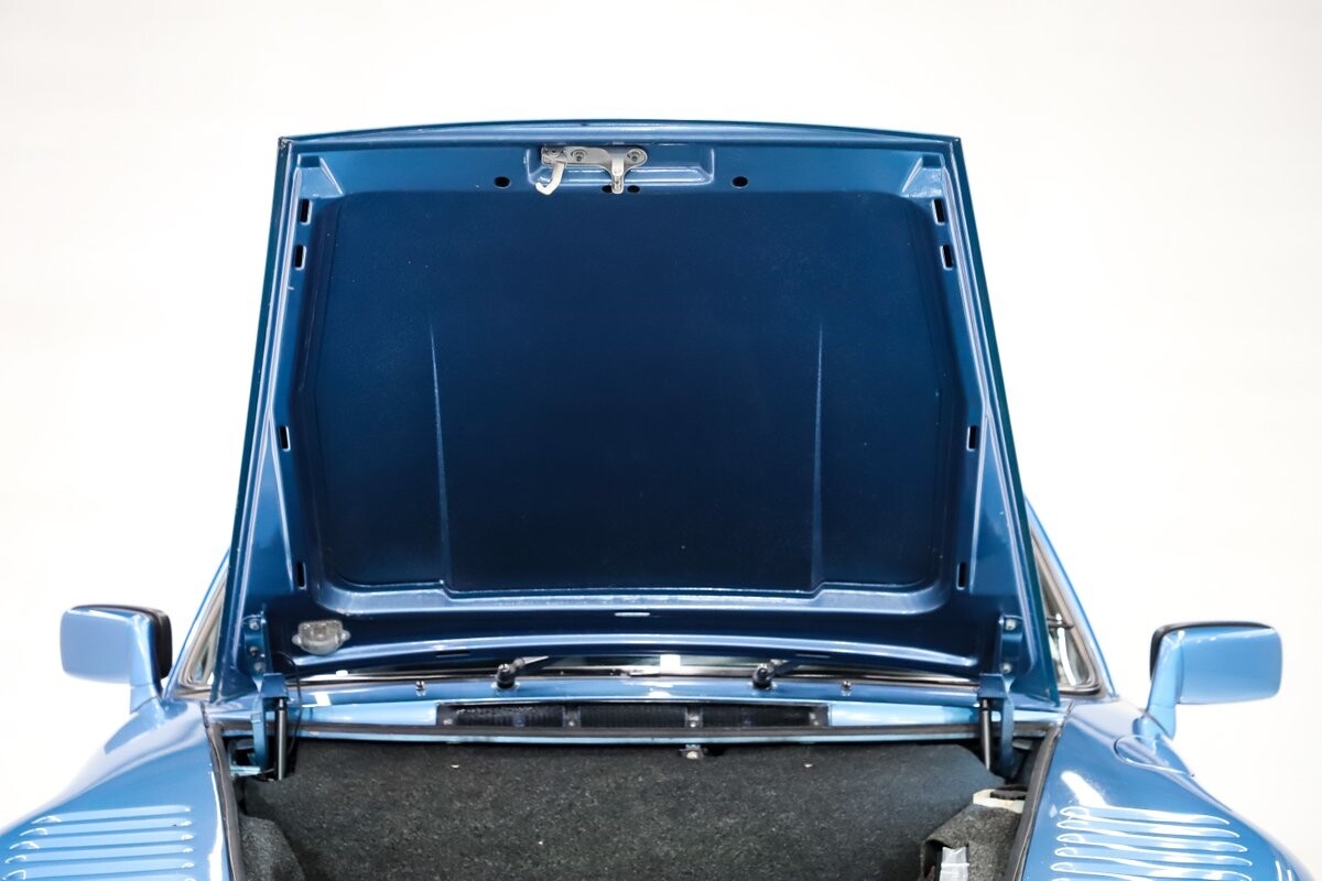 TRUNK COMPARTMENT: The frunk is in great shape as well, It has a complete carpet kit that's in nice shape. Underneath is the original spare tire as well as the factory jack and tool kit. The battery has been replaced and sits to the side of the spare. All the jambs are painted glossy and the hinges are functional and hold the bonnet up. Included is a car cover that fits nicely to the car.