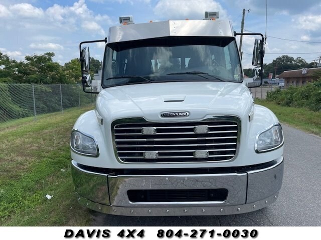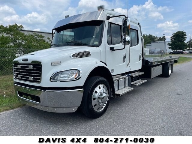 2021 Freightliner M2 Crew Cab Century Rollback Flatbed Tow Truck. This vehicle is a single owner, locally owned truck built by Miller industries with a century 21.5 x 102 steel bed with blade rails and a fixed headboard. It is a two car carrier with wheel lift Air Ride suspension, towing ball mount, additional LED strobe lights, Whelen strobe light bar, full four-door crew cab with maximum space, chrome and stainless items including add on trim, CB Radio, drivers and passengers Air Ride seat, large center storage console, airhorns, stainless windshield visor, Alcoa alloy wheels, new brakes, and quite a few other recent maintenance upgrades. This truck is clean and ready to go to work immediately.