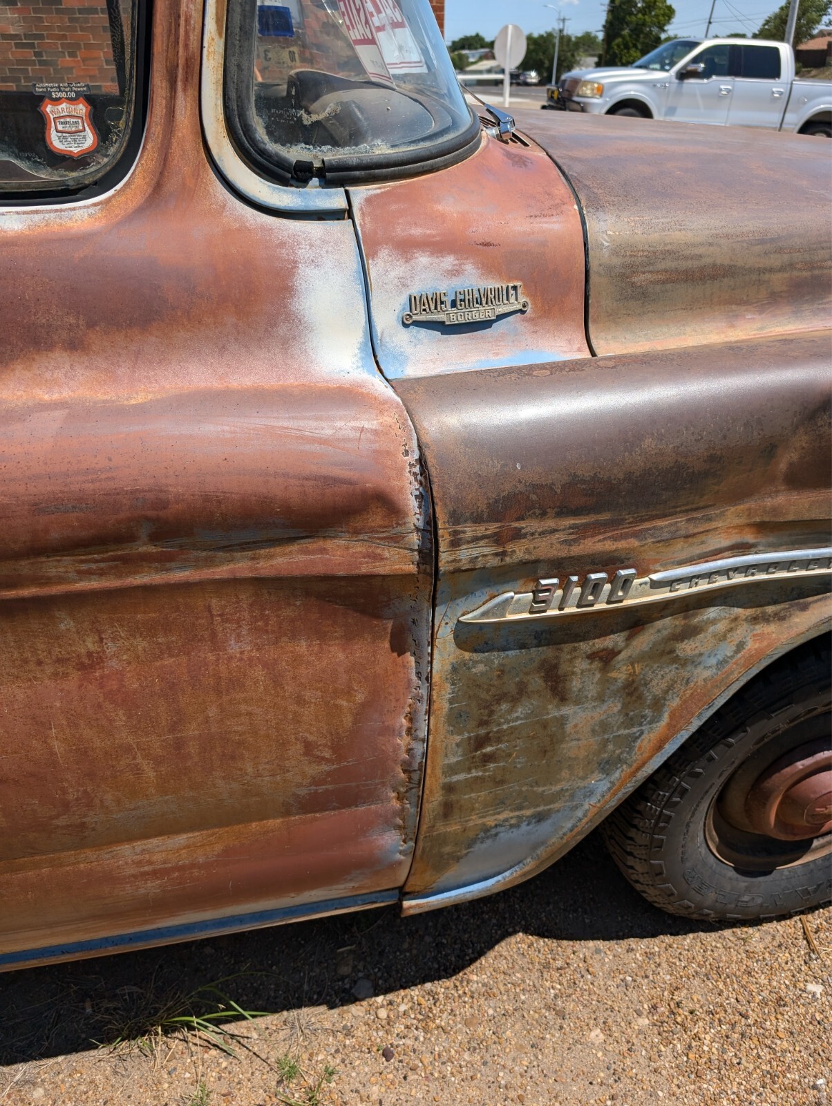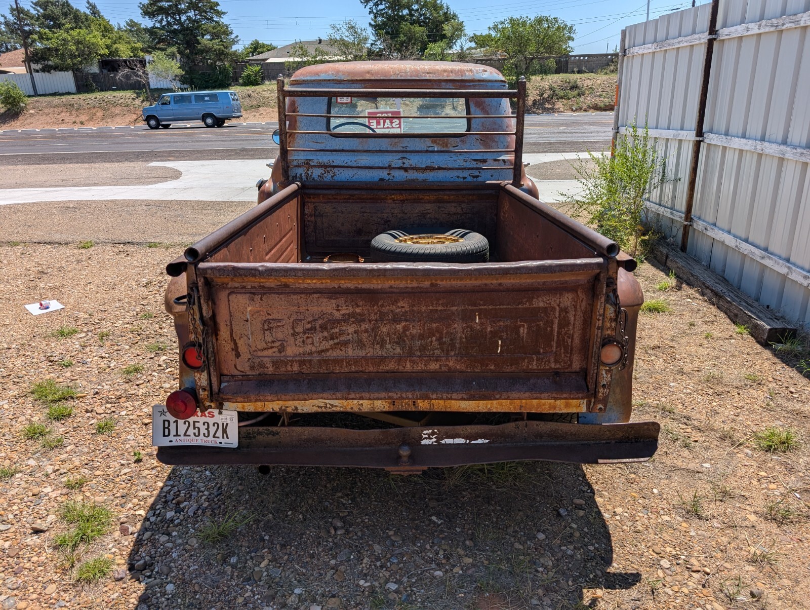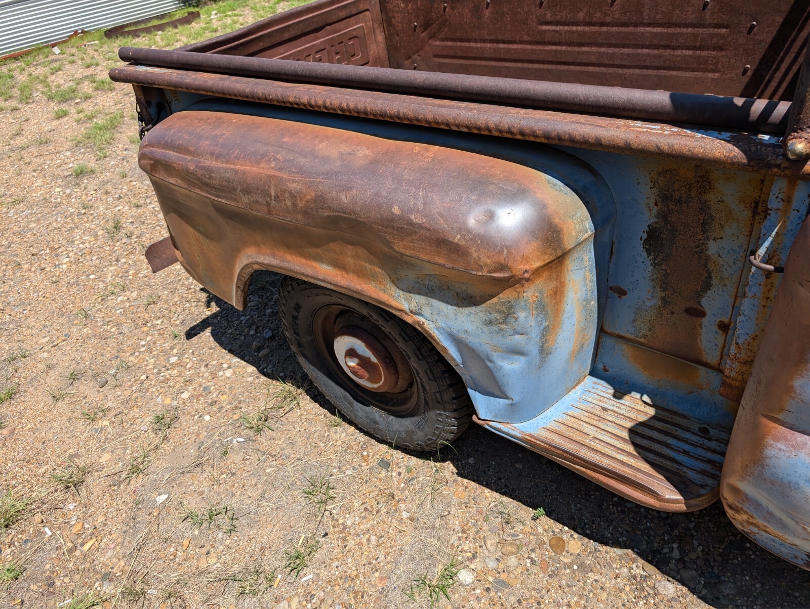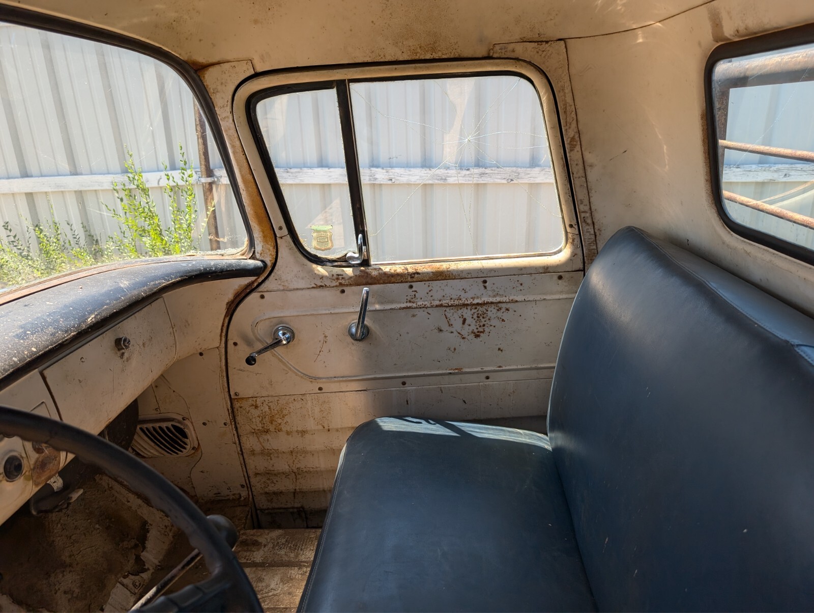 This is a all original truck lived it whole life within 50 miles of where it was purchased  on a ranch in the Texas panhandle.I acquired it a few years ago with the intent to restore for my daughter    never got around to it  has minimal rust in the cab corners  and a spot on the door;  it has about  10000 miles on the overhaul the original owner had done  .it has cracked glass   and the wipers only kind of work ,vacuum wipers .got a leak in a wheel cylinder so you have add brake fluid every now and then just a great truck new tires