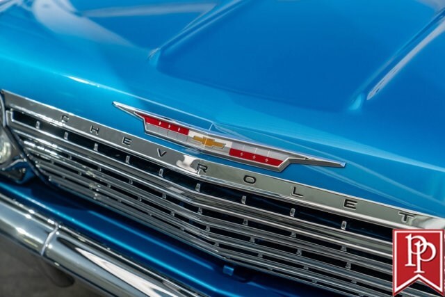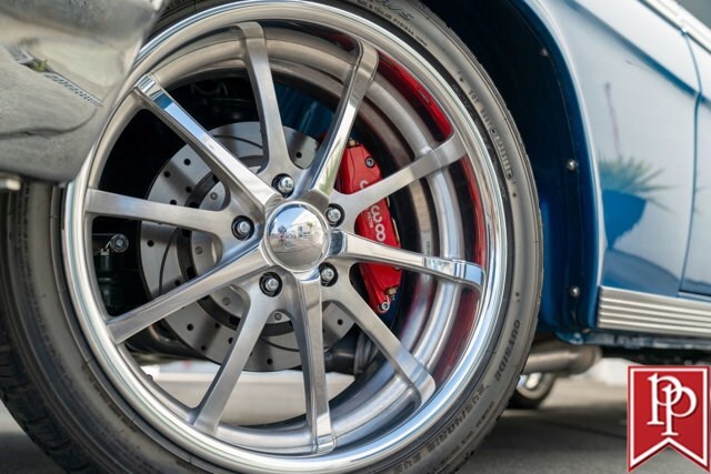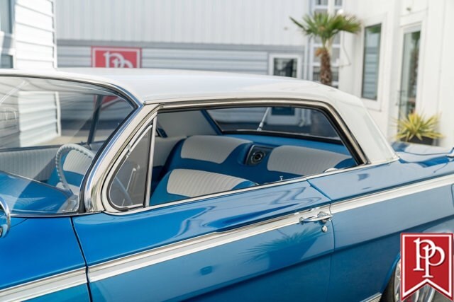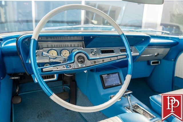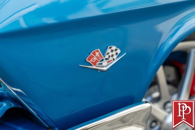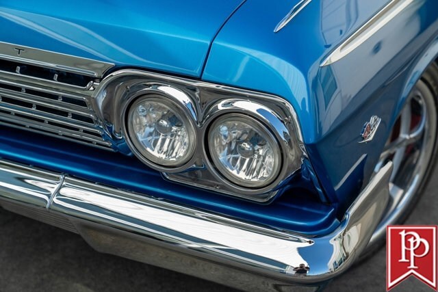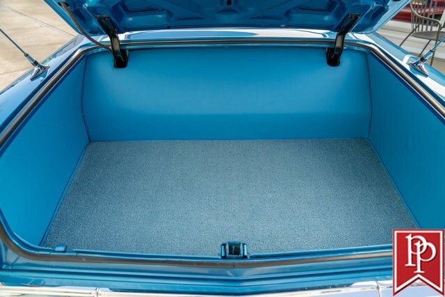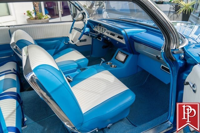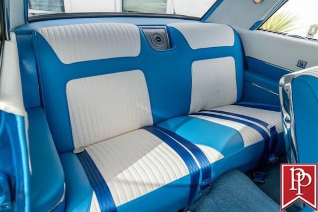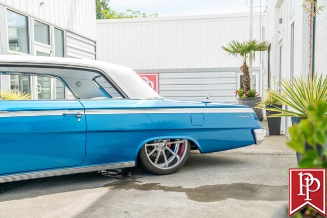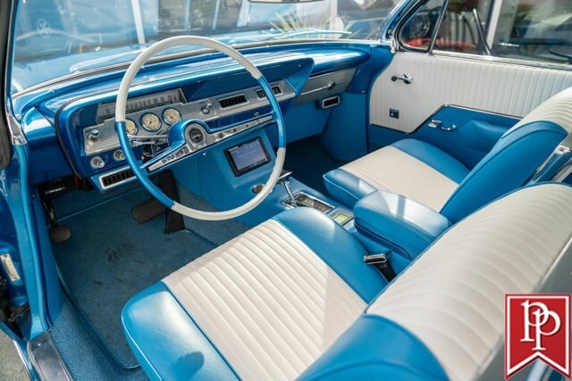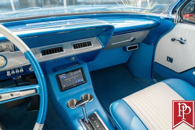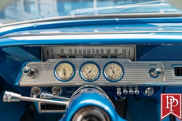 Finished in Electric Blue Metallic with a white roof, this car was subject to a complete frame-off restoration between 2012 and 2015 by local enthusiast Rich Hinrichs. While the car was pulled apart, considerable time was spent getting the body dialed in, now featuring excellent panel gaps, and the glossy paint was laid down to a show-car finish. This was then paired with a set of staggered 19-inch front/20-inch rear Billet Specialties wheels, which show off the 4-wheel Wilwood disc brakes that sit behind them. One of the things this era of Impala became notorious for was the use of hydraulic suspensions that allowed the car to bounce or drive with only 3 wheels on the road. Although this car doesn’t have that sort of system, a Ridetech air suspension has been installed with a 5-gallon “Airpod” in the trunk which allows you to drop the car to the ground when you show up at a car show, but then raise the car up to then drive home.