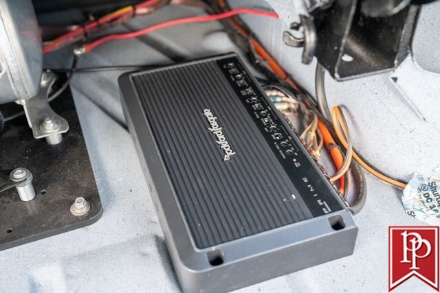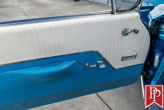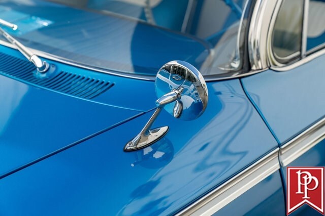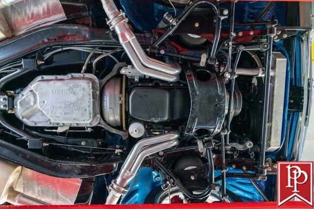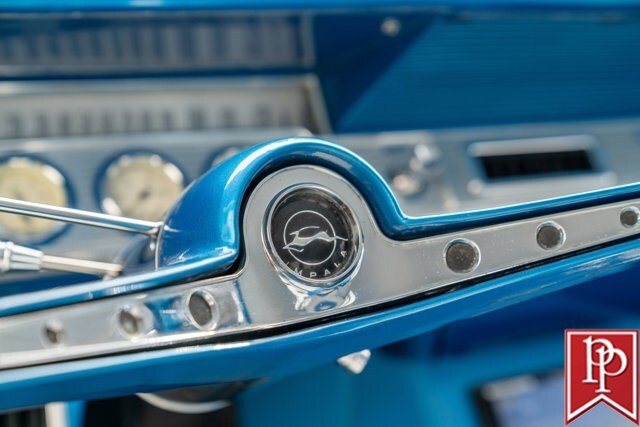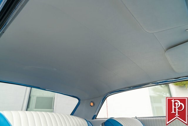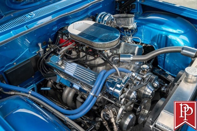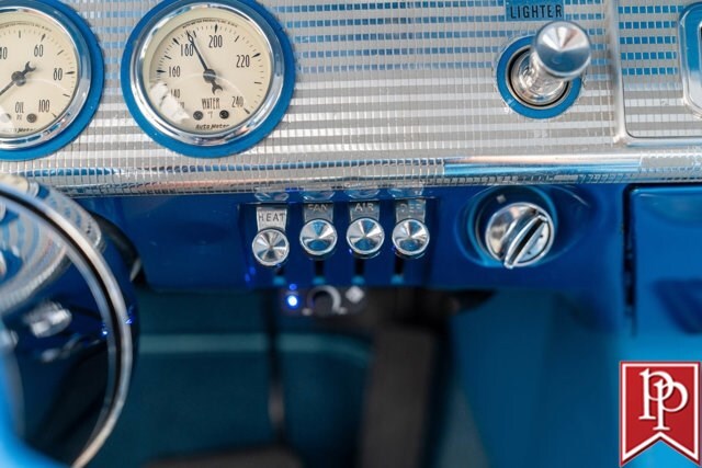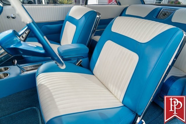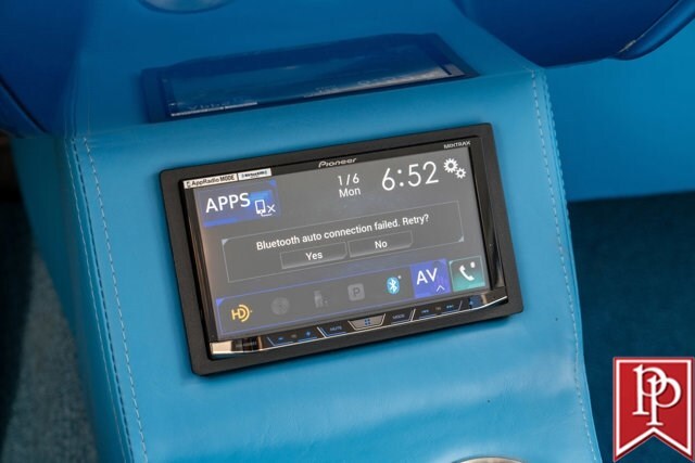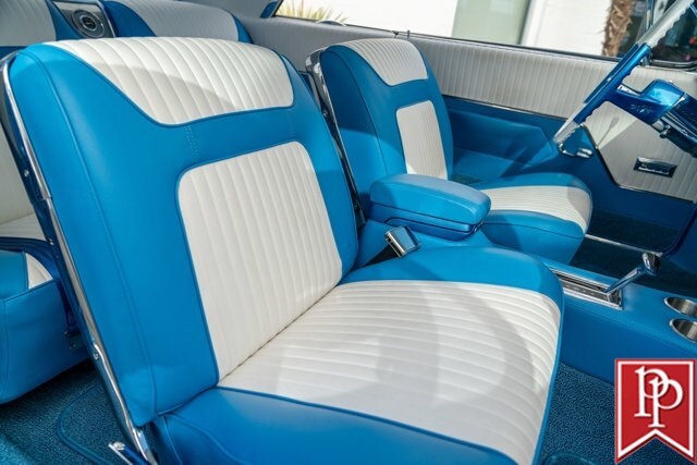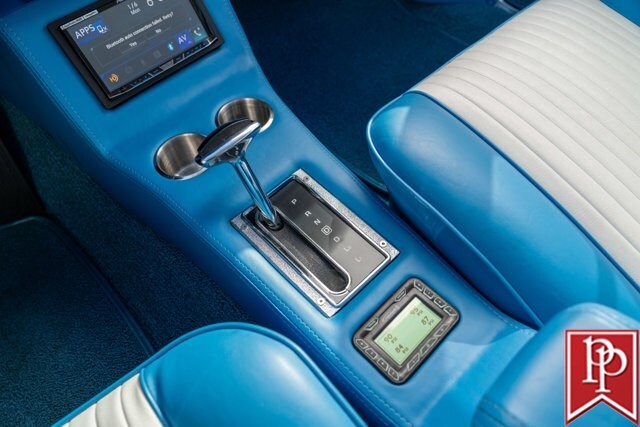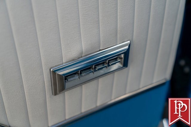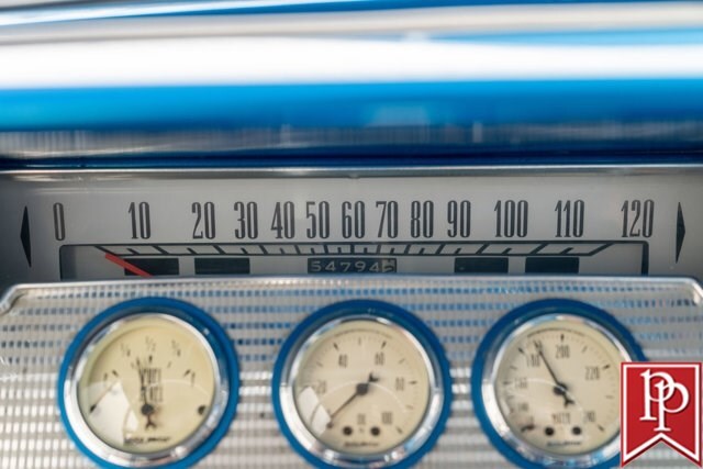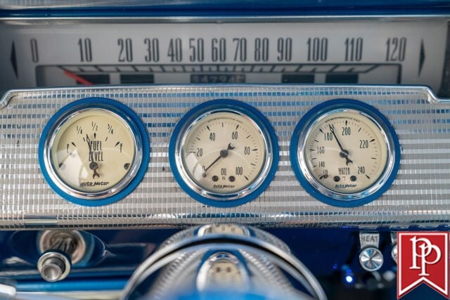 The interior has been totally reupholstered to match the striking exterior, in blue and white two-tone vinyl. Open the door and it is a stunning look, with even the 2-spoke original steering wheel refinished to match. A trio of small AutoMeter gauges sit in front of the driver, and a center console has been crafted which gives a place to mount the Pioneer head unit (with backup camera) and a pair of cup holders. A Vintage Air air conditioning system has been installed, as have power windows and power locks.
