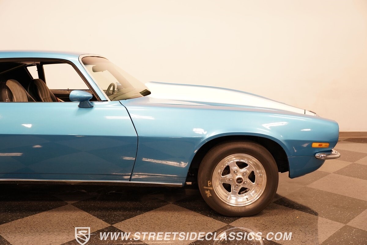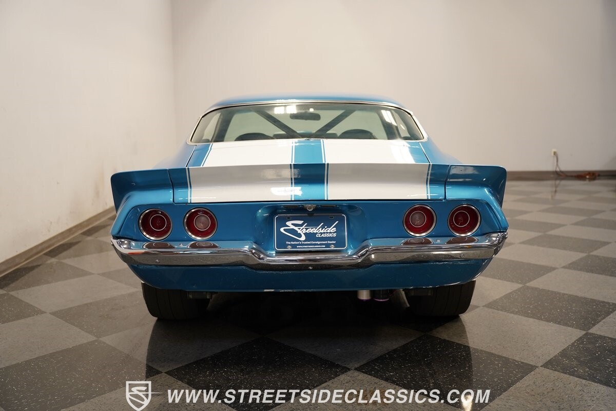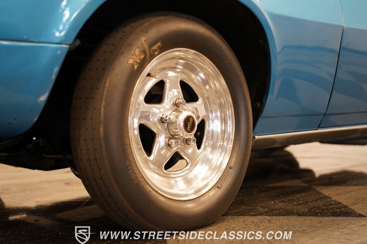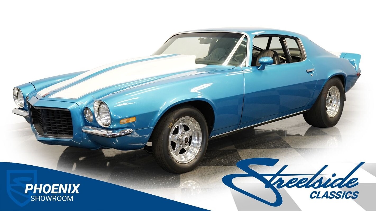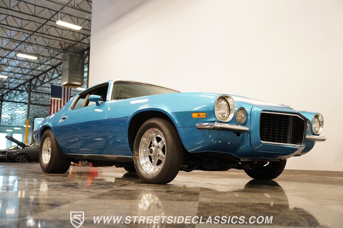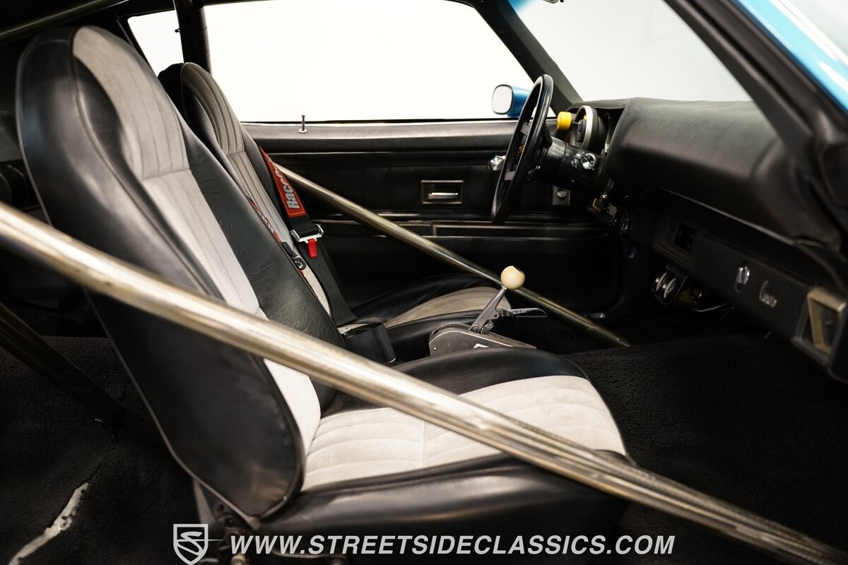The exterior of this 1973 Chevrolet Camaro Pro Street has an attractive and aggressive style you love. The blue paint is an upgrade with the right gloss and shine you'd want if you had a cruiser. And this even has been upgraded with an iconic Rally Sport split-bumper front end. But while this respects its history, you know what it really loves to do is own the dragstrip. The big cowl hood lets you know there's something extra mean underneath. And the 15-inch Weld Racing wheels have that ideal small tire setup with the skinny rubber up front and the tubbed rear with massive rear Mickey Thompsons showing off a true pro street stance. And the interior has competition-ready pieces, like the racing harnesses, rear seat delete, ratchet shifter, and a proper race cage that all signal this one wants to get down to speedy business. And you're definitely going to want to spend some extra time digging into the details of the 496 V8 big block powerhouse. It's all about having one of the sharpest-looking quarter-mile kings out there.
