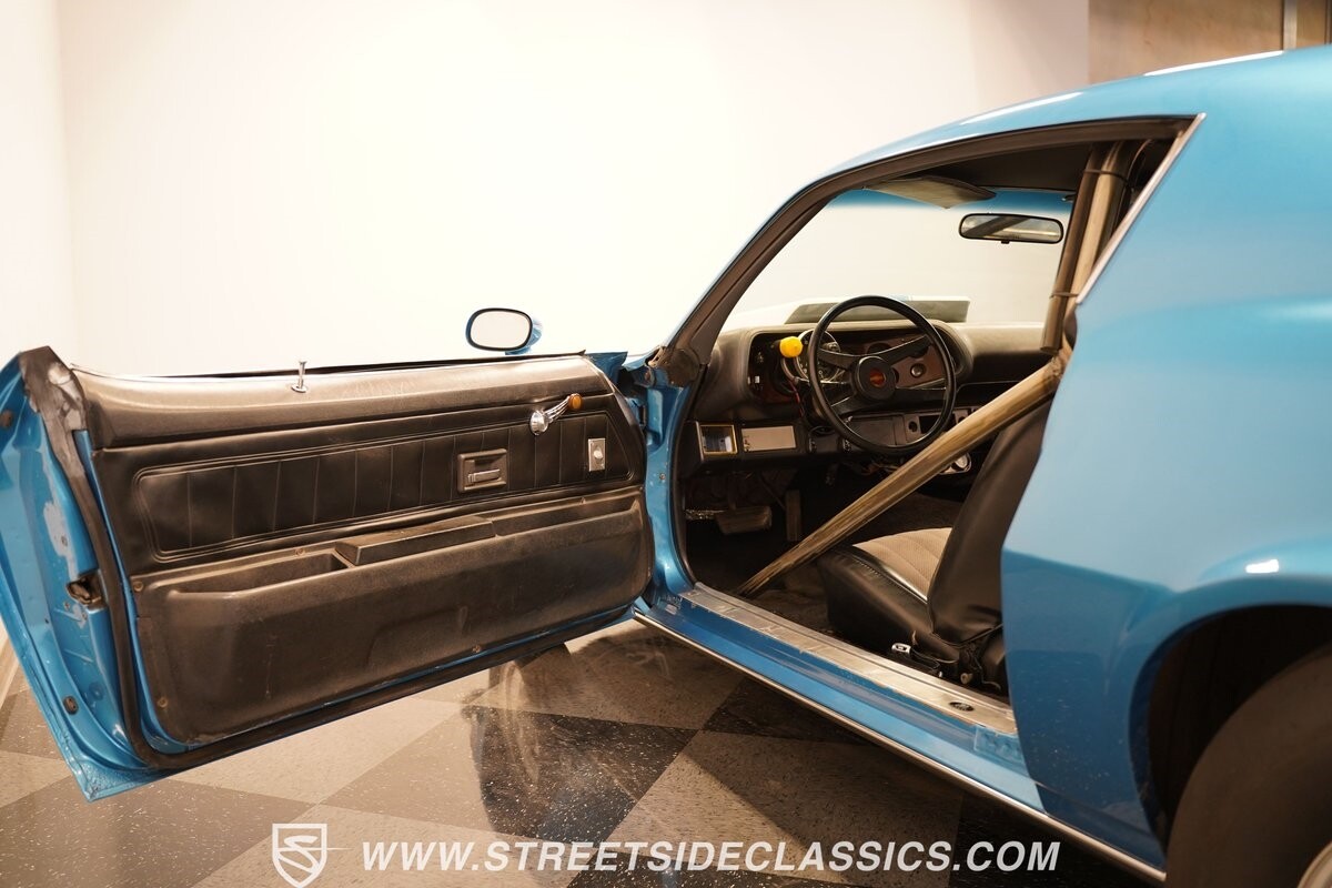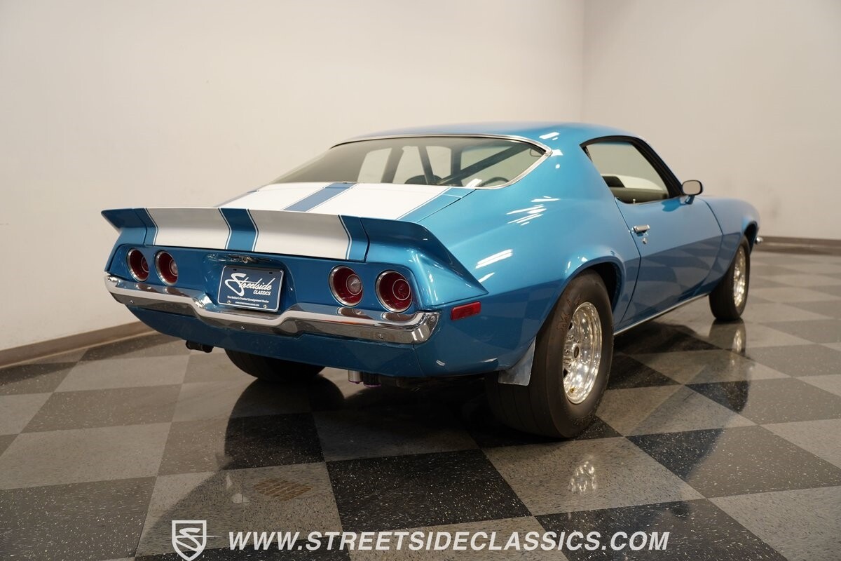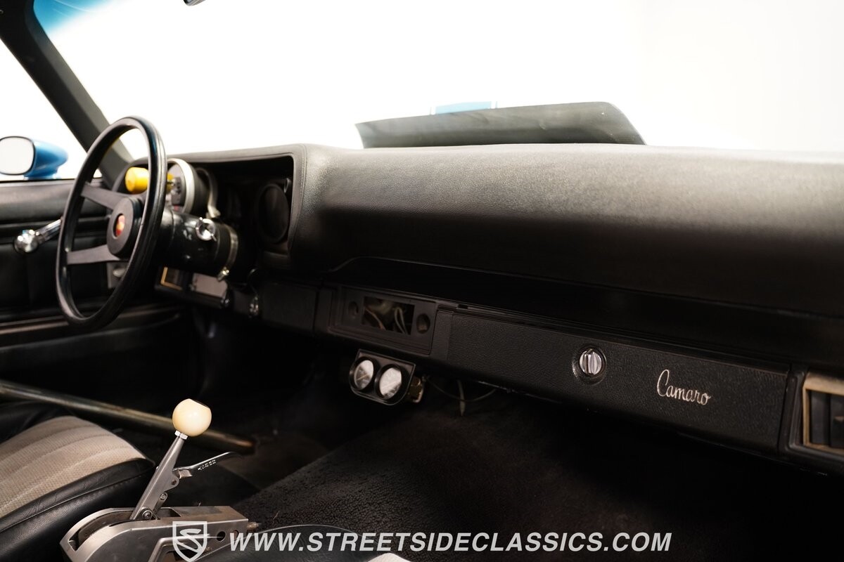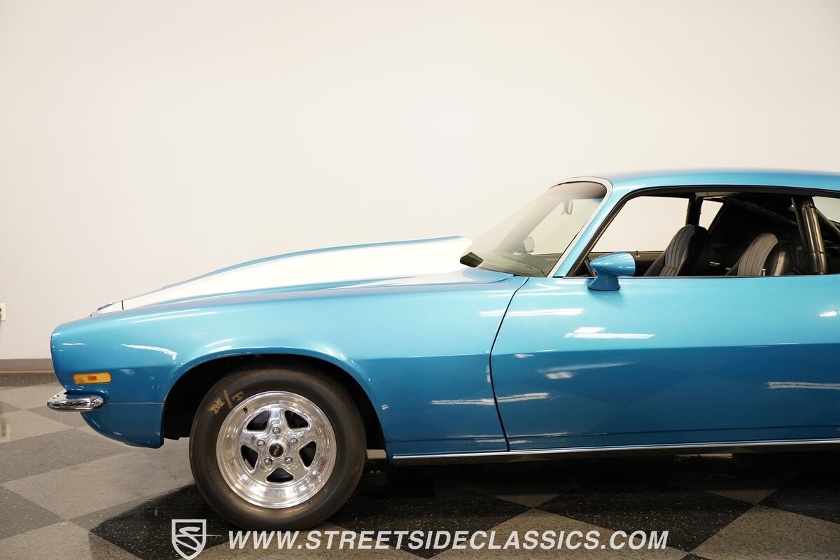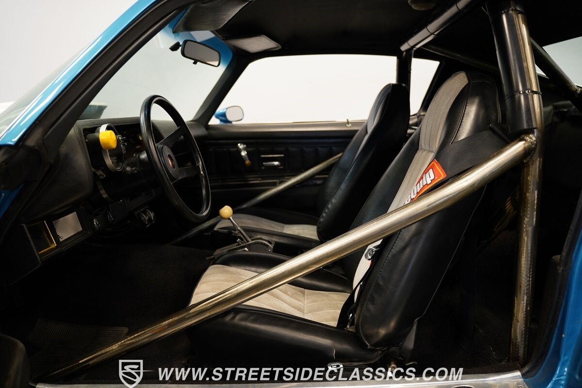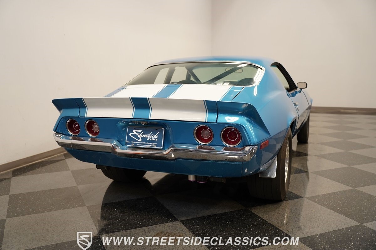 The exterior of this 1973 Chevrolet Camaro Pro Street has an attractive and aggressive style you love. The blue paint is an upgrade with the right gloss and shine you'd want if you had a cruiser. And this even has been upgraded with an iconic Rally Sport split-bumper front end. But while this respects its history, you know what it really loves to do is own the dragstrip. The big cowl hood lets you know there's something extra mean underneath. And the 15-inch Weld Racing wheels have that ideal small tire setup with the skinny rubber up front and the tubbed rear with massive rear Mickey Thompsons showing off a true pro street stance. And the interior has competition-ready pieces, like the racing harnesses, rear seat delete, ratchet shifter, and a proper race cage that all signal this one wants to get down to speedy business. And you're definitely going to want to spend some extra time digging into the details of the 496 V8 big block powerhouse. It's all about having one of the sharpest-looking quarter-mile kings out there.