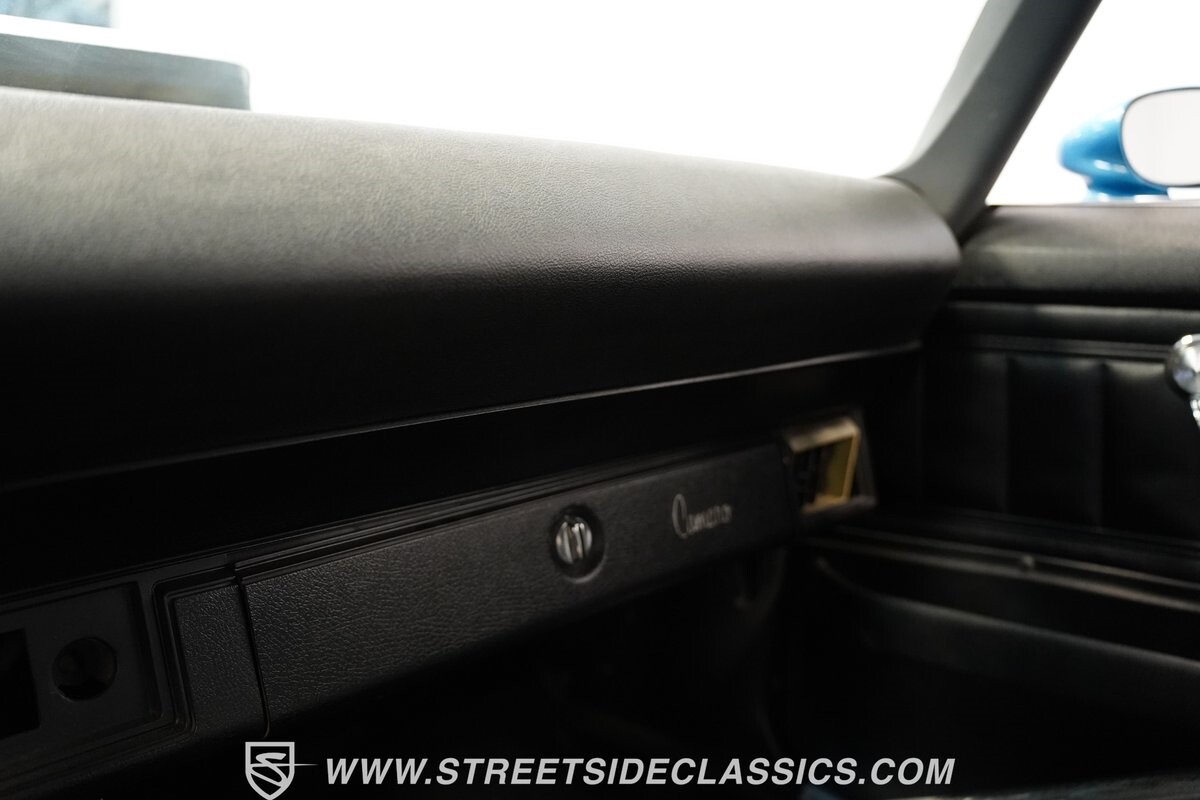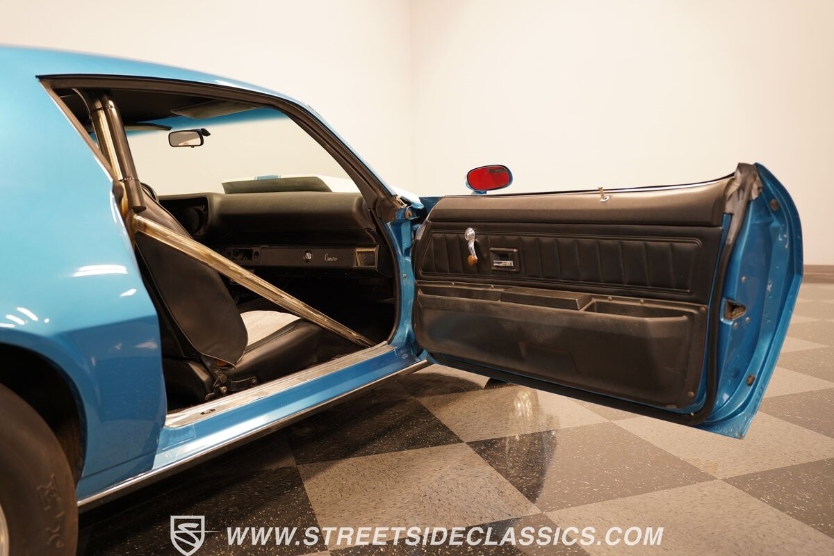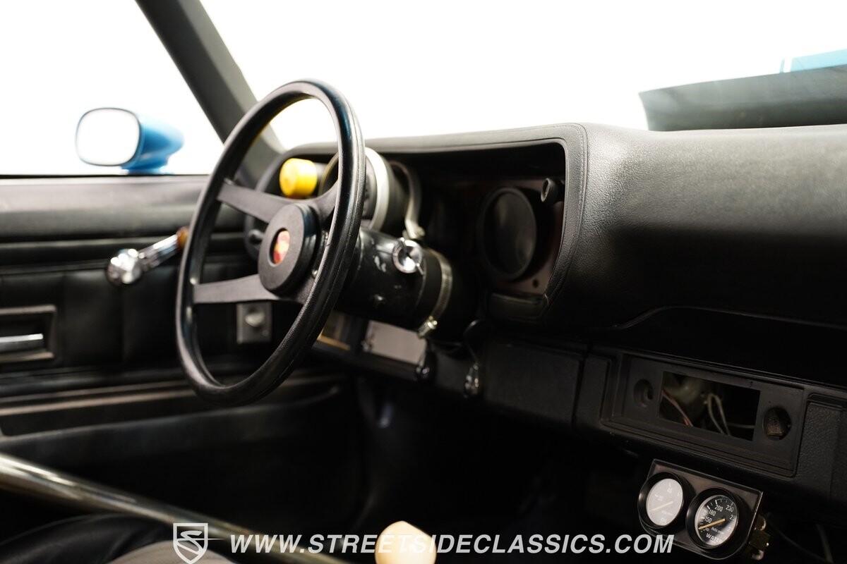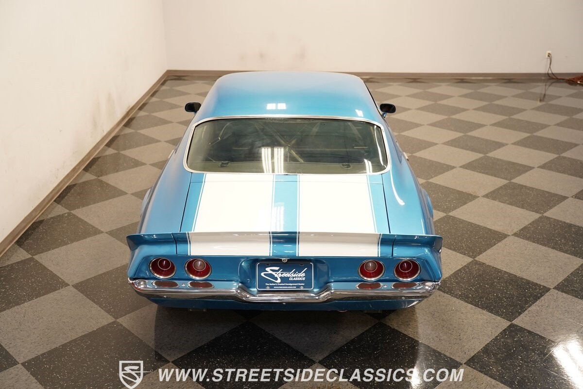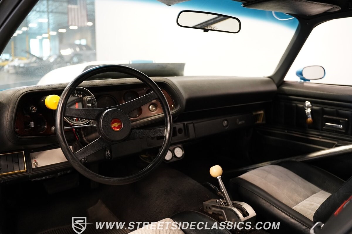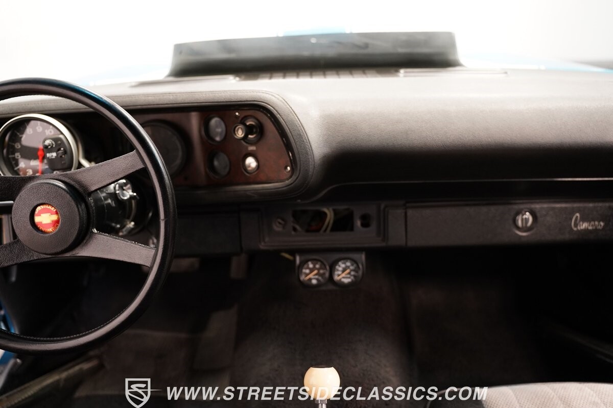 The exterior of this 1973 Chevrolet Camaro Pro Street has an attractive and aggressive style you love. The blue paint is an upgrade with the right gloss and shine you'd want if you had a cruiser. And this even has been upgraded with an iconic Rally Sport split-bumper front end. But while this respects its history, you know what it really loves to do is own the dragstrip. The big cowl hood lets you know there's something extra mean underneath. And the 15-inch Weld Racing wheels have that ideal small tire setup with the skinny rubber up front and the tubbed rear with massive rear Mickey Thompsons showing off a true pro street stance. And the interior has competition-ready pieces, like the racing harnesses, rear seat delete, ratchet shifter, and a proper race cage that all signal this one wants to get down to speedy business. And you're definitely going to want to spend some extra time digging into the details of the 496 V8 big block powerhouse. It's all about having one of the sharpest-looking quarter-mile kings out there.