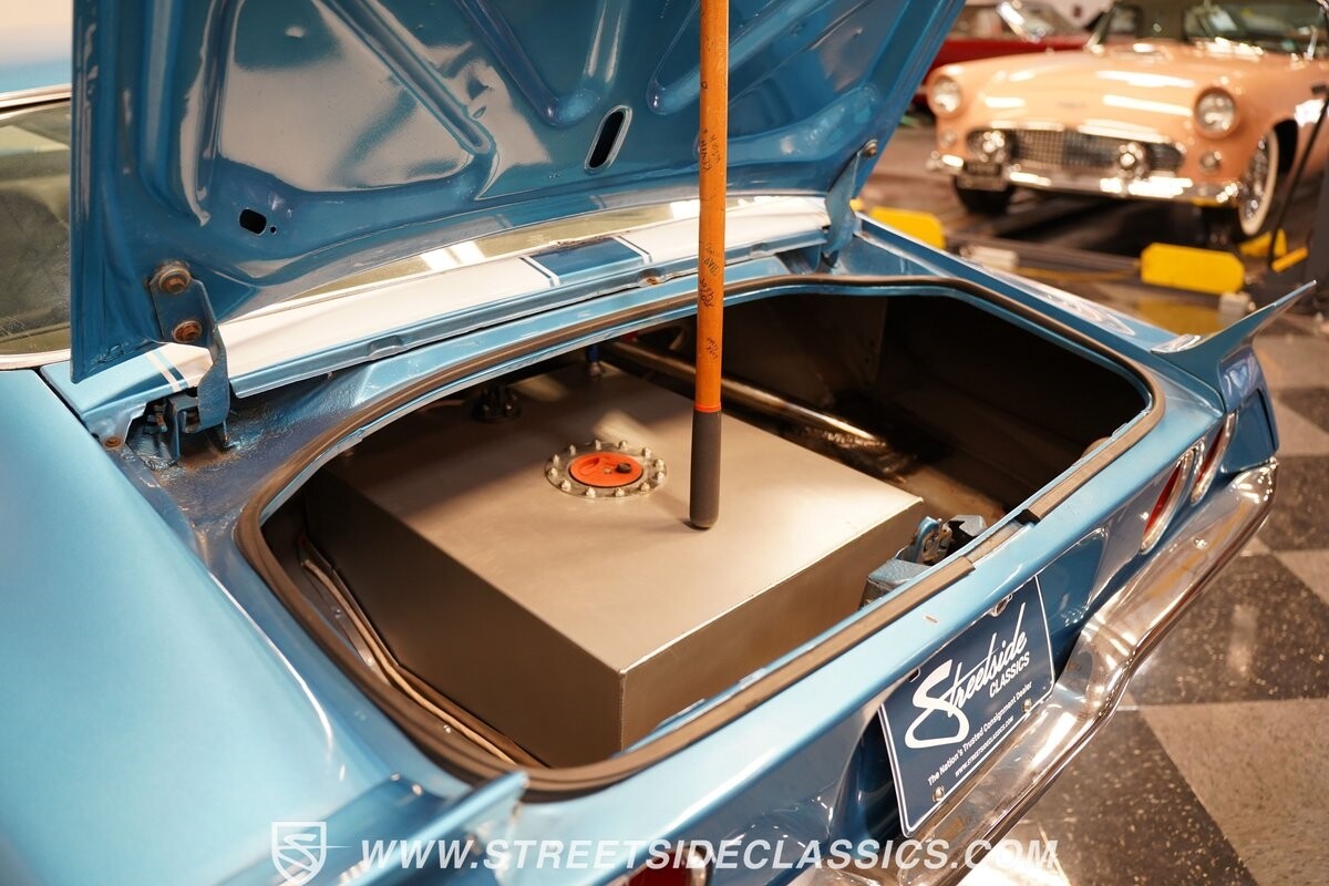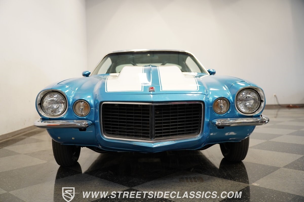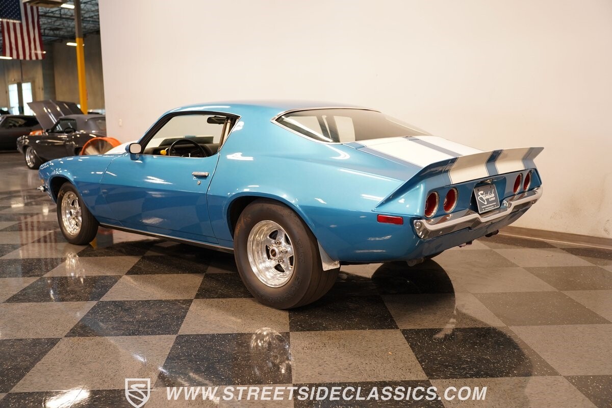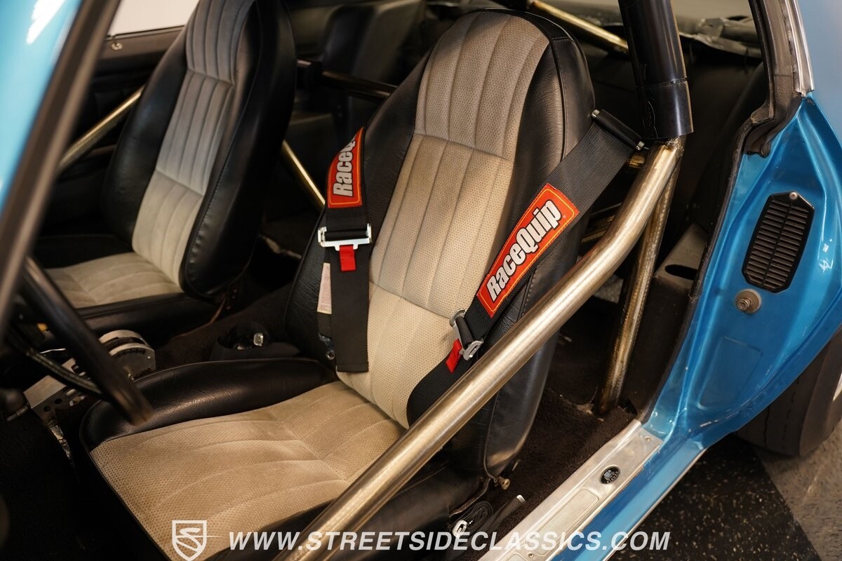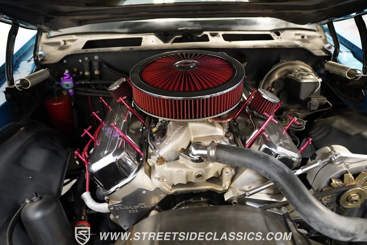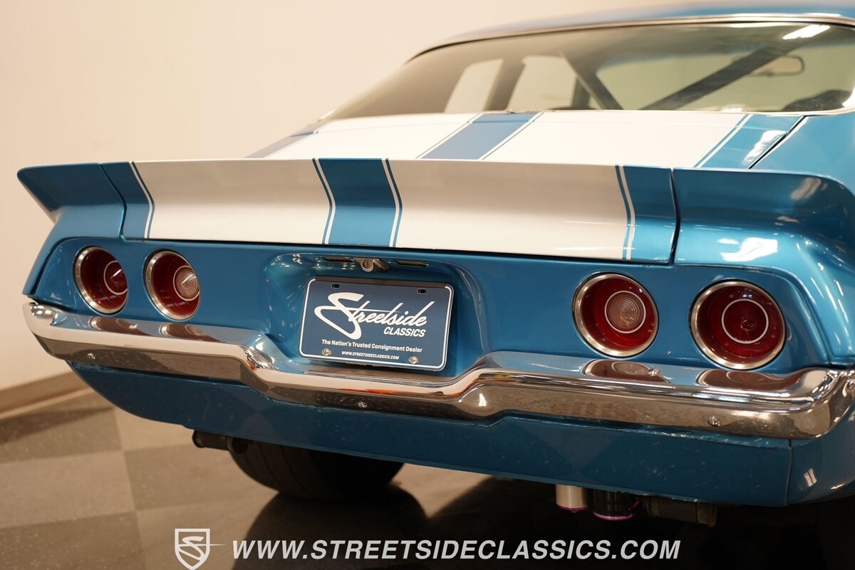 The exterior of this 1973 Chevrolet Camaro Pro Street has an attractive and aggressive style you love. The blue paint is an upgrade with the right gloss and shine you'd want if you had a cruiser. And this even has been upgraded with an iconic Rally Sport split-bumper front end. But while this respects its history, you know what it really loves to do is own the dragstrip. The big cowl hood lets you know there's something extra mean underneath. And the 15-inch Weld Racing wheels have that ideal small tire setup with the skinny rubber up front and the tubbed rear with massive rear Mickey Thompsons showing off a true pro street stance. And the interior has competition-ready pieces, like the racing harnesses, rear seat delete, ratchet shifter, and a proper race cage that all signal this one wants to get down to speedy business. And you're definitely going to want to spend some extra time digging into the details of the 496 V8 big block powerhouse. It's all about having one of the sharpest-looking quarter-mile kings out there.