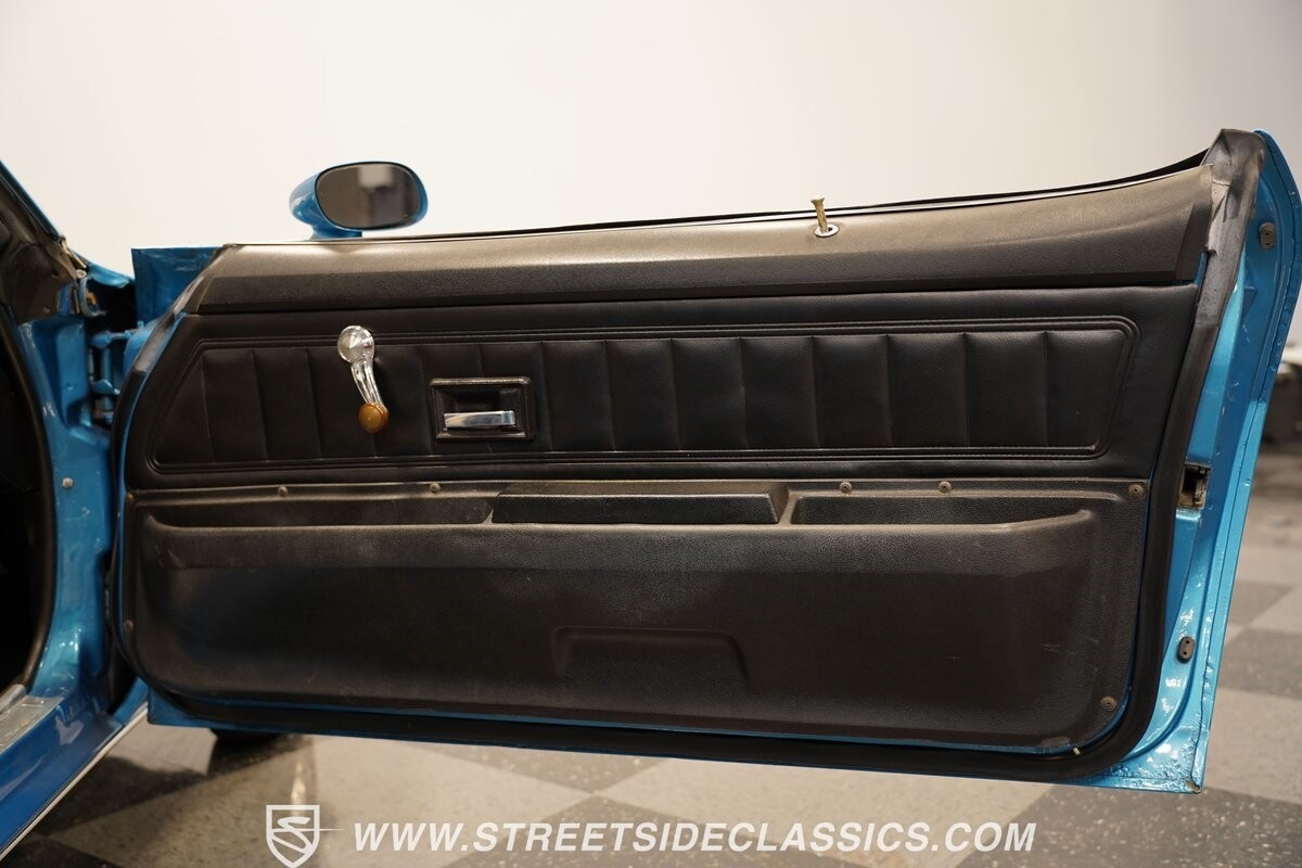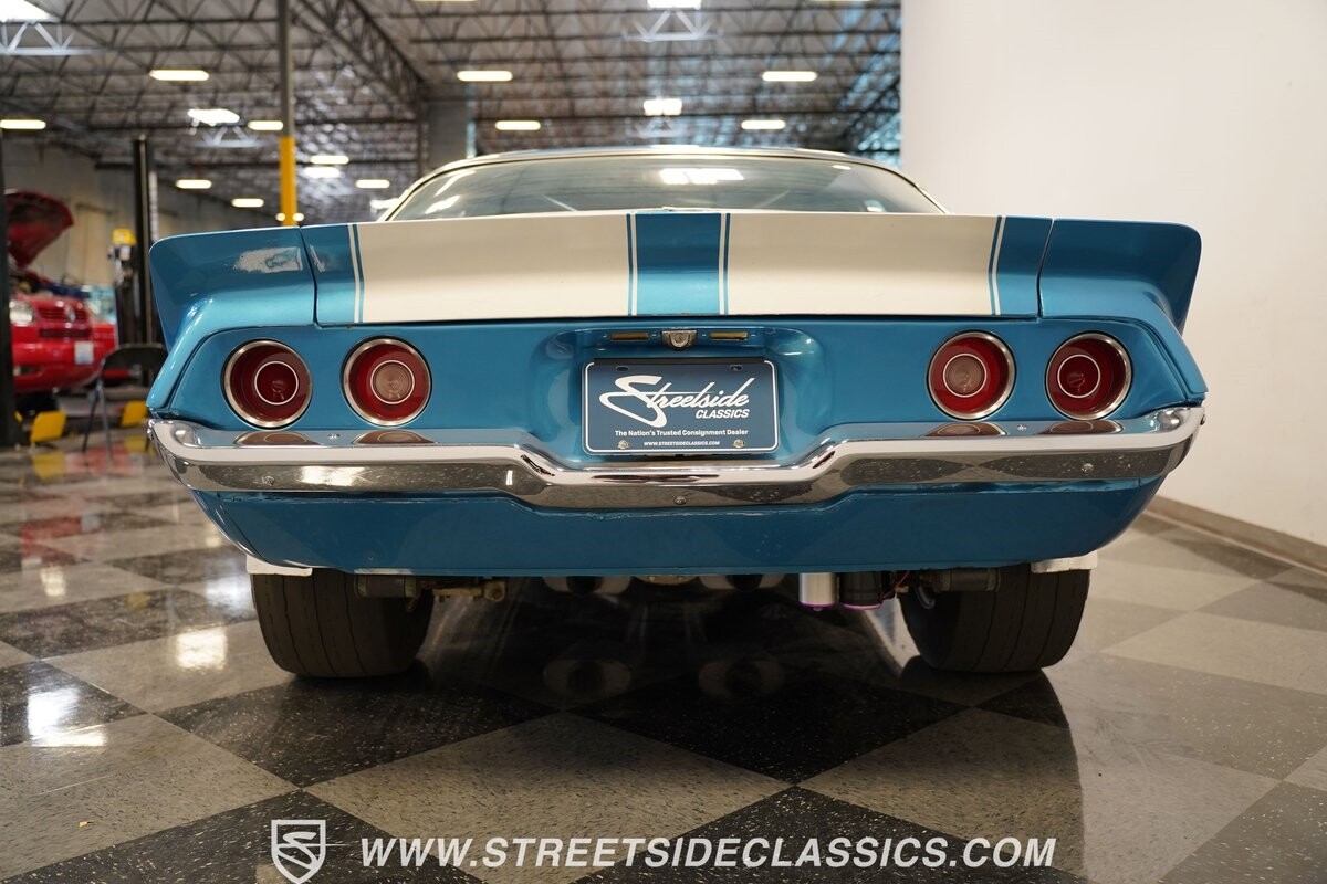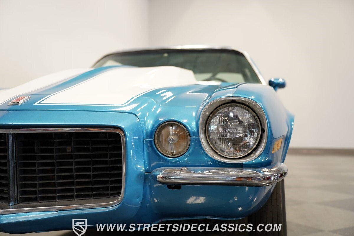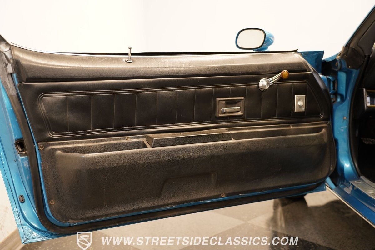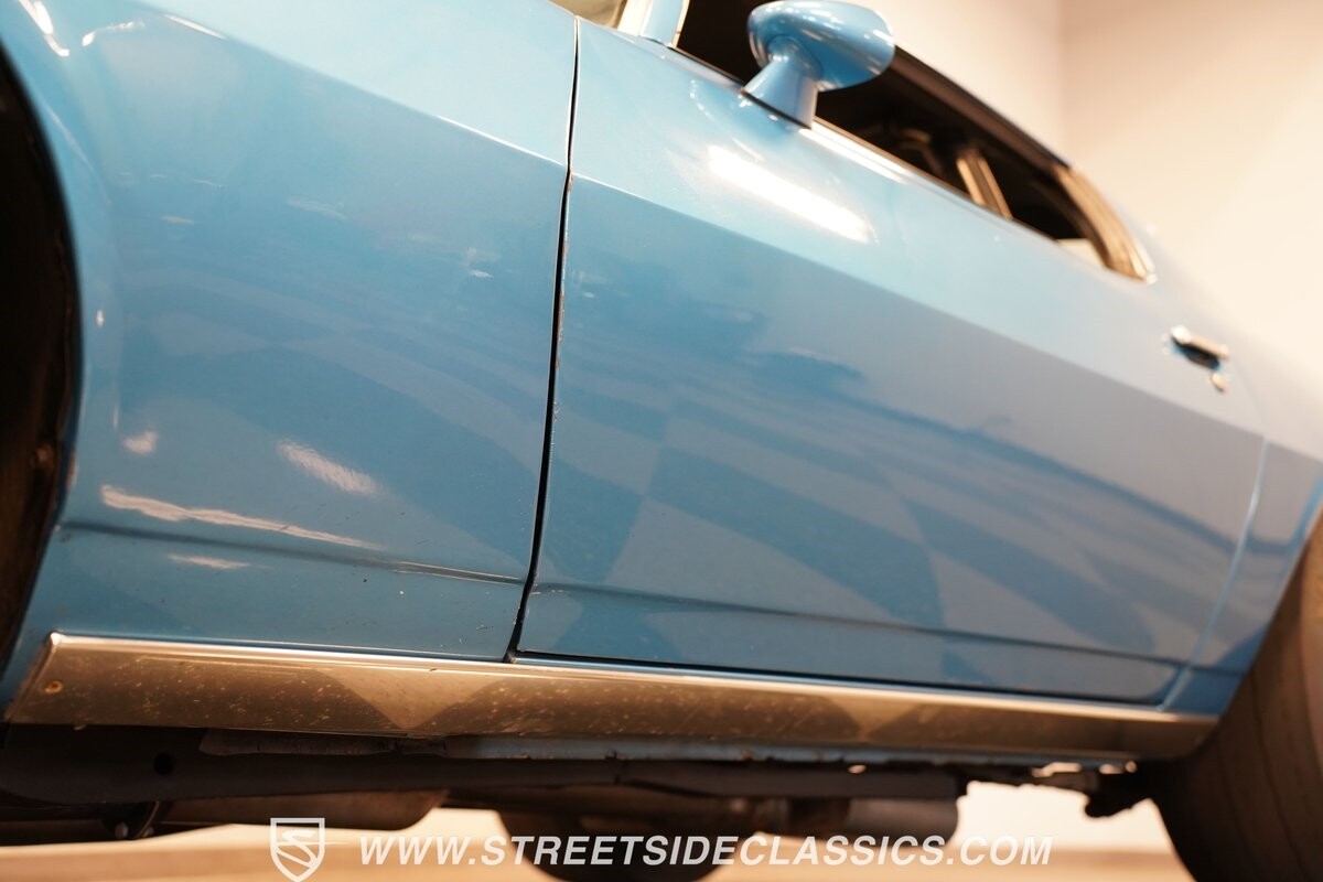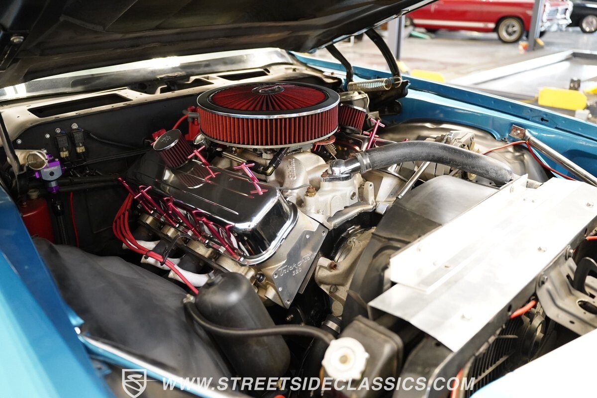 The exterior of this 1973 Chevrolet Camaro Pro Street has an attractive and aggressive style you love. The blue paint is an upgrade with the right gloss and shine you'd want if you had a cruiser. And this even has been upgraded with an iconic Rally Sport split-bumper front end. But while this respects its history, you know what it really loves to do is own the dragstrip. The big cowl hood lets you know there's something extra mean underneath. And the 15-inch Weld Racing wheels have that ideal small tire setup with the skinny rubber up front and the tubbed rear with massive rear Mickey Thompsons showing off a true pro street stance. And the interior has competition-ready pieces, like the racing harnesses, rear seat delete, ratchet shifter, and a proper race cage that all signal this one wants to get down to speedy business. And you're definitely going to want to spend some extra time digging into the details of the 496 V8 big block powerhouse. It's all about having one of the sharpest-looking quarter-mile kings out there.