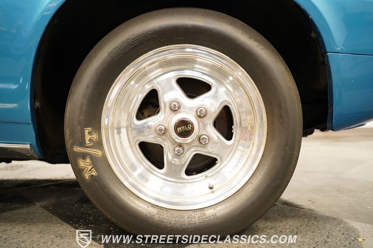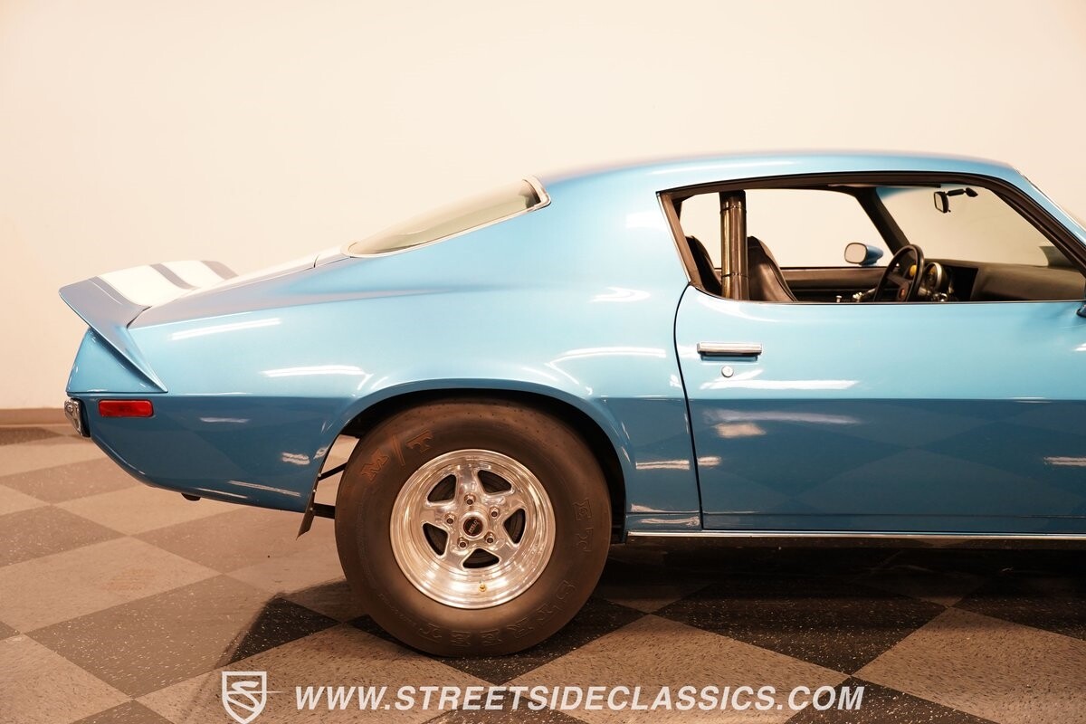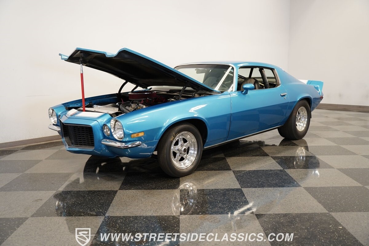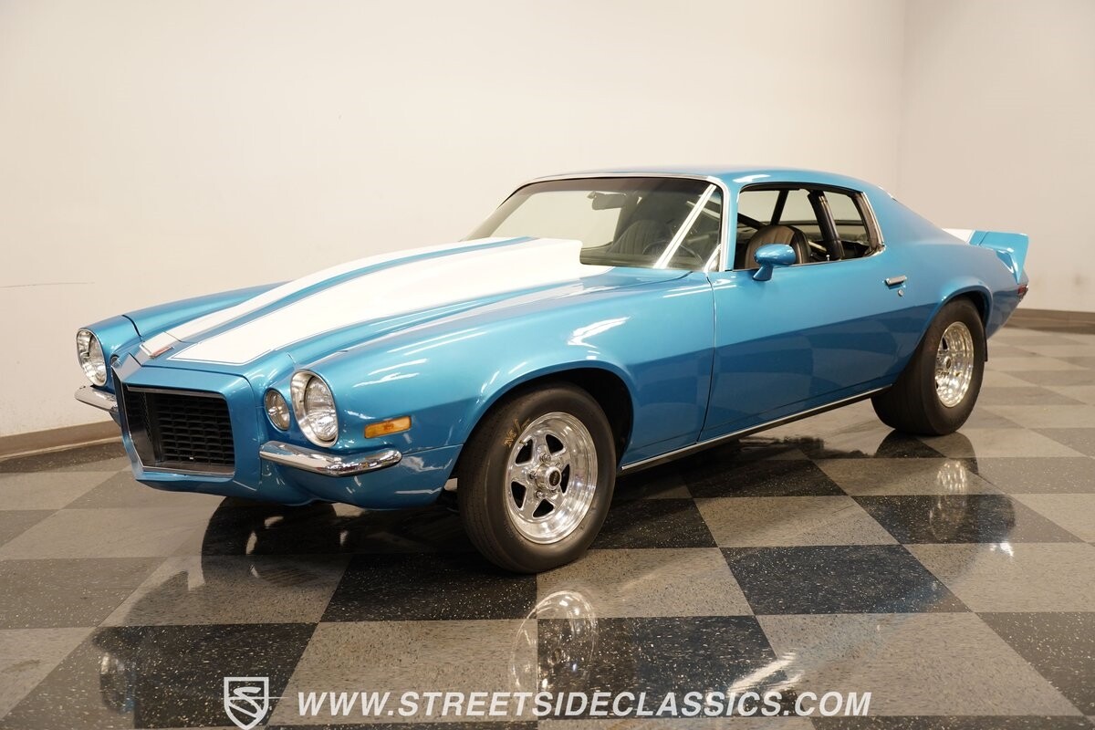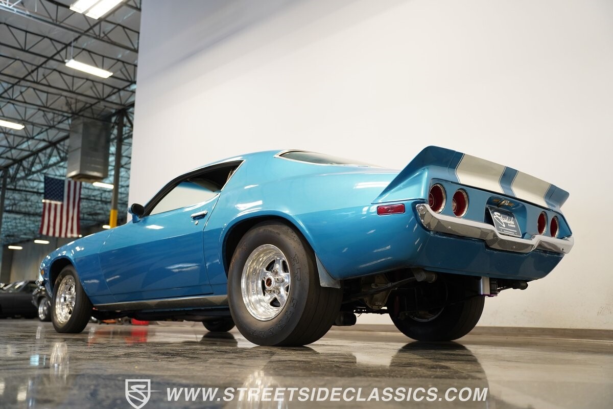 The power of this Camaro is understood in the way you hear it often even before you see it. But this coupe still likes to respect its classic Camaro history with the proper RS-style split-bumper front end, three-piece rear spoiler, and painted Z/28 racing stripes. Even the shade of blue looks correct for 1973. We're not saying that this quarter-mile king is trying to go incognito, but as you look through this full pro street package, it's nice to see the right history mixed in with the street/strip owning attitude. So if you're looking for a competition car with plenty of vintage flair, this is the one. Call today!!!