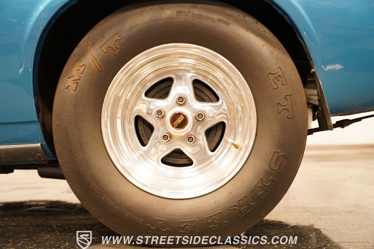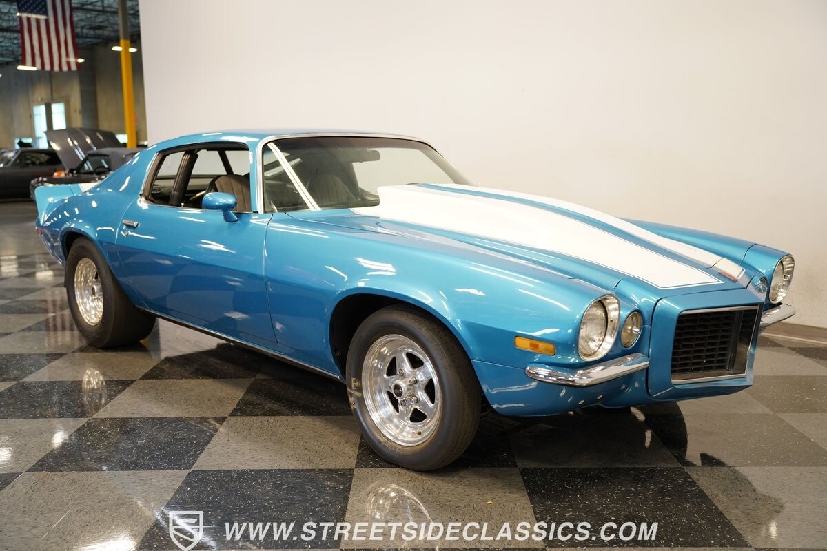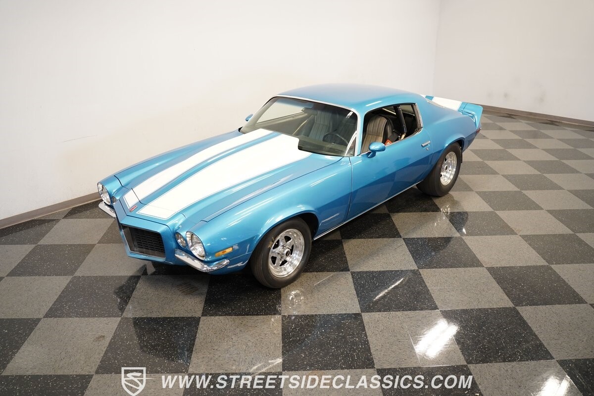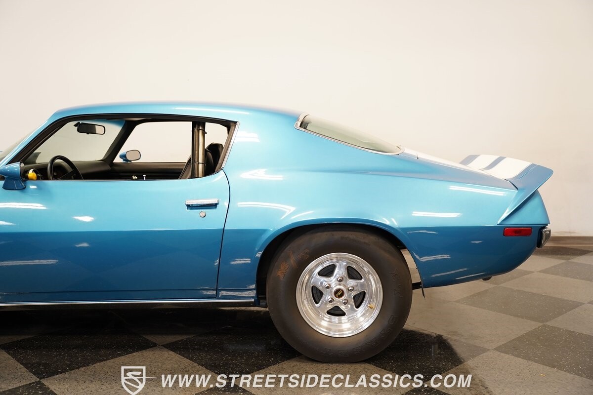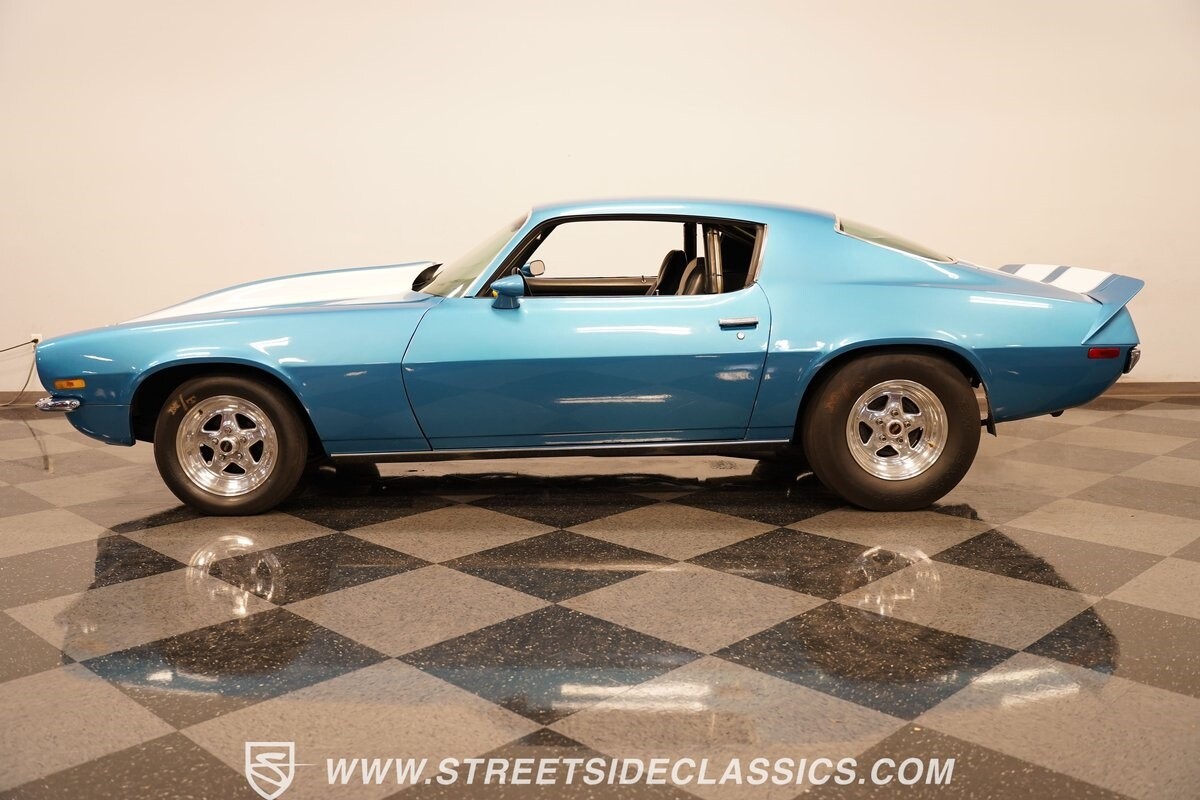 The power of this Camaro is understood in the way you hear it often even before you see it. But this coupe still likes to respect its classic Camaro history with the proper RS-style split-bumper front end, three-piece rear spoiler, and painted Z/28 racing stripes. Even the shade of blue looks correct for 1973. We're not saying that this quarter-mile king is trying to go incognito, but as you look through this full pro street package, it's nice to see the right history mixed in with the street/strip owning attitude. So if you're looking for a competition car with plenty of vintage flair, this is the one. Call today!!!