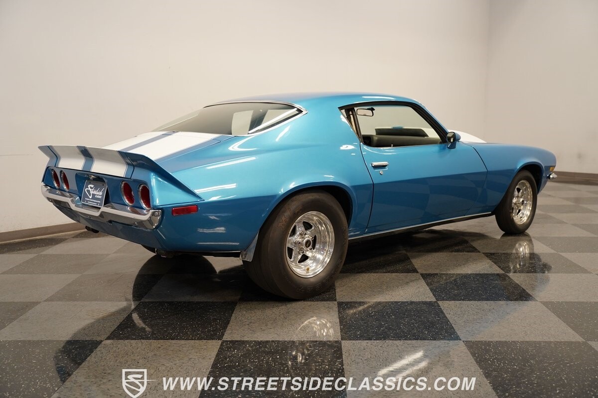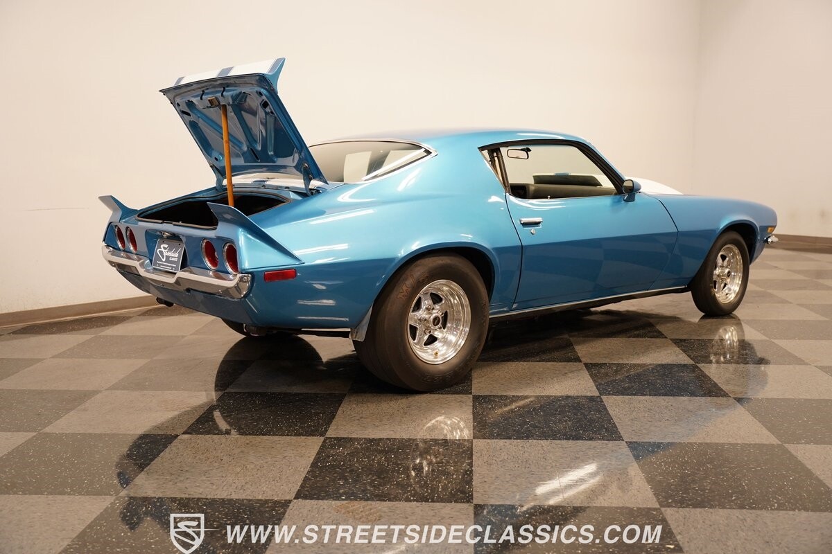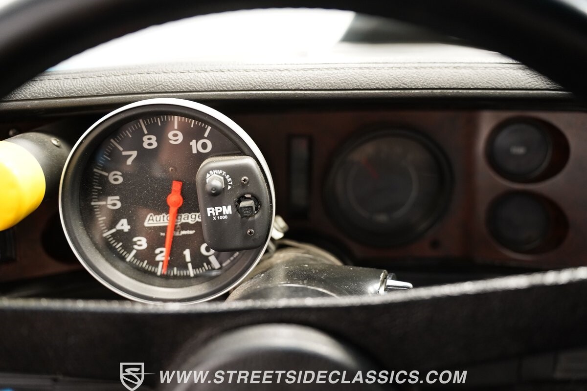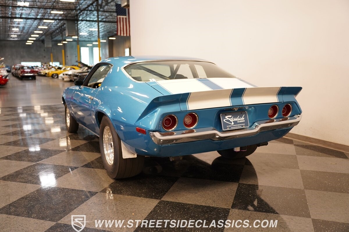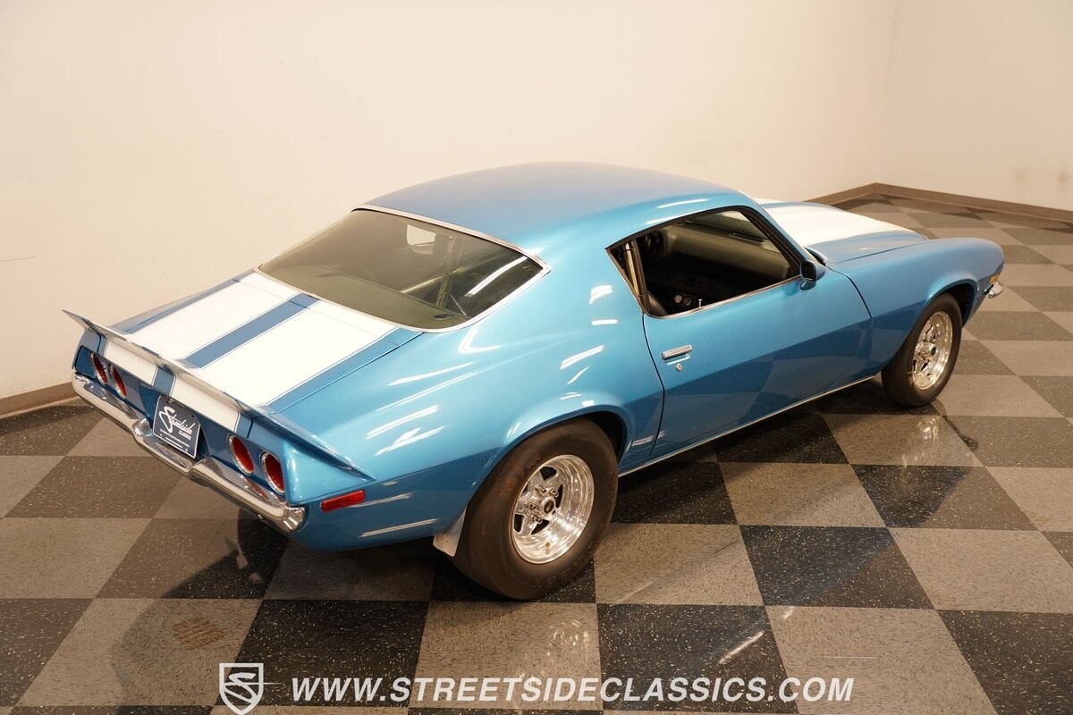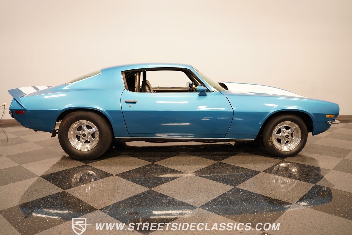 The power of this Camaro is understood in the way you hear it often even before you see it. But this coupe still likes to respect its classic Camaro history with the proper RS-style split-bumper front end, three-piece rear spoiler, and painted Z/28 racing stripes. Even the shade of blue looks correct for 1973. We're not saying that this quarter-mile king is trying to go incognito, but as you look through this full pro street package, it's nice to see the right history mixed in with the street/strip owning attitude. So if you're looking for a competition car with plenty of vintage flair, this is the one. Call today!!!