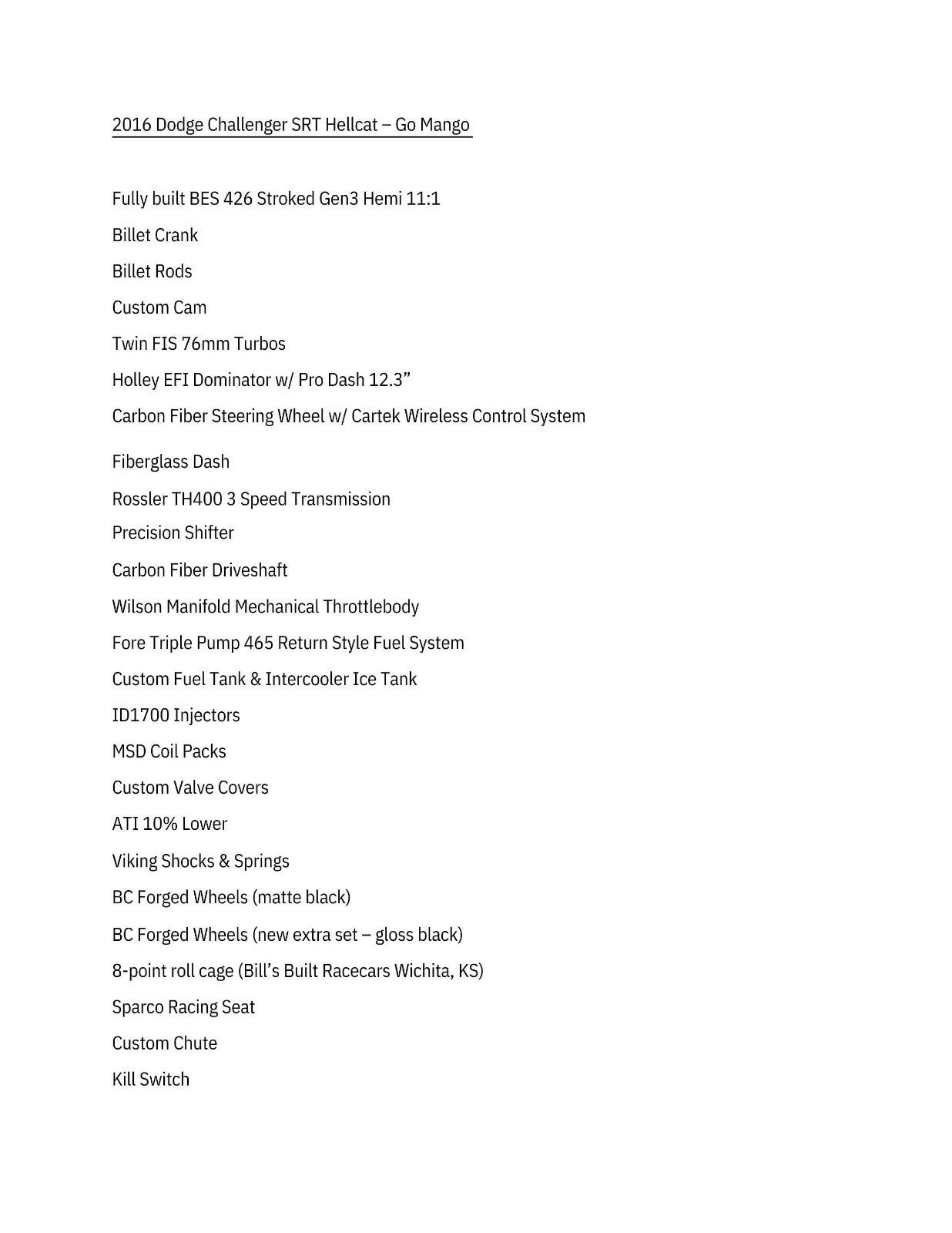 This is one of those special opportunities to own a special car. One owner and completely turnkey for racing. This Hellcat is modified with some of the best racing modifications. It holds several landspeed records including the world's fastest Challenger Hellcat record at 214.8 MPH. Several thousand followers across multiple platforms. I retired from racing in December 2023 and just finished the conversion from a supercharged Hemi to a twin turbo Hemi in the early Spring of 2024. Brand new built motor by BES Racing Engines. Gen 3 Hemi 426 stroked 11:1 compression. BES custom cam. It was the first modified Hellcat to run completely standalone on a Holley EFI Dominator ECU. Rossler 3-speed TH400 transmission. Twin 76mm turbos custom built by London Chassis Dyno to fit under the hood. There is so much more. See complete build sheet in gallery. The rear-end is currently geared for landspeed racing, but with a few modifications it could be modified into a drag car. Car starts and runs on existing tune. Runs and sounds great. The engine is fresh and has no track or dyno time. It's an open canvas for the next owner and Holley EFI tuner. I purchased the car new from Davis Moore CDJR in Wichita, KS. It has approximately 5,000 miles as it was quickly converted from a street car to a race car, and has only been trailered since then. 2016 was the second year for the Hellcat and the first year Dodge offered the Go Mango color as an option. The car has been wrapped for most of my racing career so the paint has been preserved. The Go Mango metallic flake looks amazing in person! Title in hand, original window sticker, and ready for it's new home. Car is located in Wichita, KS and will need to be transported by trailer. It is currently wrapped and can arrange to have it removed prior to pickup. Don't miss the opportunity to own one of the baddest Hellcats around! Full build sheet attachedVehicle Details