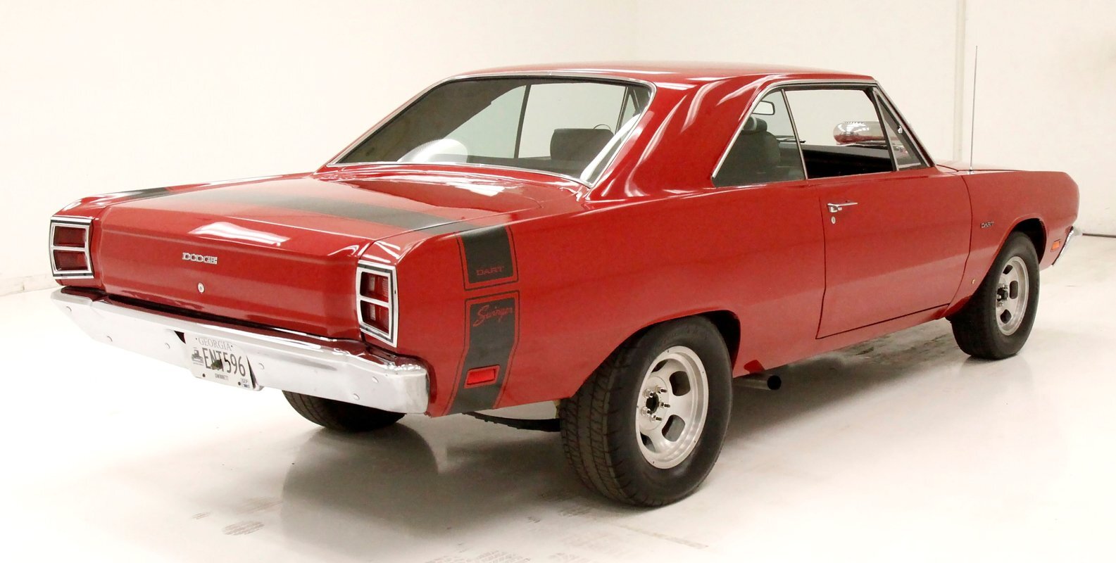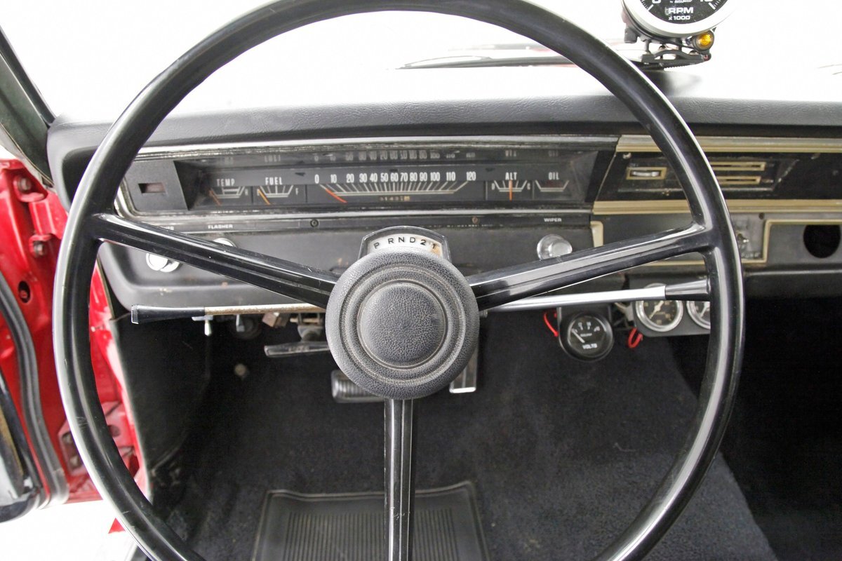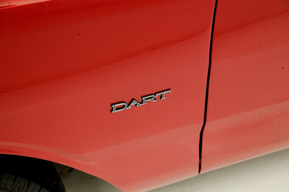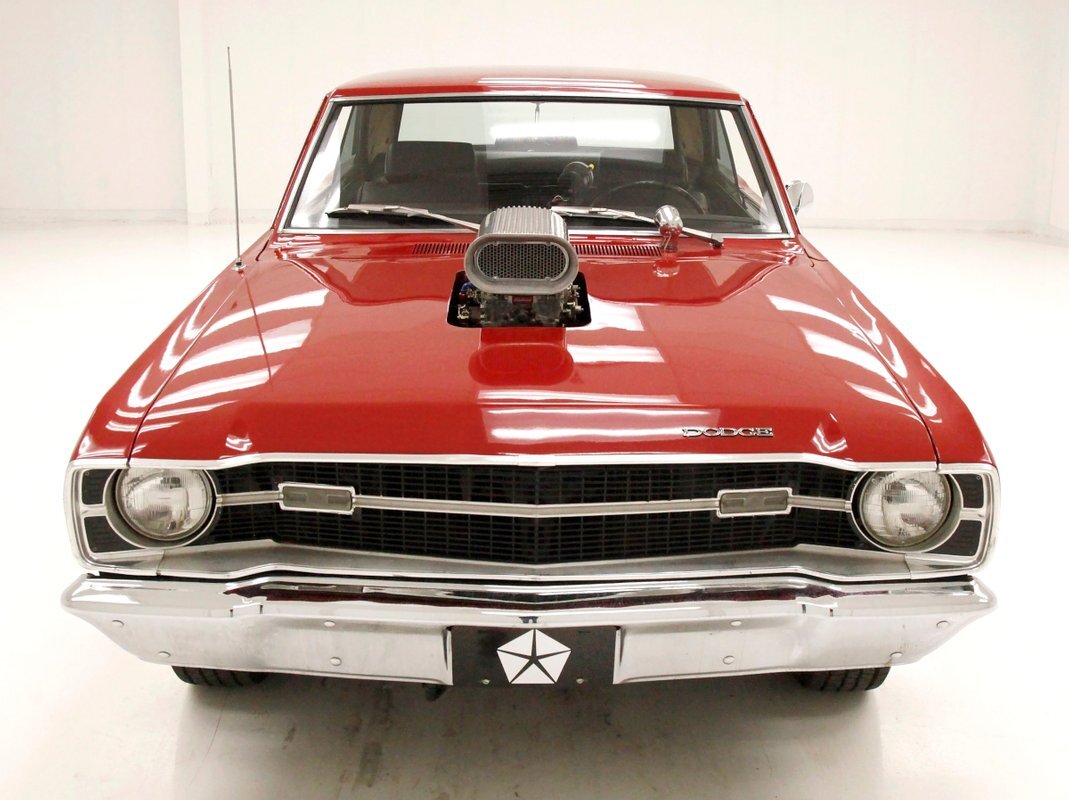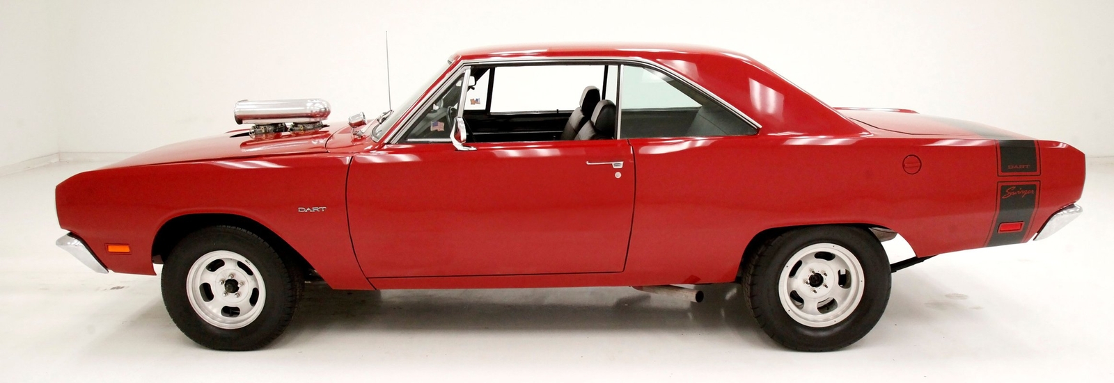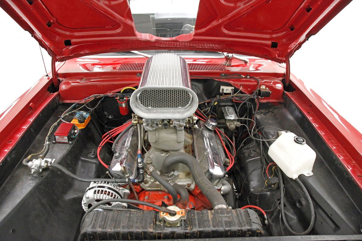What is a respray of red covers the exterior of this car. It works in unison with newly chromed trimmings and bumpers. It has a cut out in the hood for the tunnel ram to be shown through its midsection. Factory tinted glass is on, the grille has been restored to original, and lines are straight as arrows. The original hood comes with the car as well, but will require a shipping expense from our consignor's house to you. On a slightly jacked back suspension we see a black wrap around stripe with a Swinger cut out that also sports DART on its top. Angled tail lighting is on the back just above another perfectly shiny rear bumper. Wheels are 14 and 15-inch respectively aluminum slots and are wrapped with 225/70R14's in front and 275/60R15's on back. Badging is all beautiful, as are handles and remaining brite work. An unscathed red metal top is present. Looking into the trunk you will be able to view the invasive rust free trunk floor along with a selection of exterior trim and the relocated battery.