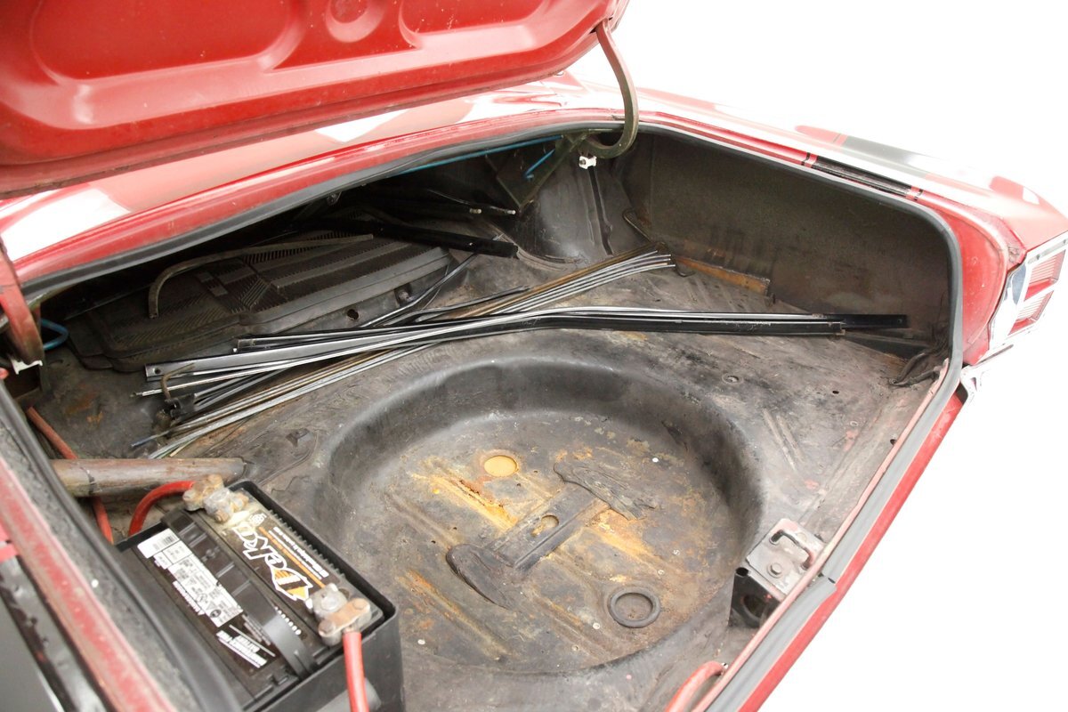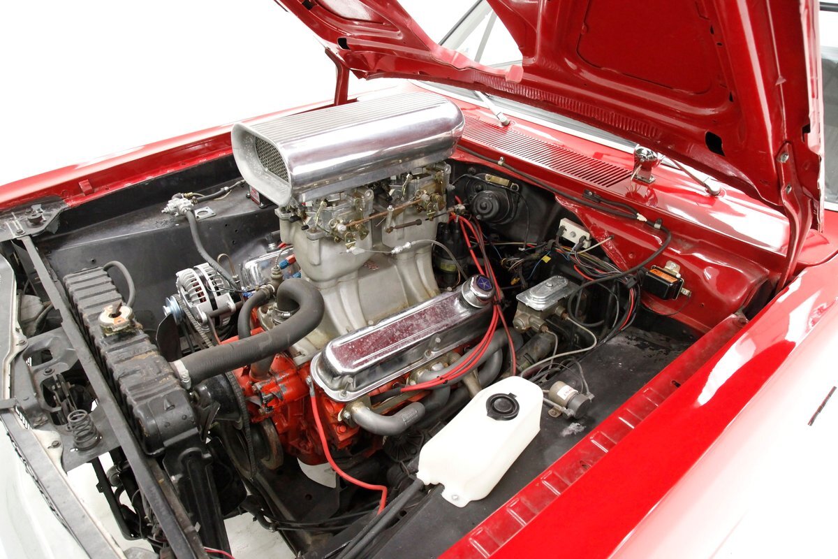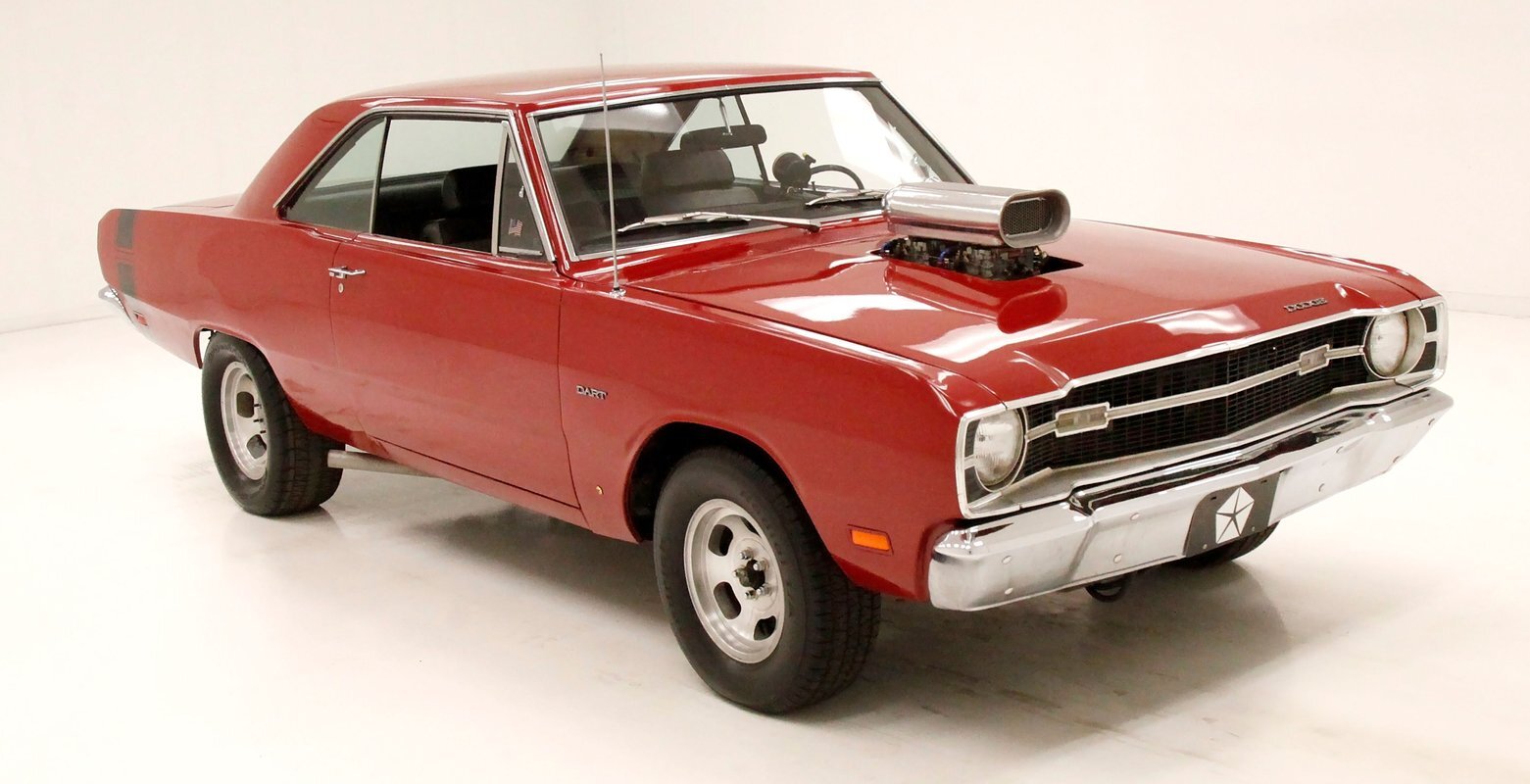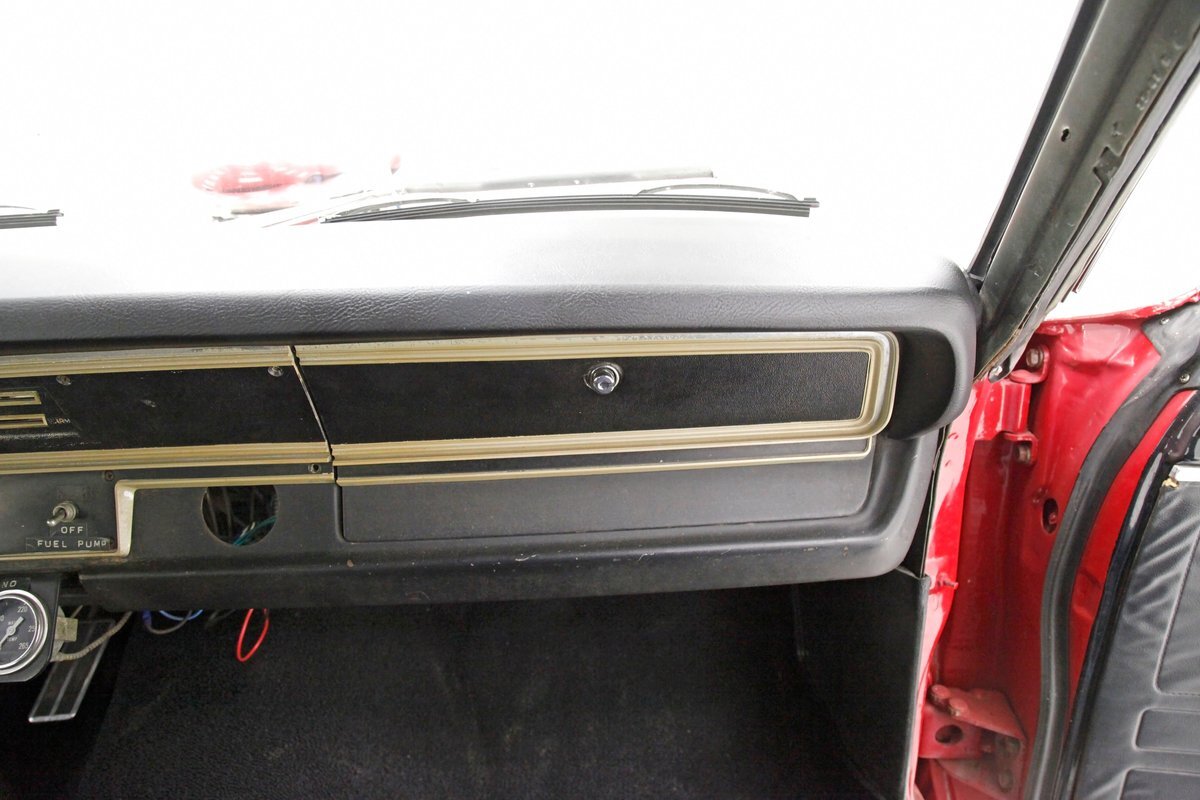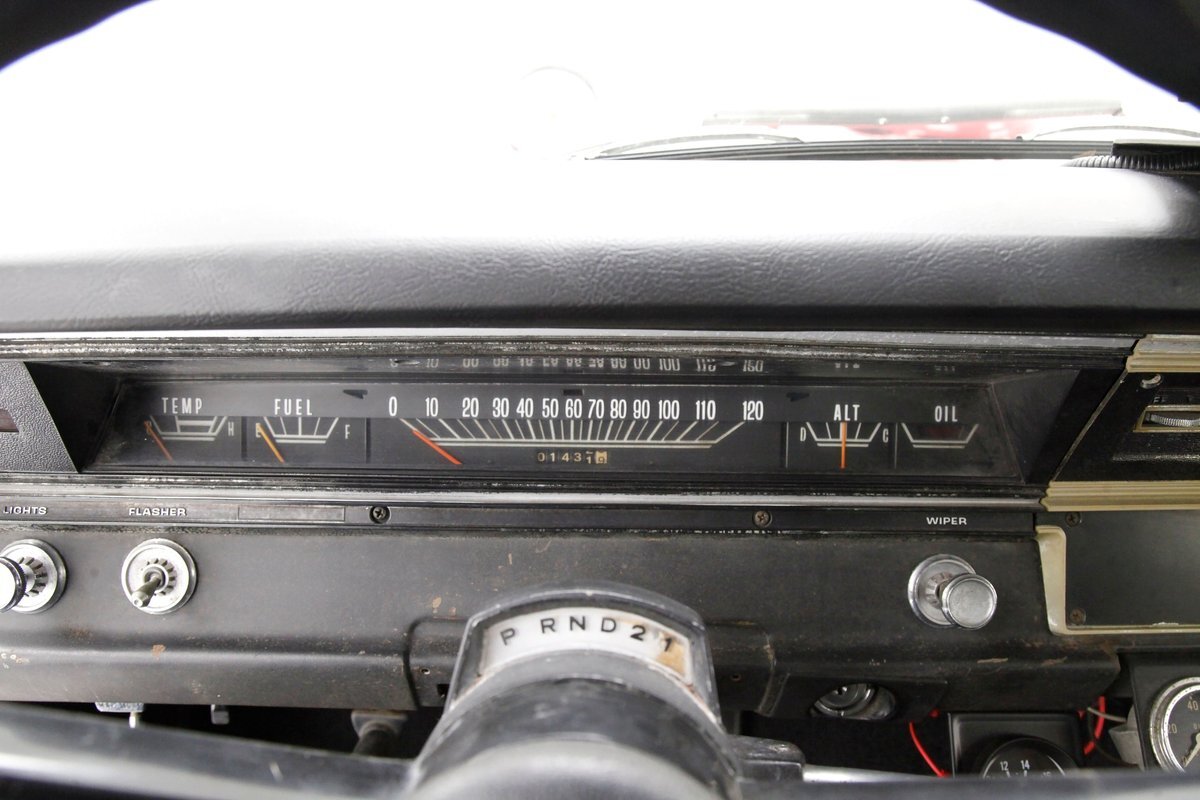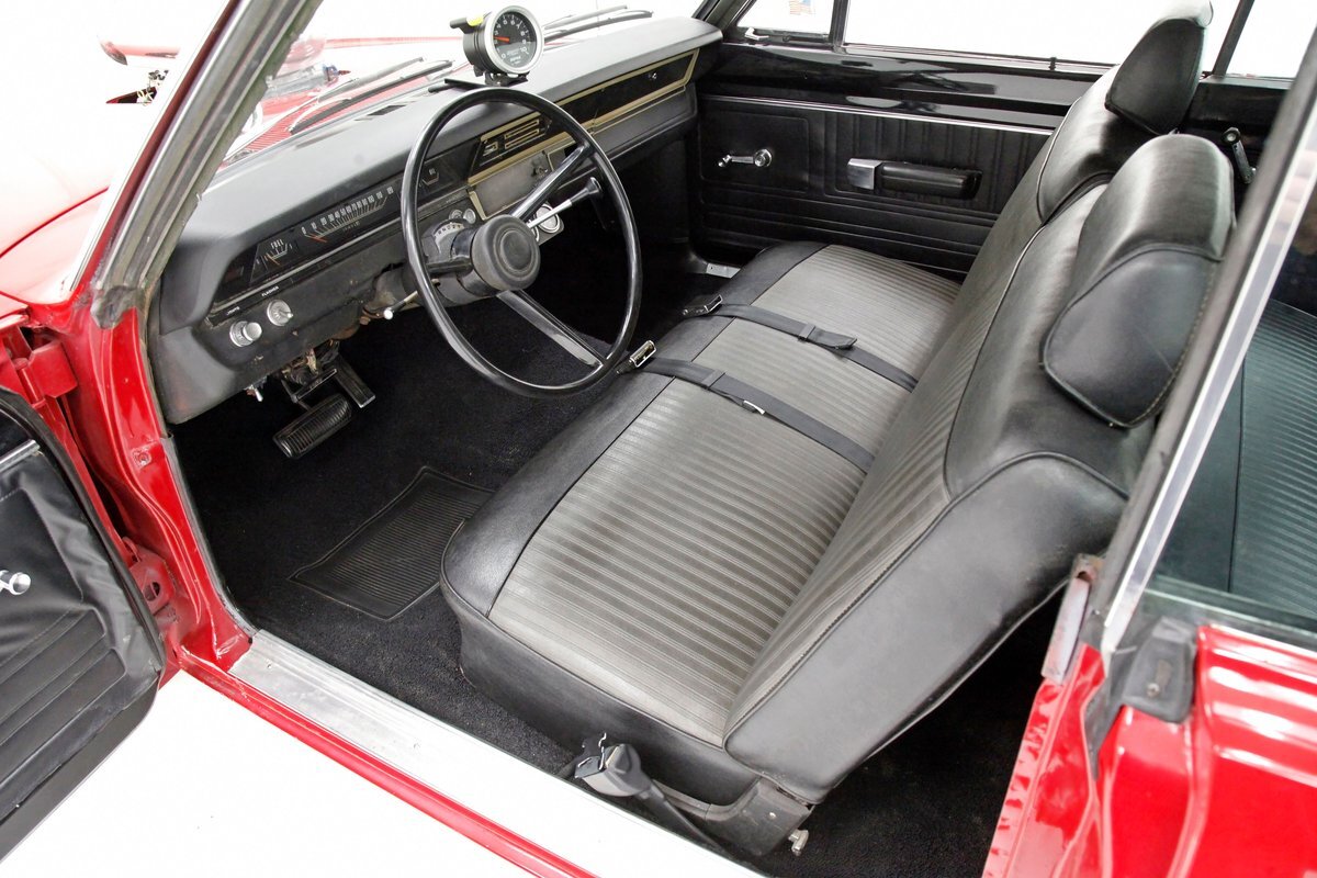 What is a respray of red covers the exterior of this car. It works in unison with newly chromed trimmings and bumpers. It has a cut out in the hood for the tunnel ram to be shown through its midsection. Factory tinted glass is on, the grille has been restored to original, and lines are straight as arrows. The original hood comes with the car as well, but will require a shipping expense from our consignor's house to you. On a slightly jacked back suspension we see a black wrap around stripe with a Swinger cut out that also sports DART on its top. Angled tail lighting is on the back just above another perfectly shiny rear bumper. Wheels are 14 and 15-inch respectively aluminum slots and are wrapped with 225/70R14's in front and 275/60R15's on back. Badging is all beautiful, as are handles and remaining brite work. An unscathed red metal top is present. Looking into the trunk you will be able to view the invasive rust free trunk floor along with a selection of exterior trim and the relocated battery.