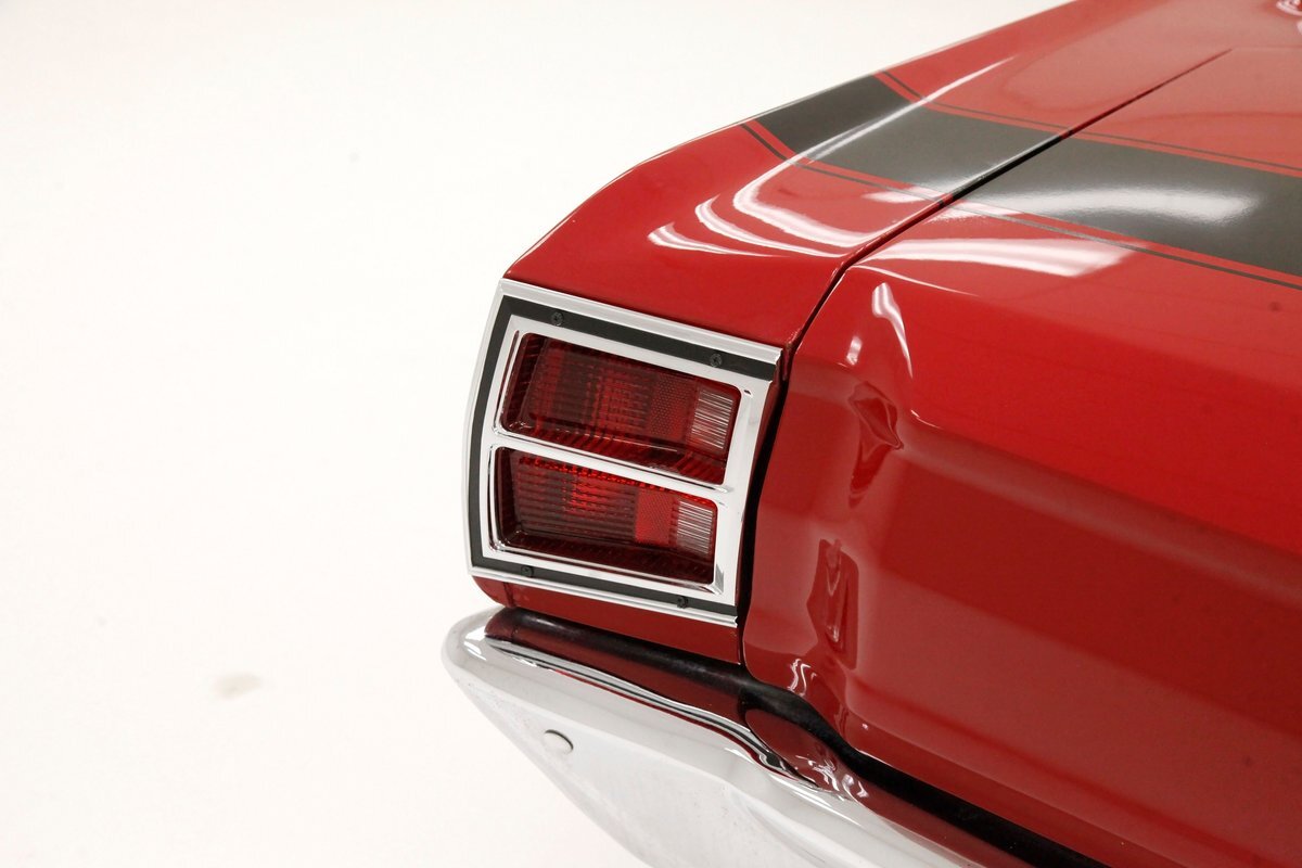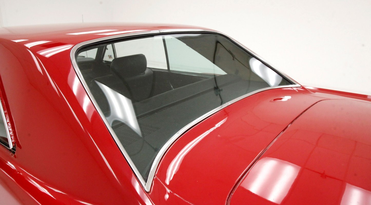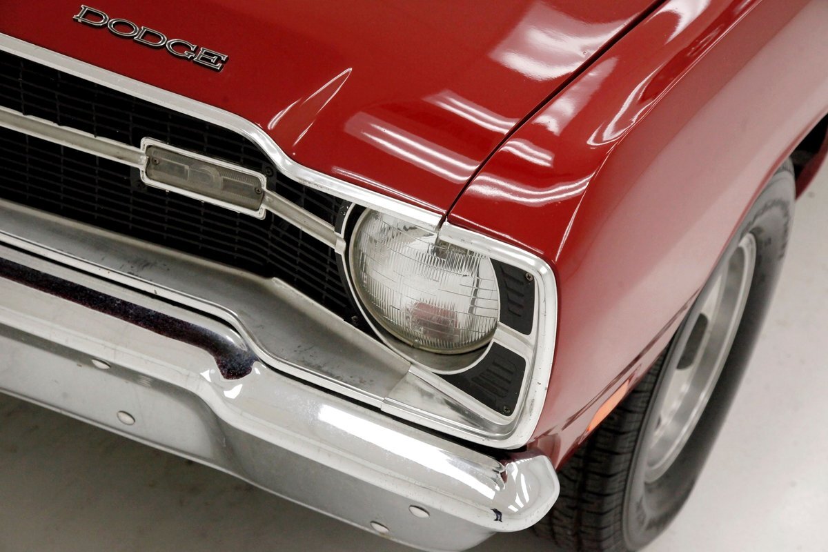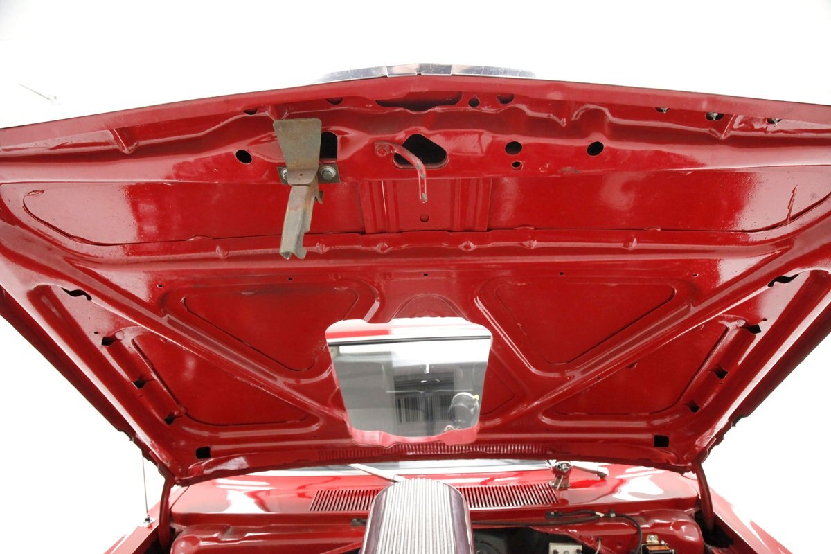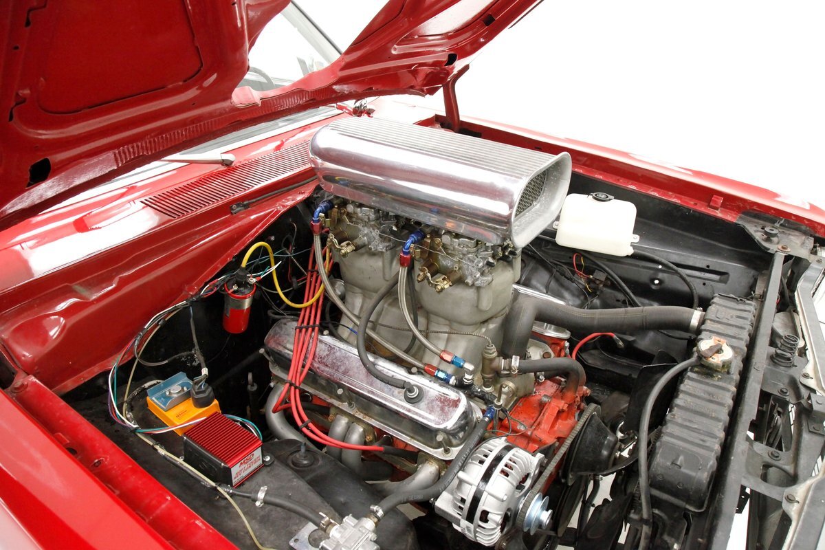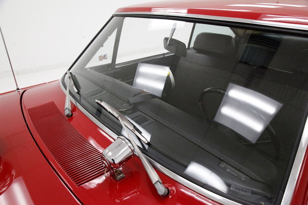 What is a respray of red covers the exterior of this car. It works in unison with newly chromed trimmings and bumpers. It has a cut out in the hood for the tunnel ram to be shown through its midsection. Factory tinted glass is on, the grille has been restored to original, and lines are straight as arrows. The original hood comes with the car as well, but will require a shipping expense from our consignor's house to you. On a slightly jacked back suspension we see a black wrap around stripe with a Swinger cut out that also sports DART on its top. Angled tail lighting is on the back just above another perfectly shiny rear bumper. Wheels are 14 and 15-inch respectively aluminum slots and are wrapped with 225/70R14's in front and 275/60R15's on back. Badging is all beautiful, as are handles and remaining brite work. An unscathed red metal top is present. Looking into the trunk you will be able to view the invasive rust free trunk floor along with a selection of exterior trim and the relocated battery.
