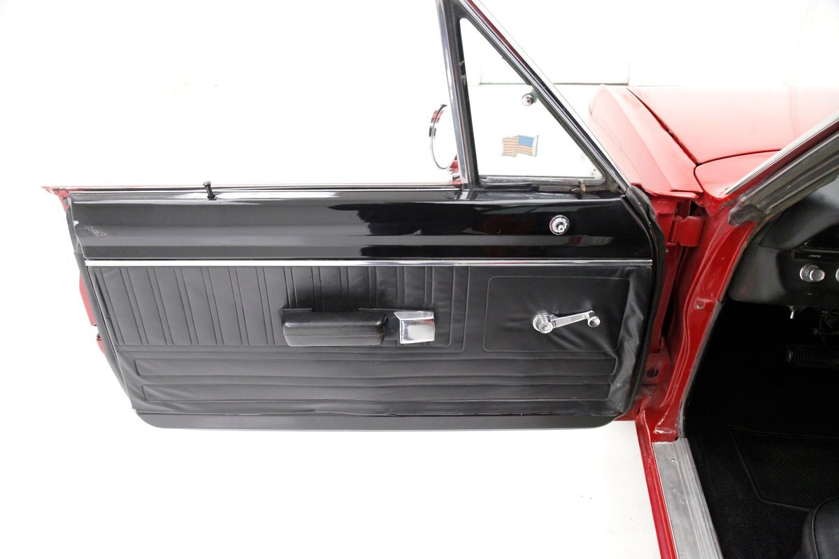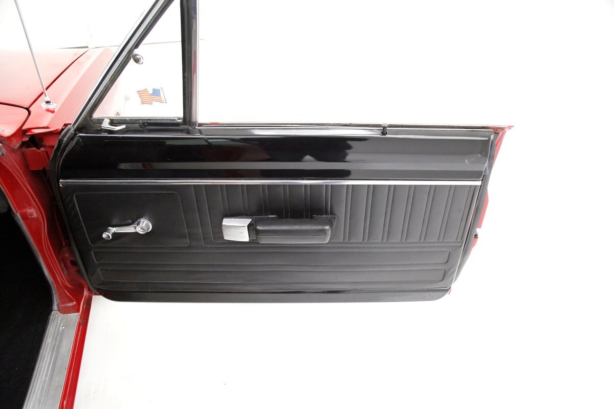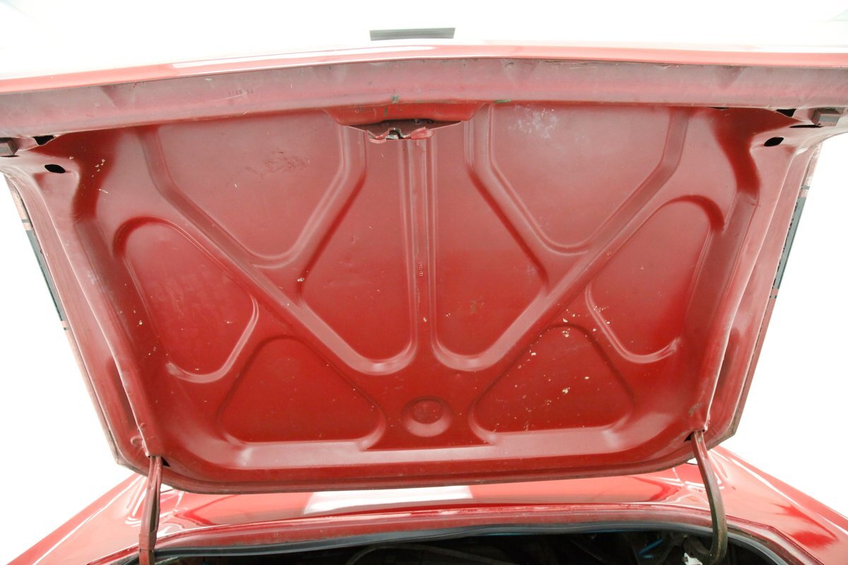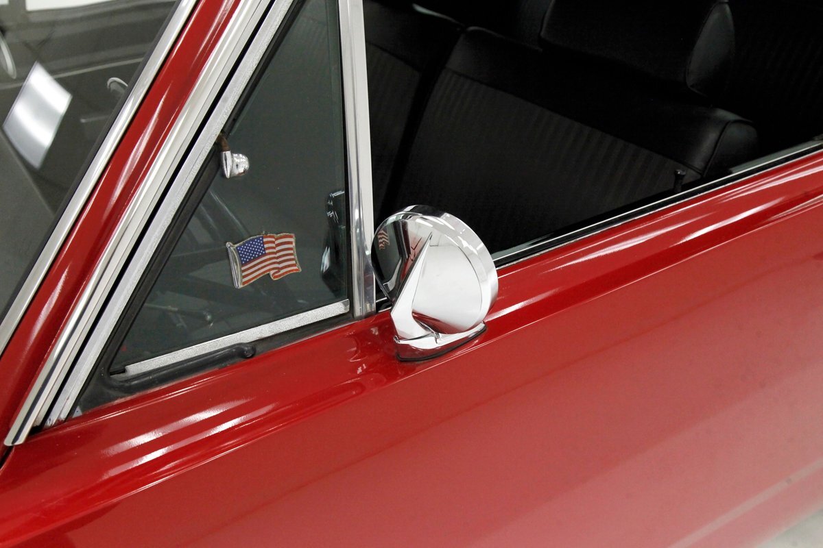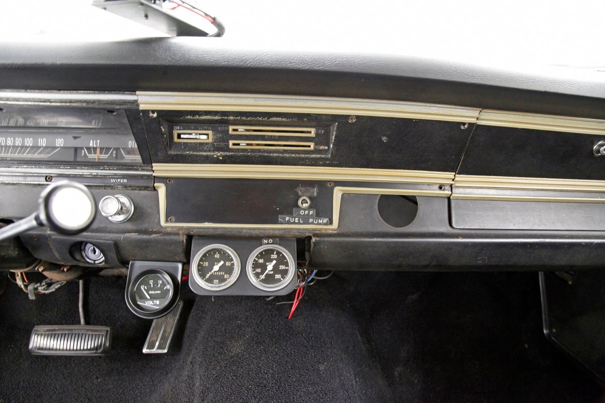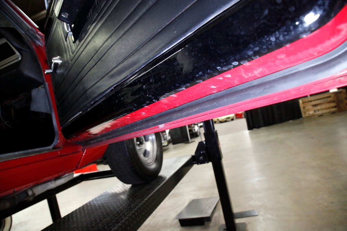 What is a respray of red covers the exterior of this car. It works in unison with newly chromed trimmings and bumpers. It has a cut out in the hood for the tunnel ram to be shown through its midsection. Factory tinted glass is on, the grille has been restored to original, and lines are straight as arrows. The original hood comes with the car as well, but will require a shipping expense from our consignor's house to you. On a slightly jacked back suspension we see a black wrap around stripe with a Swinger cut out that also sports DART on its top. Angled tail lighting is on the back just above another perfectly shiny rear bumper. Wheels are 14 and 15-inch respectively aluminum slots and are wrapped with 225/70R14's in front and 275/60R15's on back. Badging is all beautiful, as are handles and remaining brite work. An unscathed red metal top is present. Looking into the trunk you will be able to view the invasive rust free trunk floor along with a selection of exterior trim and the relocated battery.