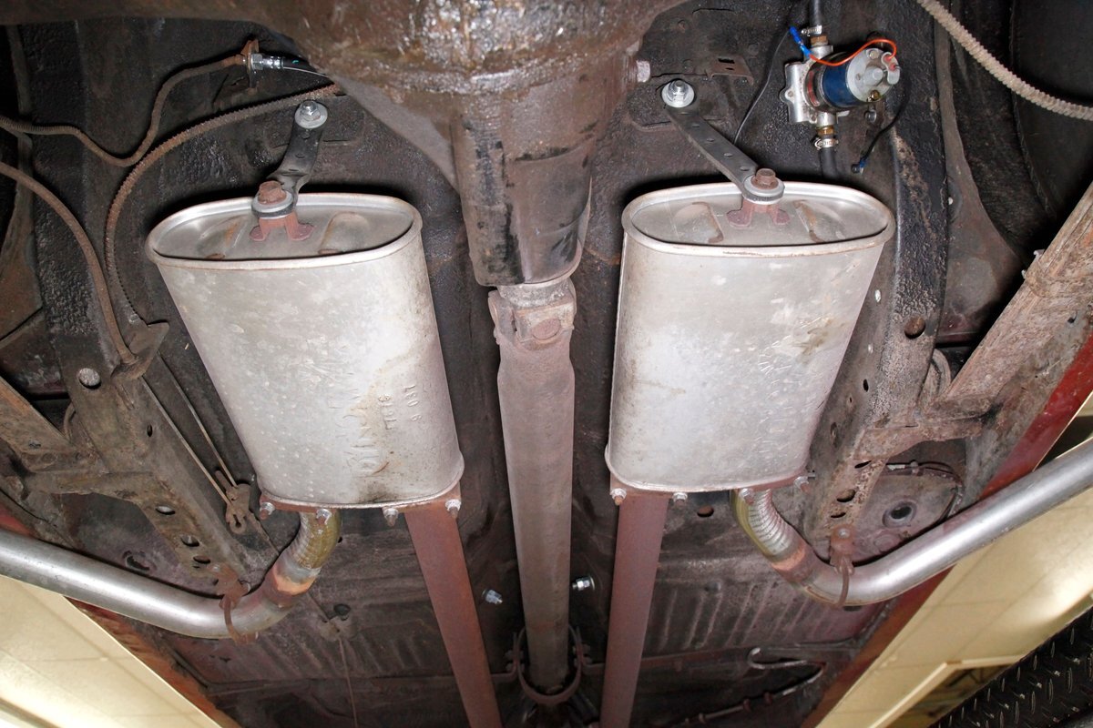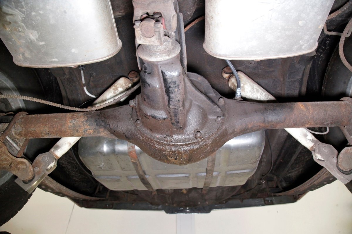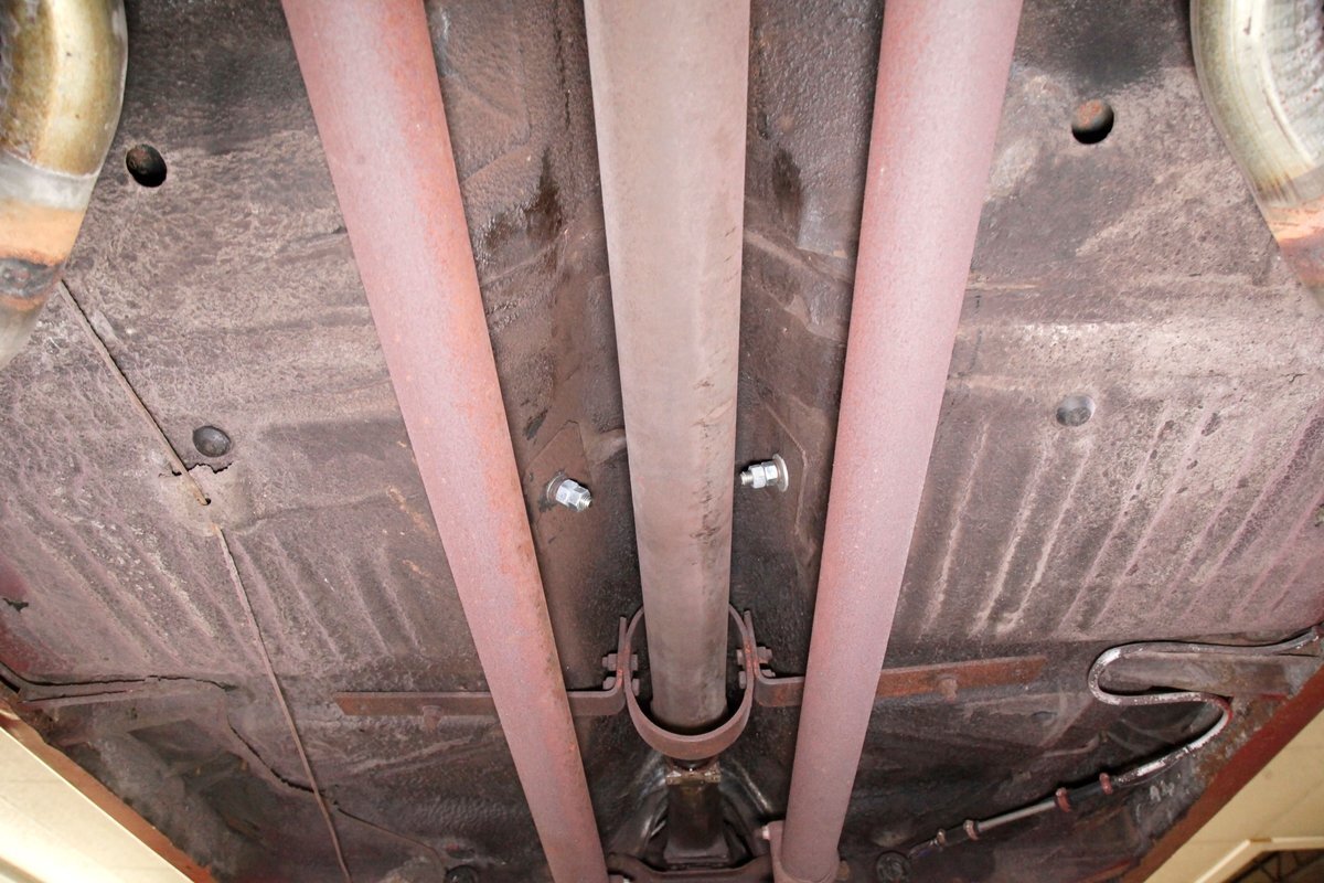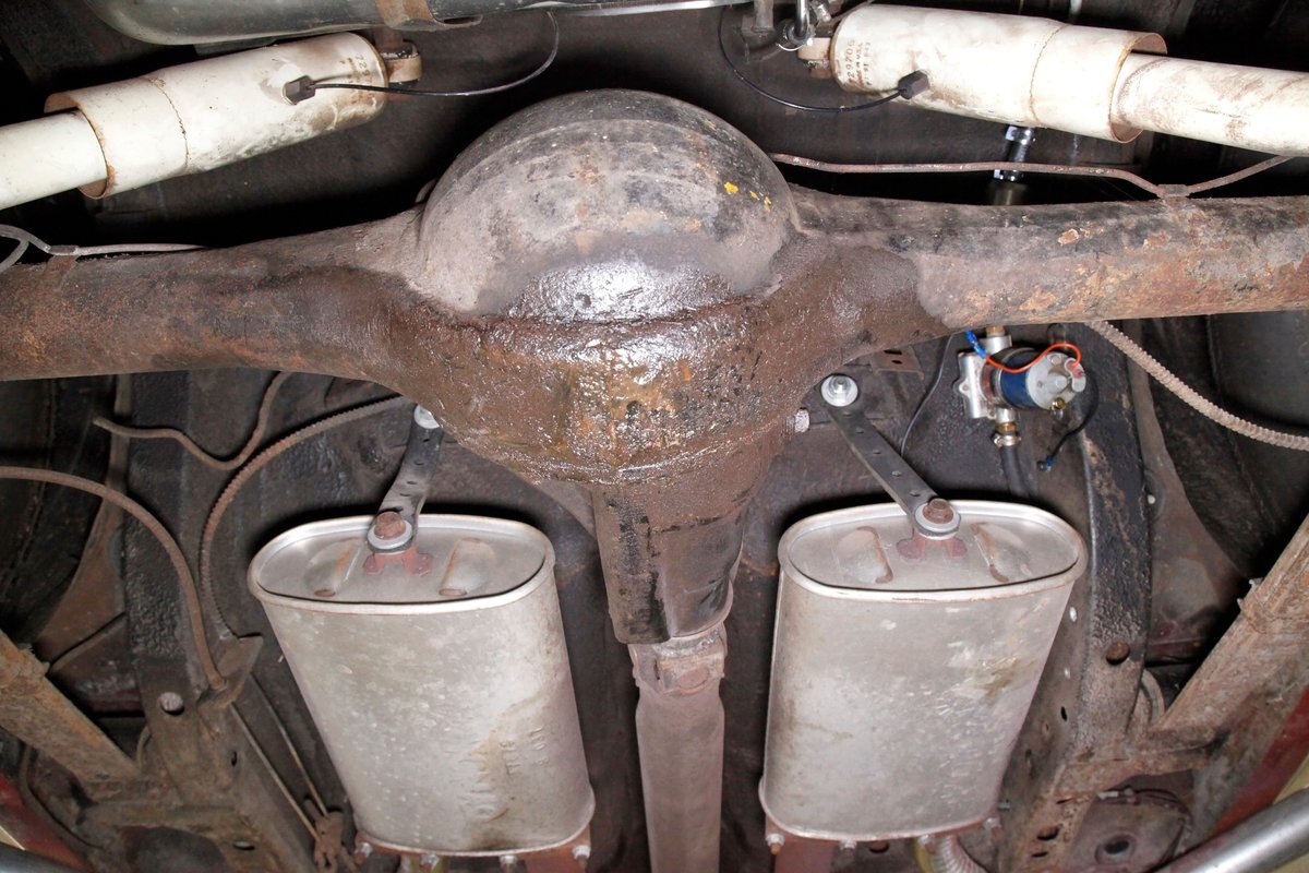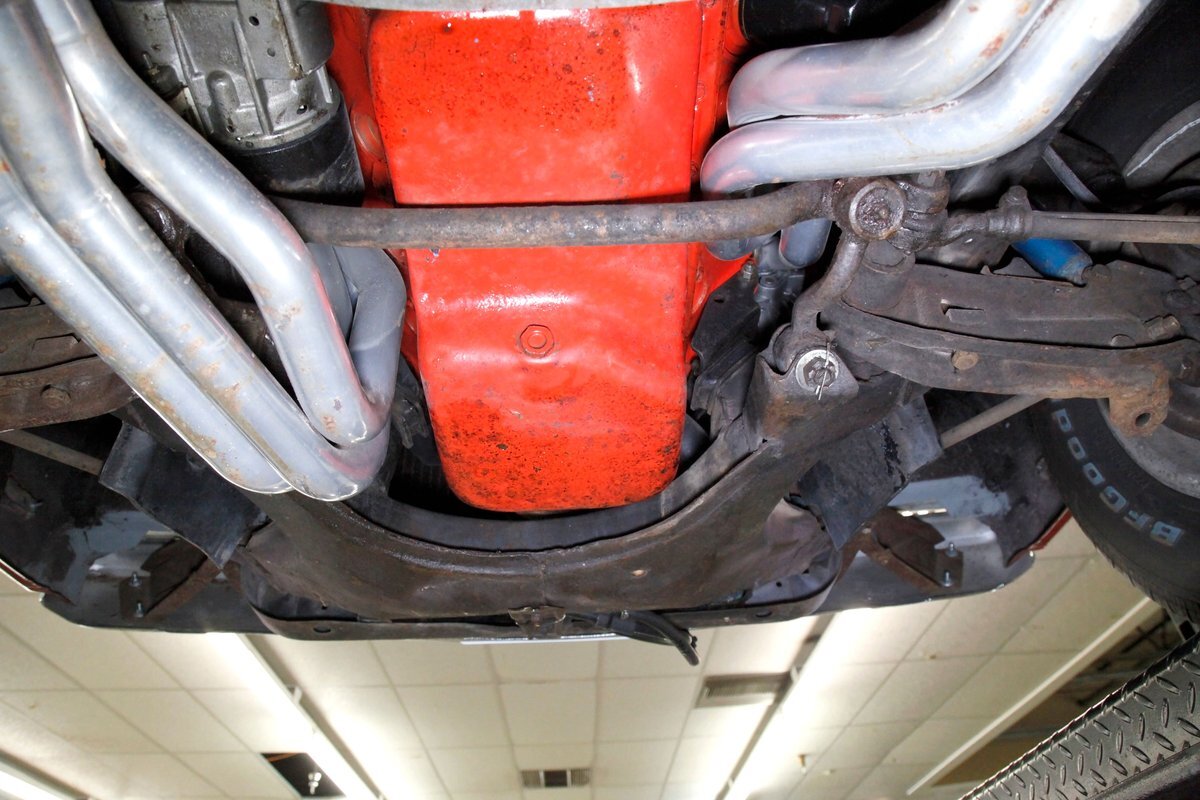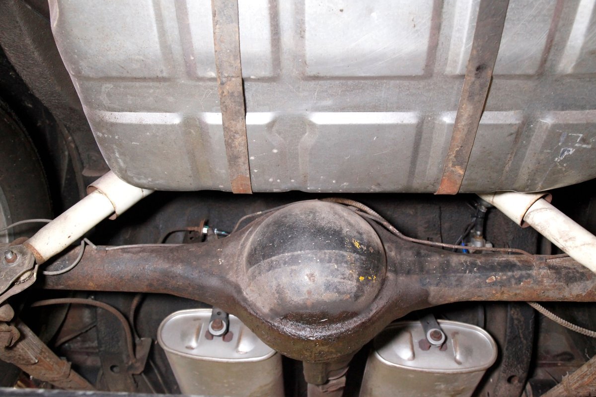 Not unlike the topside, some major work has been performed here as well. Including the rear wells being widened to accommodate the wider tires, A new fuel tank with a 1/2 inch pickup is in back, and the battery has been moved to the rear trunk and has a shutoff. All new suspension bushings are in and all new drum brakes front to back with new lines, shoes, wheel cylinders and a new master cylinder have been installed. Super Stock rear leaf springs are on in the back in up front in an independent suspension with torsion bars. All is looking rust free and very sound to handle the power from the 8 pack above.