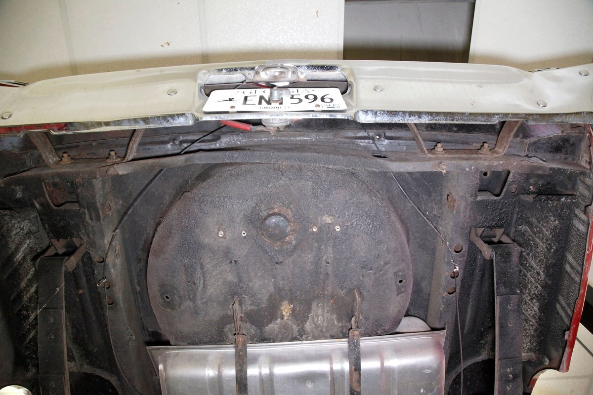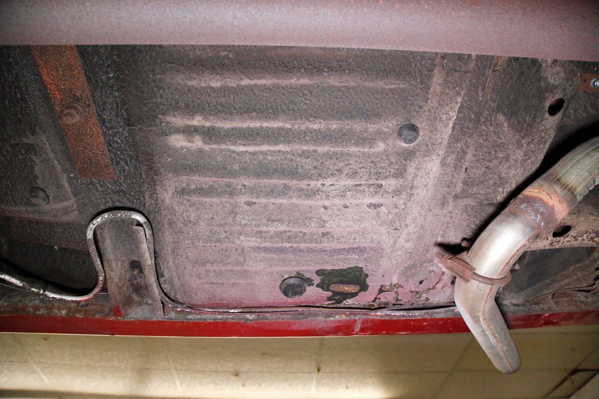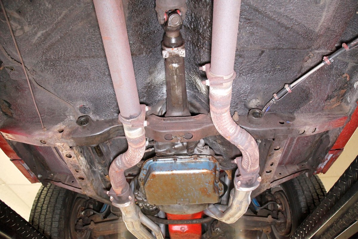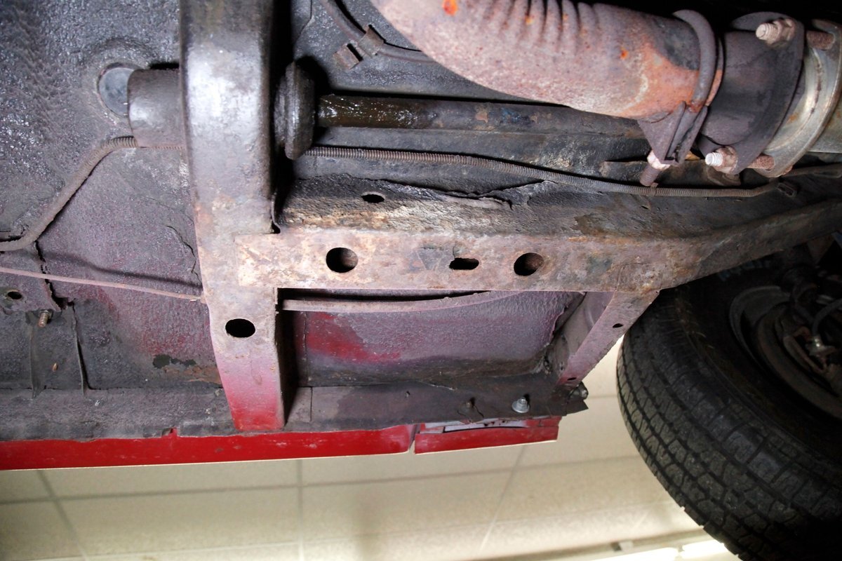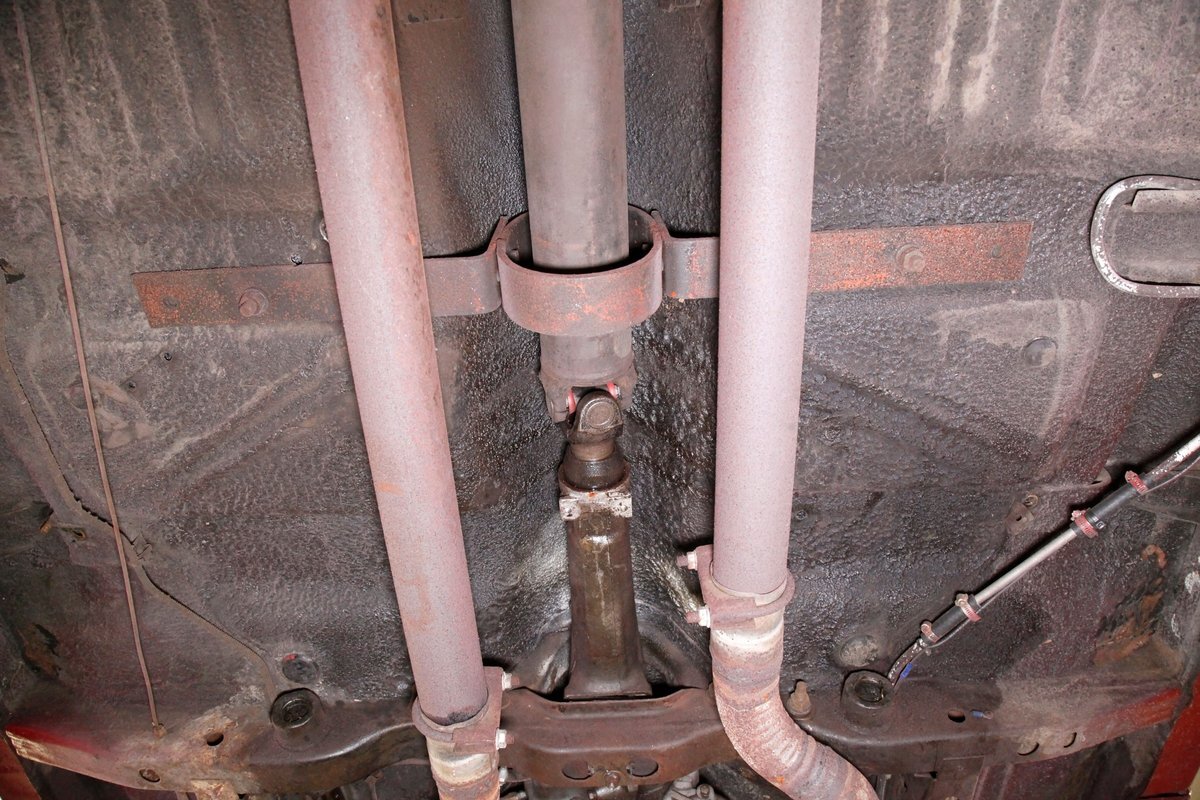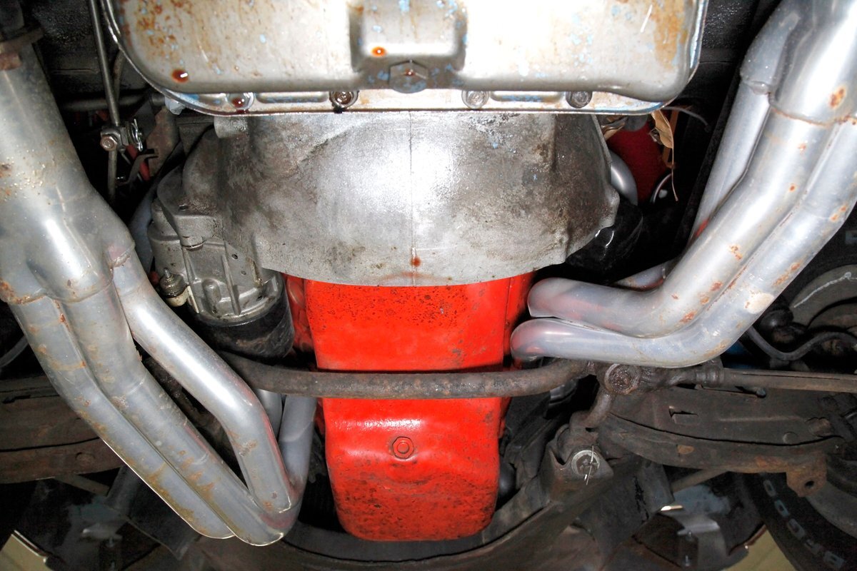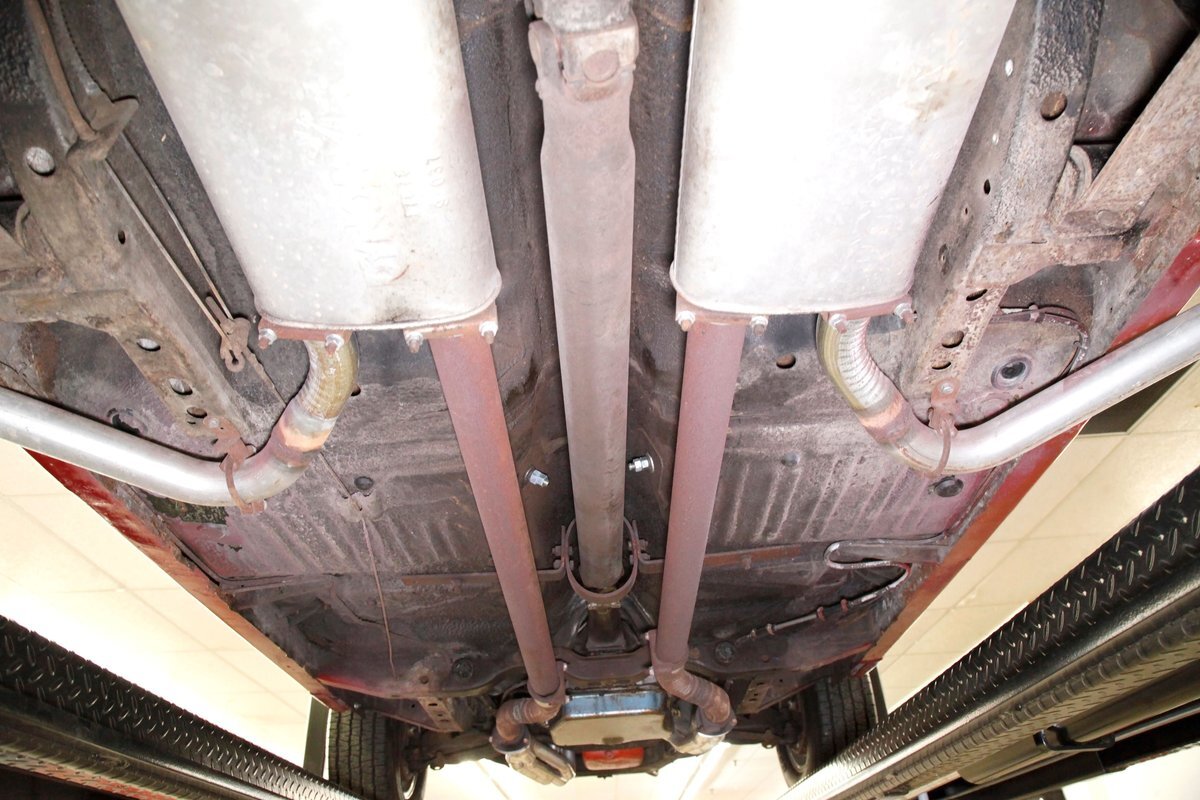 Not unlike the topside, some major work has been performed here as well. Including the rear wells being widened to accommodate the wider tires, A new fuel tank with a 1/2 inch pickup is in back, and the battery has been moved to the rear trunk and has a shutoff. All new suspension bushings are in and all new drum brakes front to back with new lines, shoes, wheel cylinders and a new master cylinder have been installed. Super Stock rear leaf springs are on in the back in up front in an independent suspension with torsion bars. All is looking rust free and very sound to handle the power from the 8 pack above.