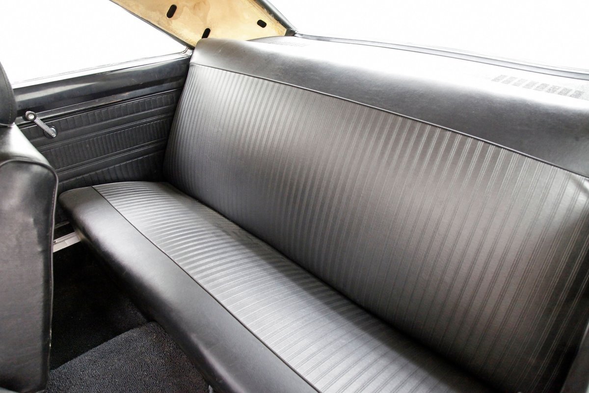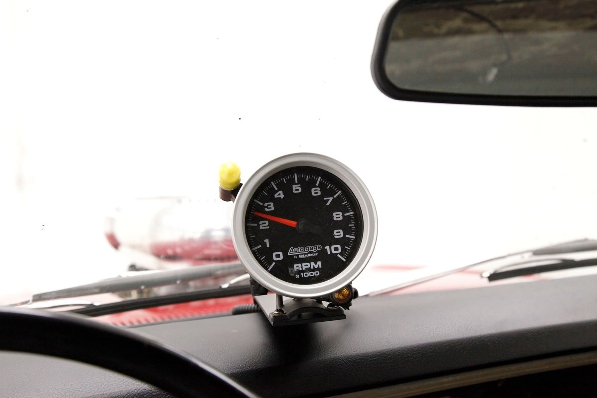 Gone is the drag interior now replaced by OEM benches in black vinyl with some textured faux tuck and roll inserts and smooth bolsters. The rear bench matches is also new and is pristine. The dash is new and looks fab, and instrumentation is all very clean and factory looking. On top of the dash a tachometer and shift light sits proudly harkening back to this car's racing past. The door panels are like new and the driver's door shows slight waves in the mid panel near the hinge. Black carpeting is new, and above and a black headliner is also new and included is a box with gaskets for glass awaiting its installation. We also note the mechanical fuel pressure gauge sitting just outside the windshield in clear view of the driver.